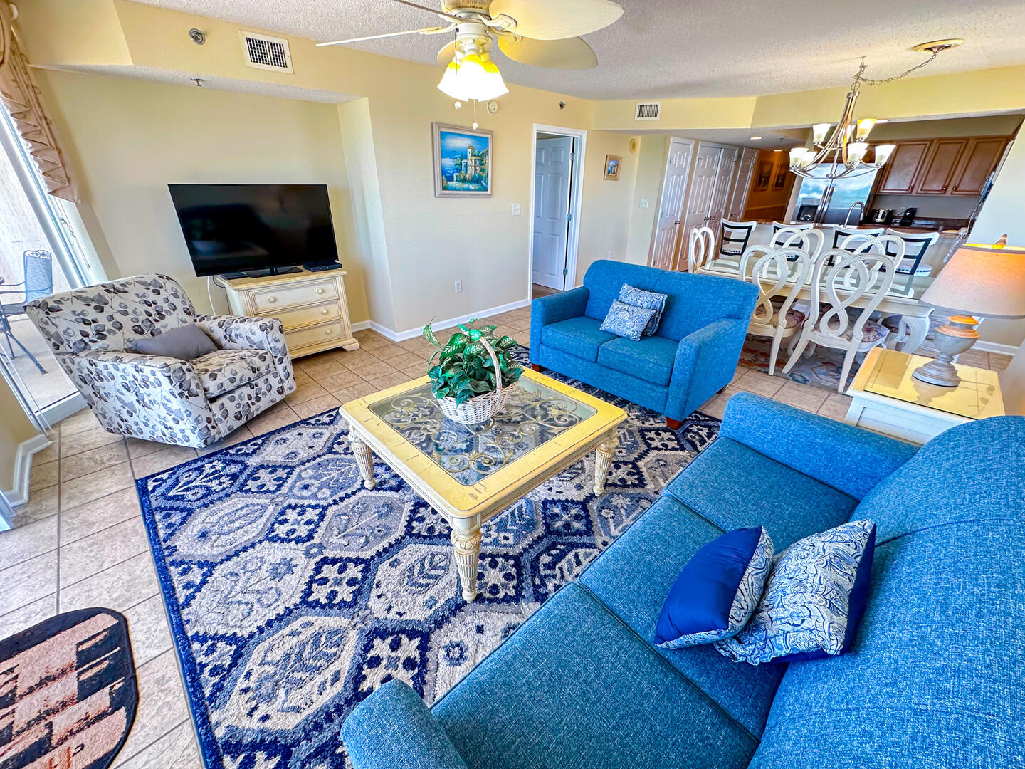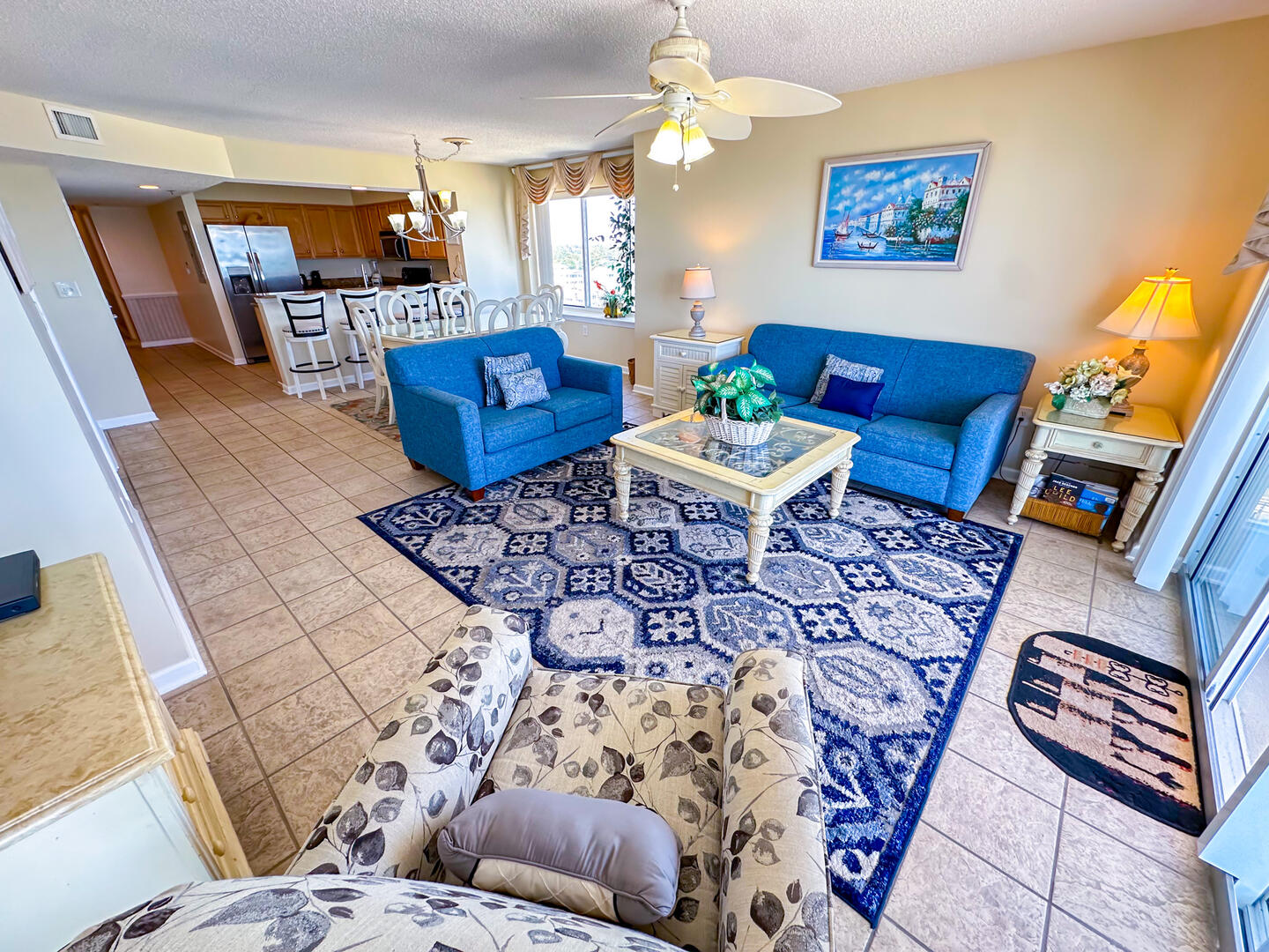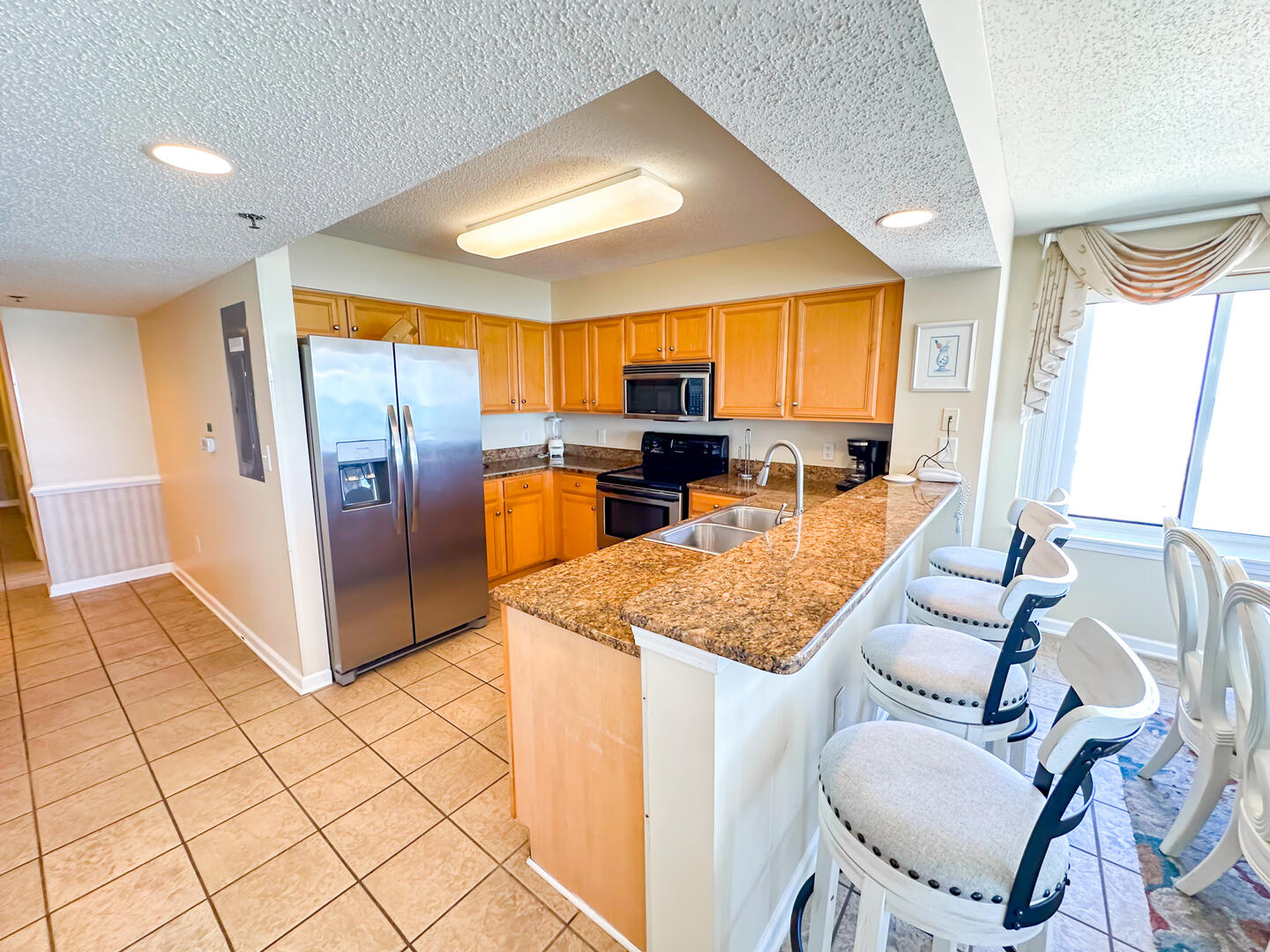 Enjoy your mornings on the expansive 26-foot private balcony—accessible from both the living room and master suite—where you can sip coffee while watching the sunrise over the Atlantic. Inside, the open-concept living area offers a flat-screen TV, ceiling fan, and complimentary high-speed Wi-Fi, making it the perfect place to unwind after a day in the sun. The fully equipped kitchen features granite countertops, a microwave, and everything you need for preparing meals at home, plus a full-size washer and dryer for added convenience.