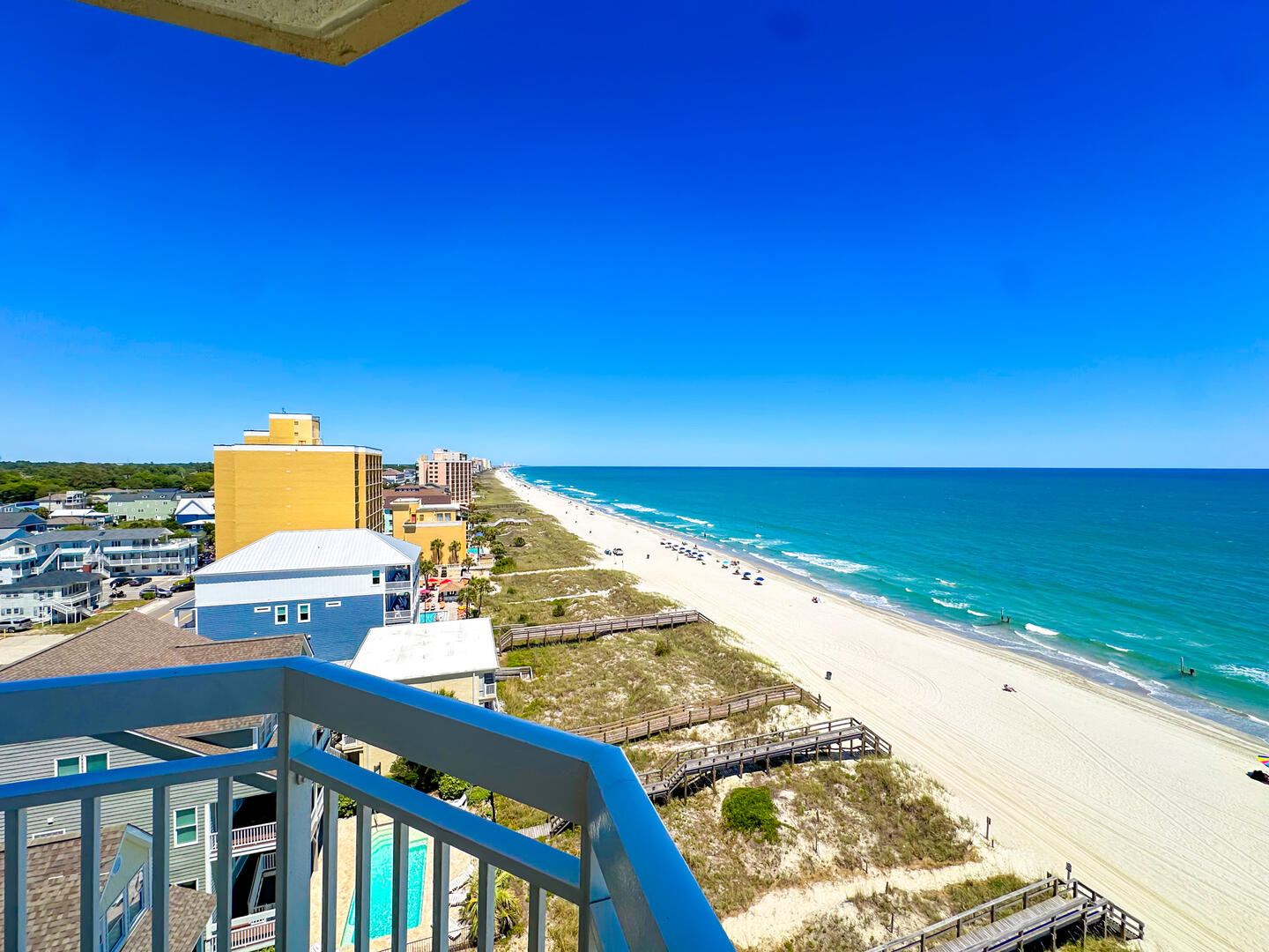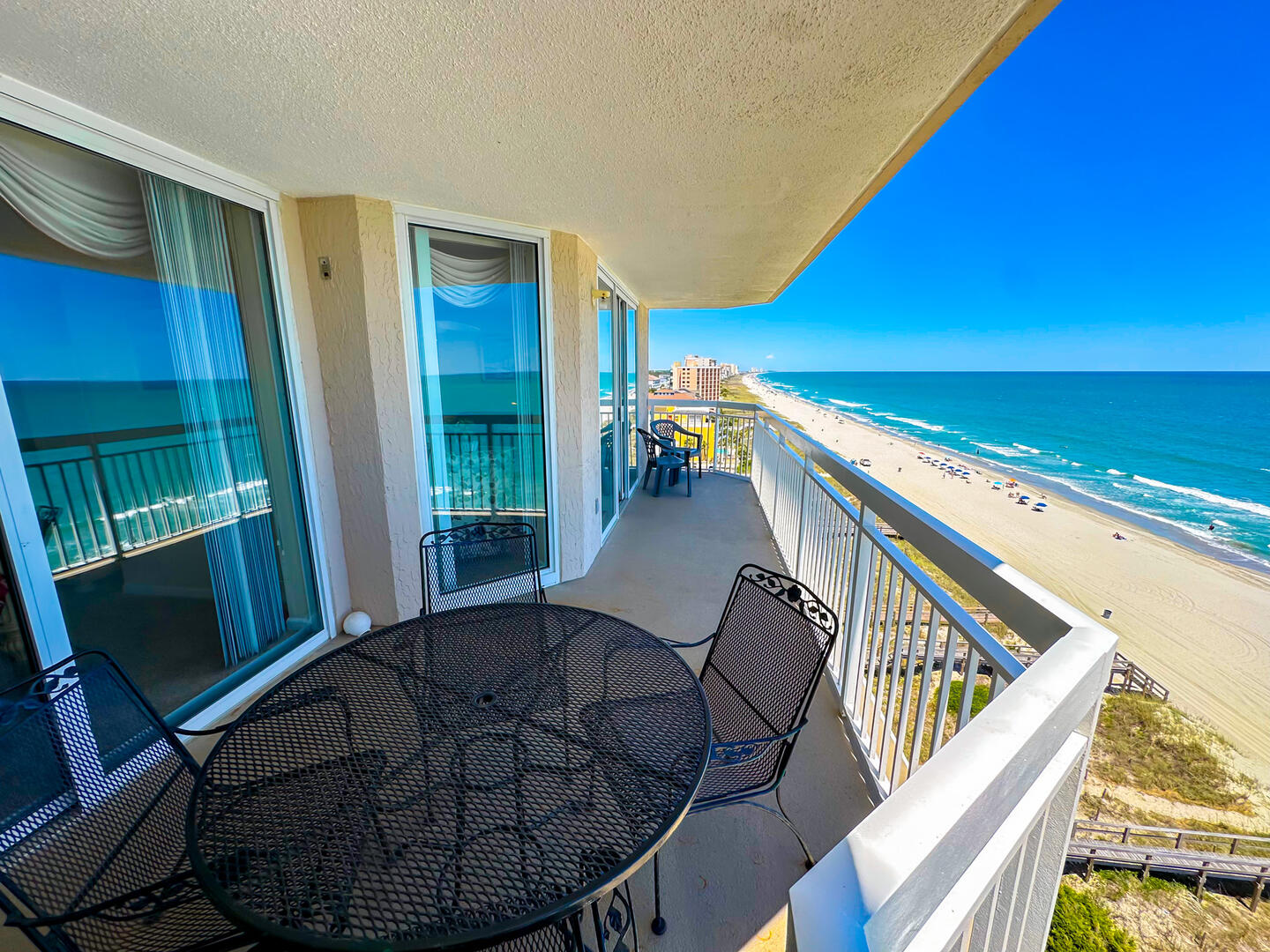 Oceanfront 4BR condo at Crescent Shores 901 with panoramic views, 26' balcony, full kitchen, and resort amenities including lazy river, pools, hot tubs, and direct beach access.