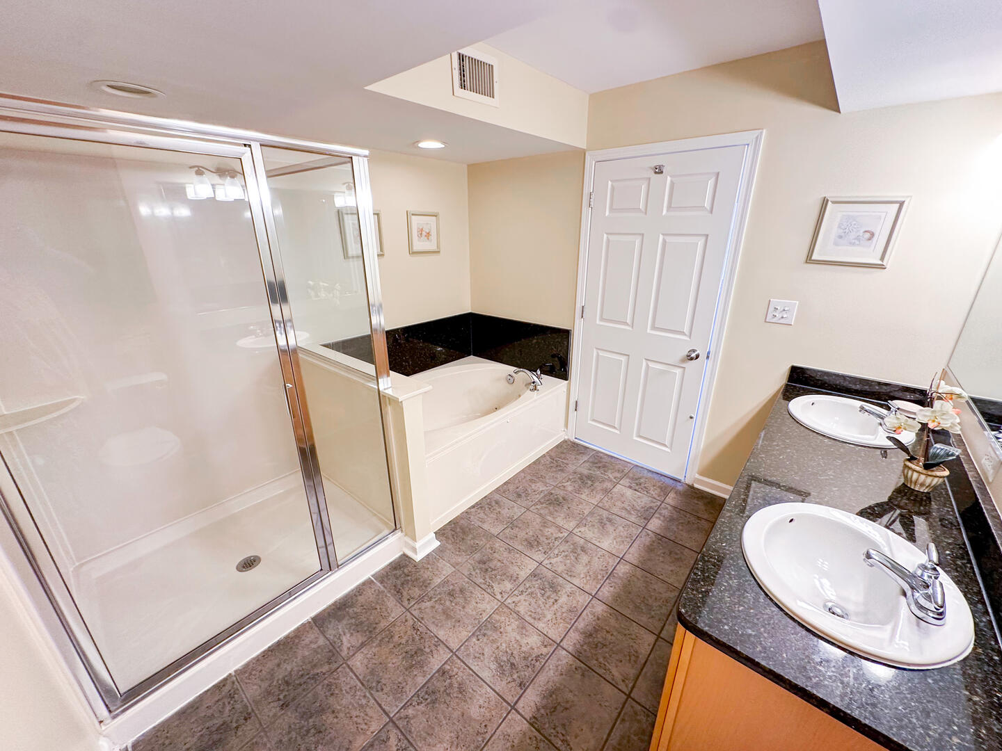 • Master Suite: King bed + Smart TV + balcony access + ensuite bathroom with double vanities, whirlpool tub, and separate shower