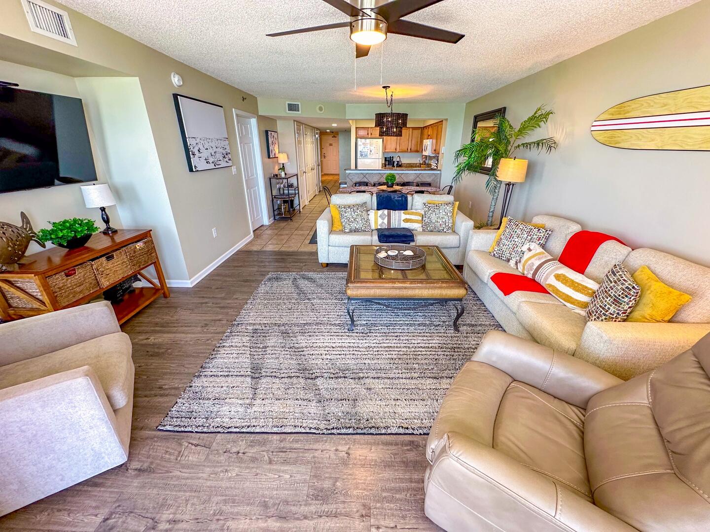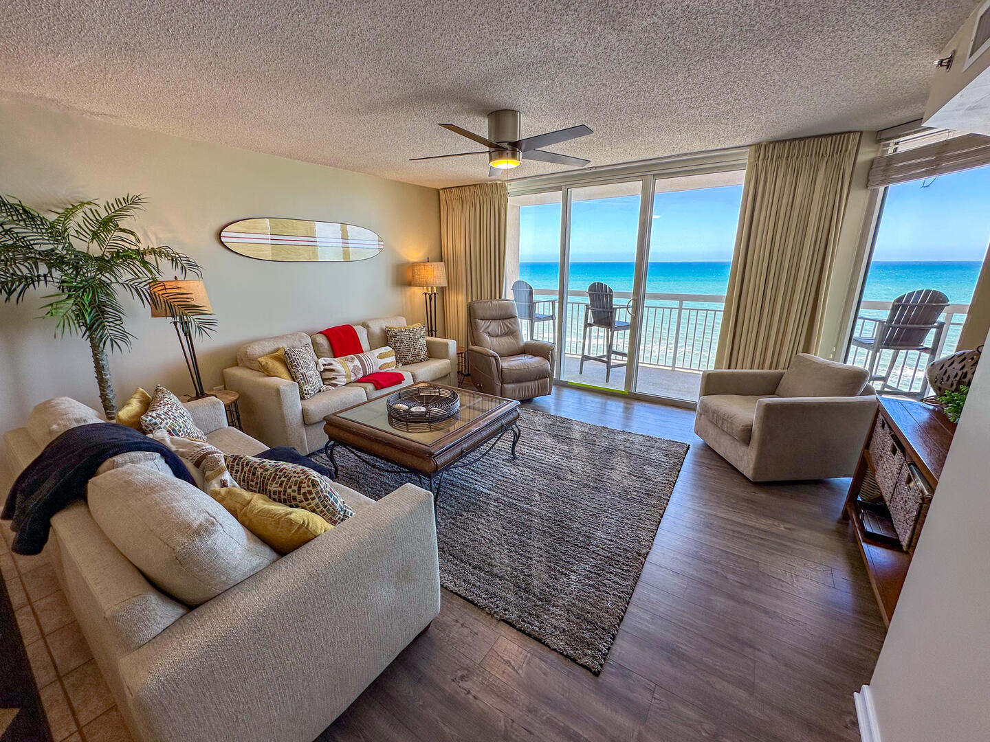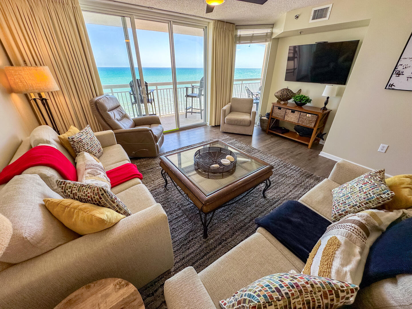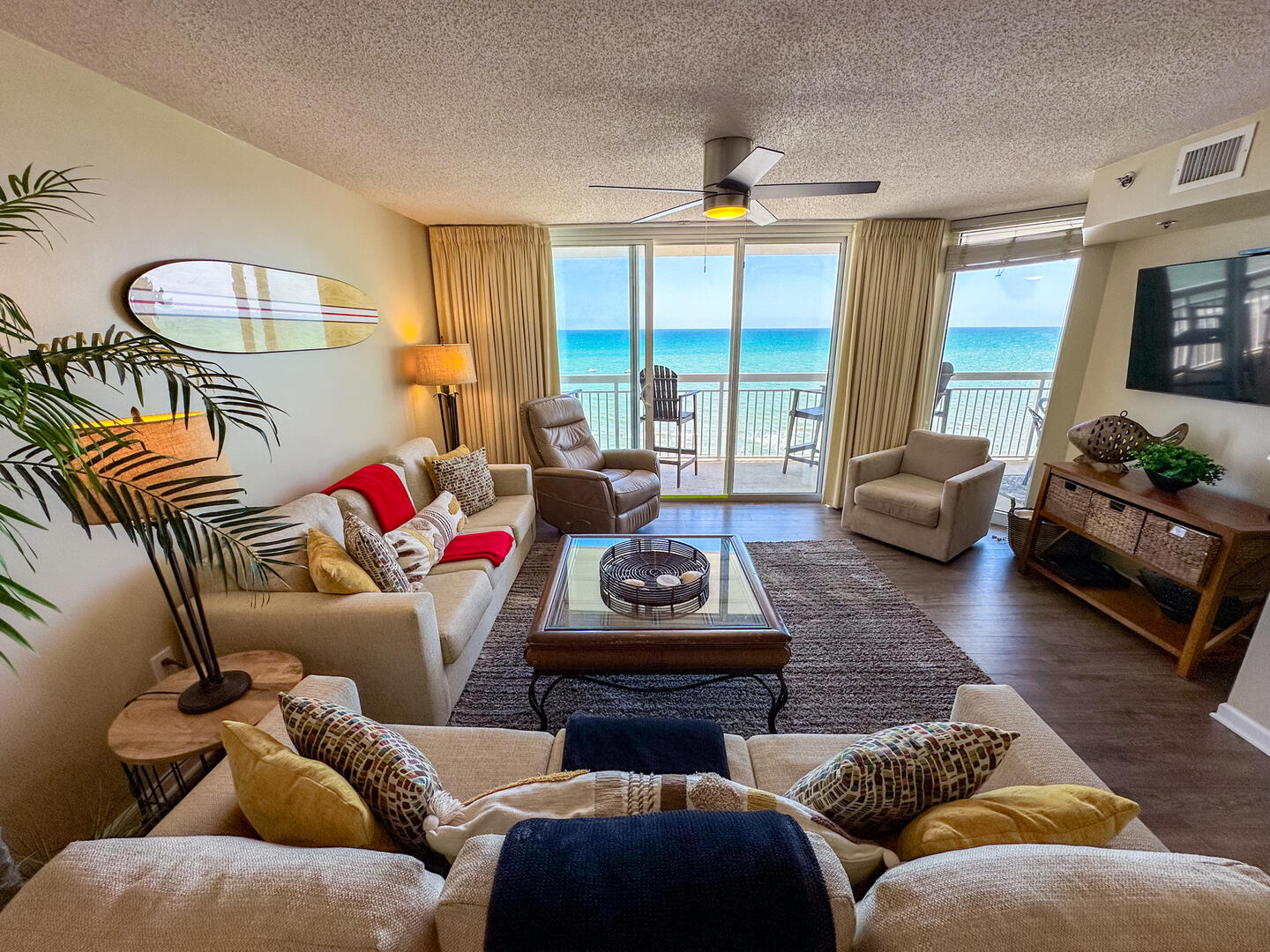 Relax in the expansive living area featuring a flat-screen TV, stylish furnishings, and complimentary high-speed Wi-Fi—ideal for unwinding after a day on the sand. Step out onto the 26-foot private balcony, accessible from both the living room and master suite, and enjoy panoramic views of the Atlantic while sipping morning coffee or evening cocktails.