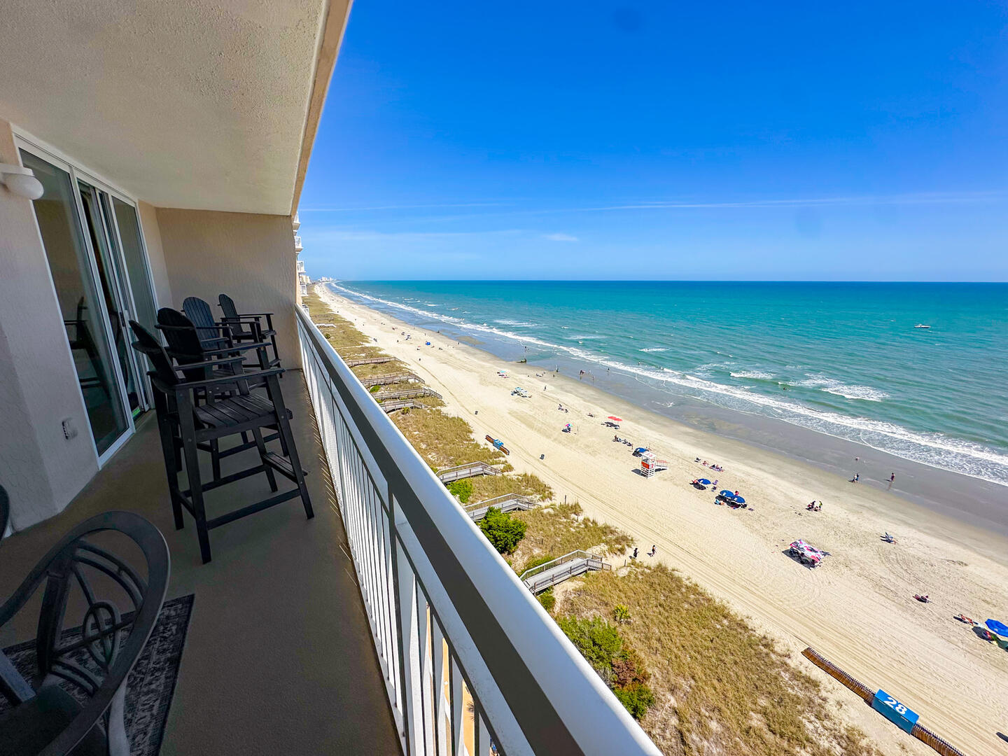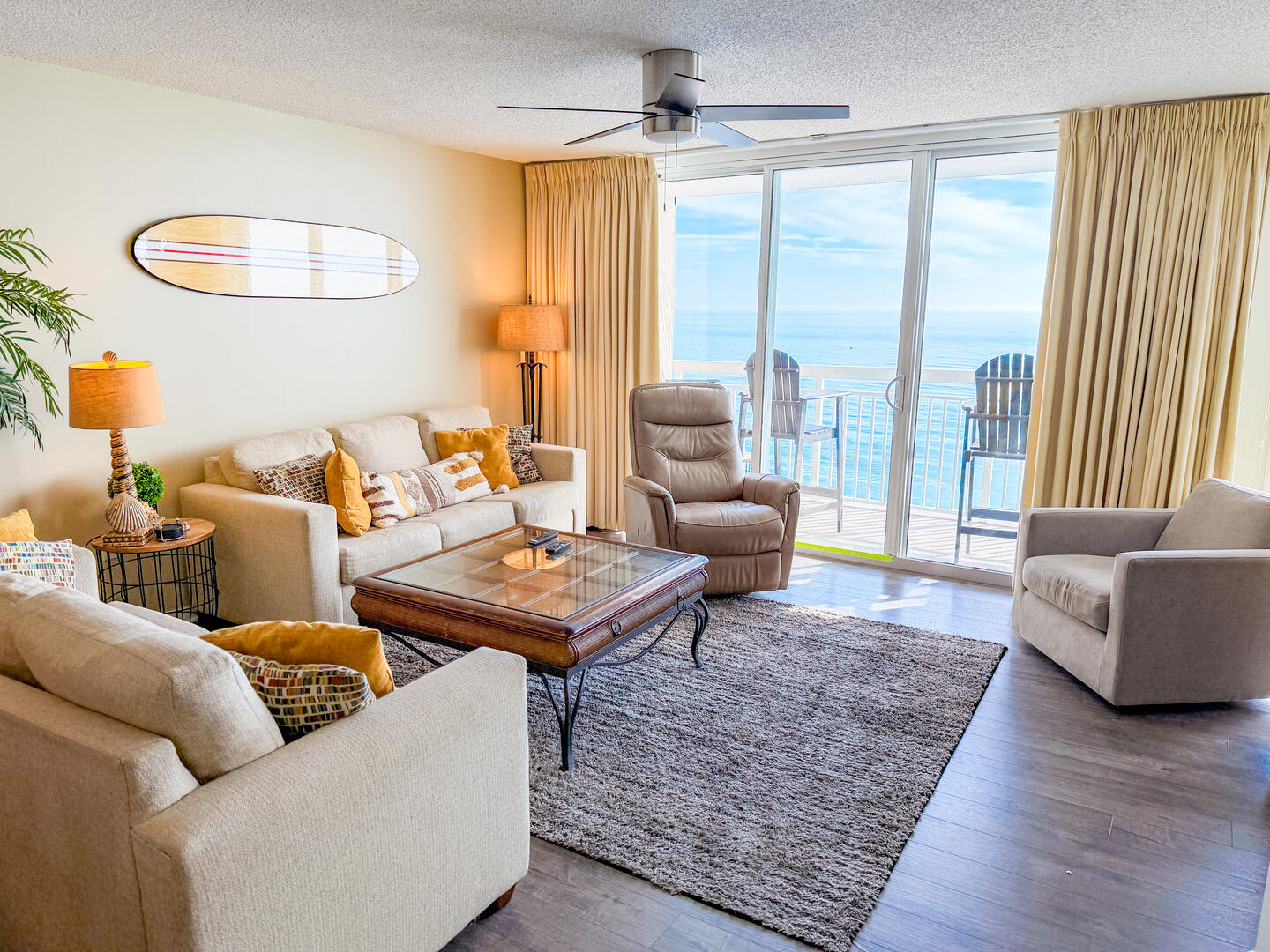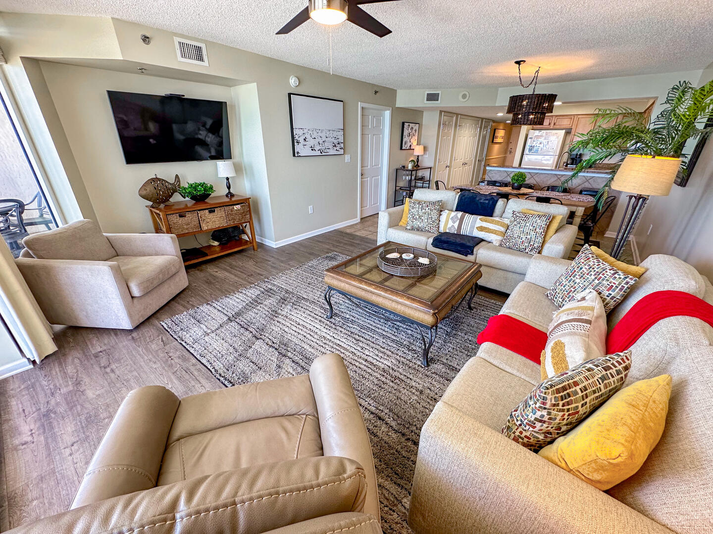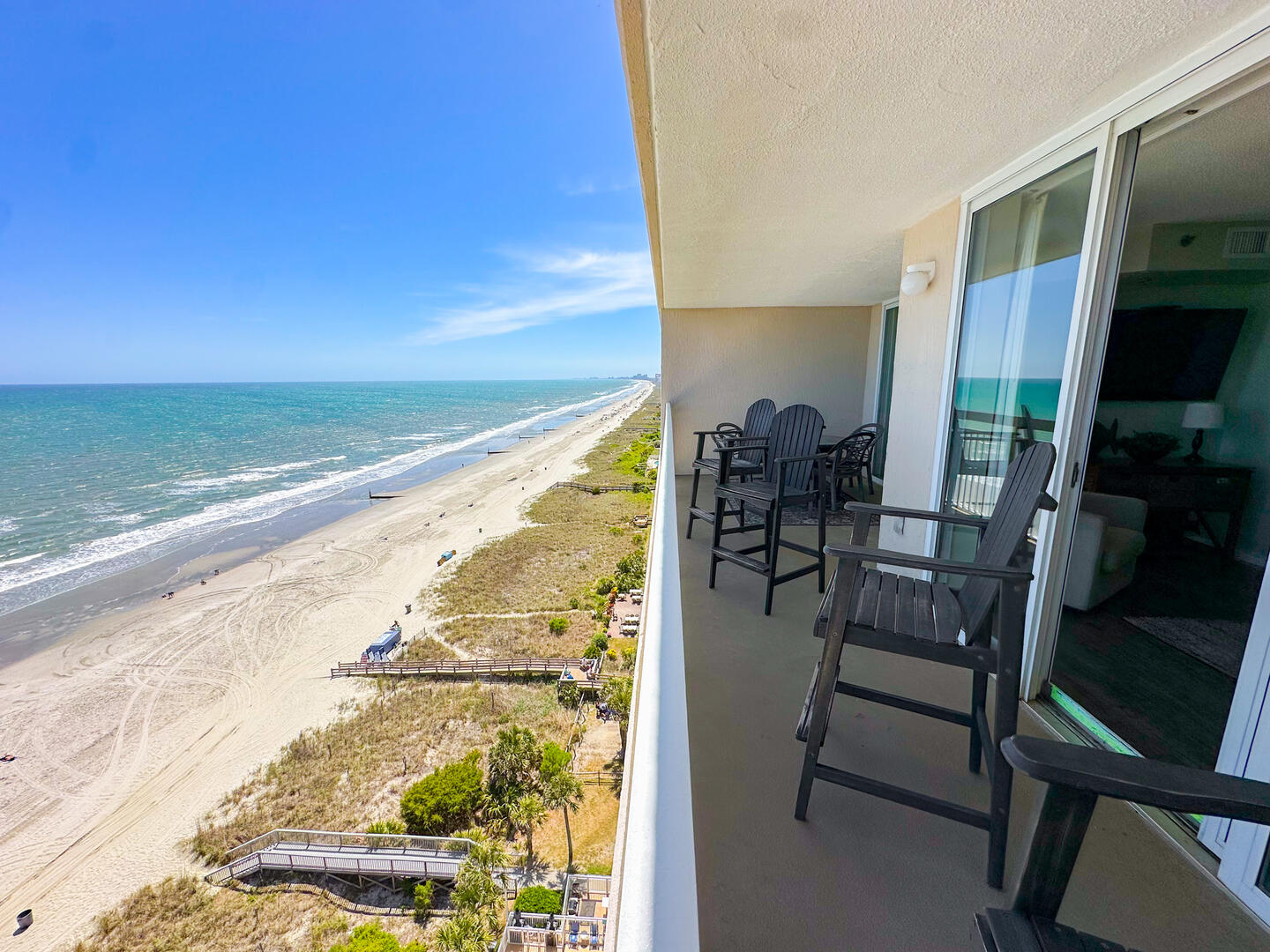Relax in the expansive living area featuring a flat-screen TV, stylish furnishings, and complimentary high-speed Wi-Fi—ideal for unwinding after a day on the sand. Step out onto the 26-foot private balcony, accessible from both the living room and master suite, and enjoy panoramic views of the Atlantic while sipping morning coffee or evening cocktails.
