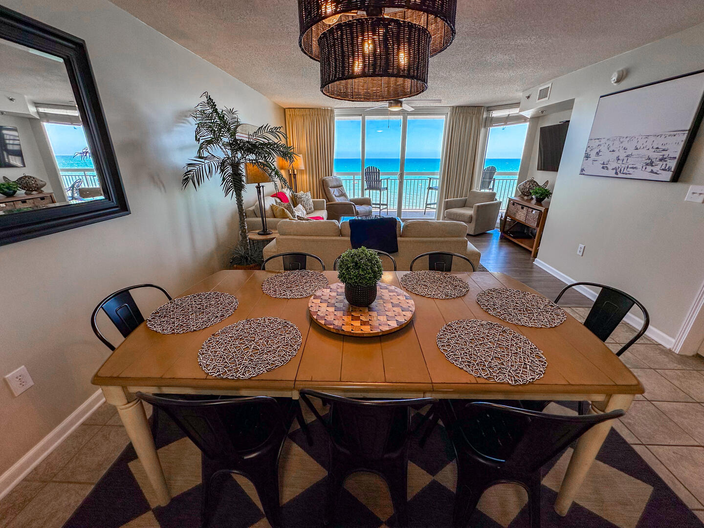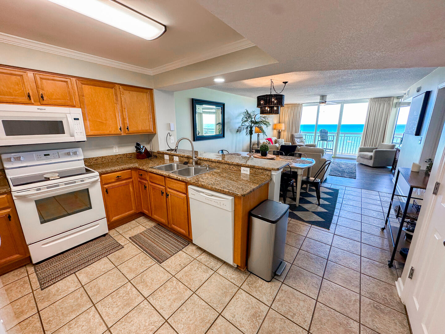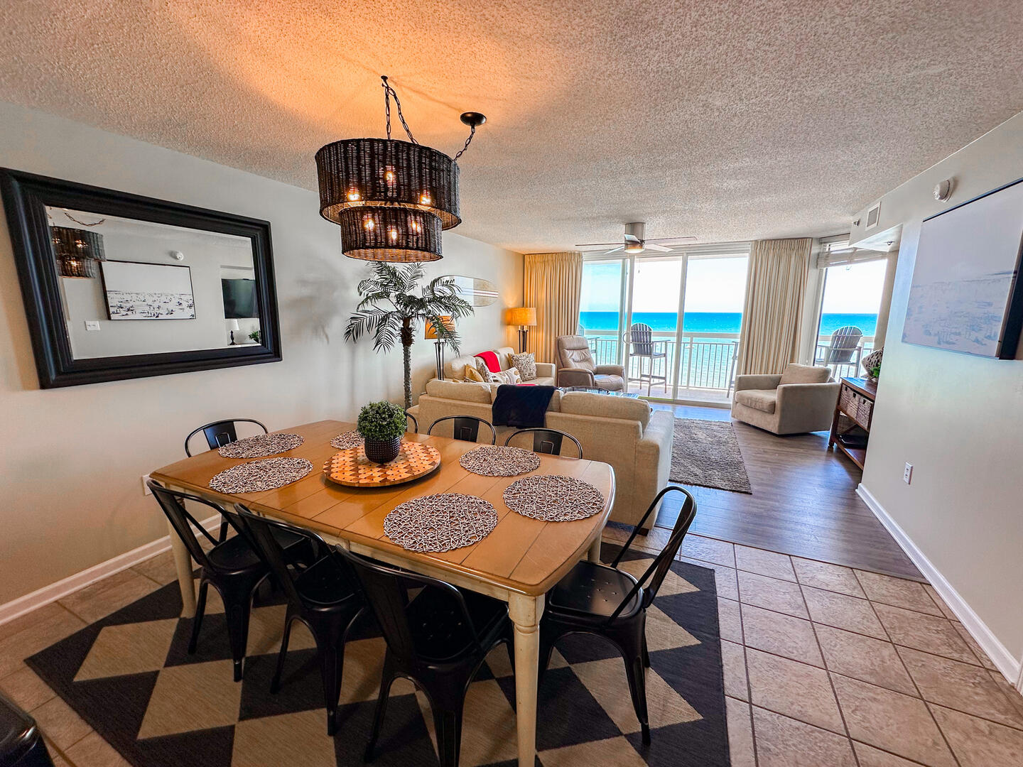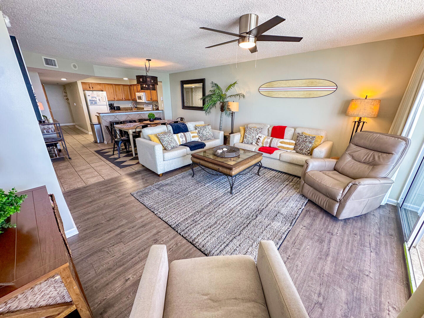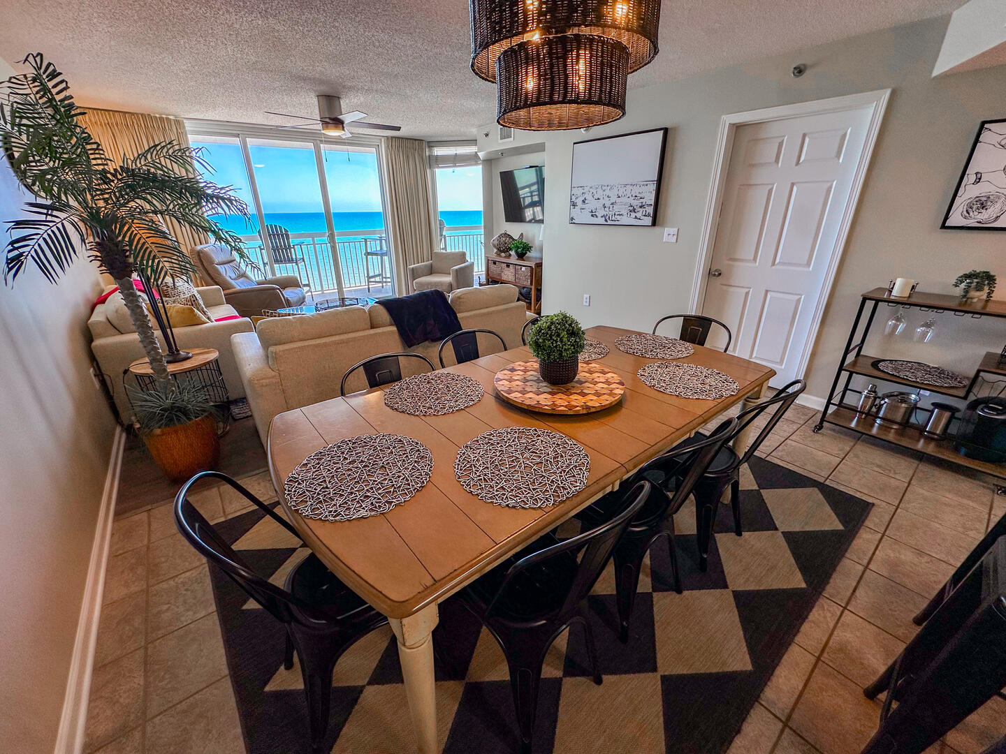 Relax in the expansive living area featuring a flat-screen TV, stylish furnishings, and complimentary high-speed Wi-Fi—ideal for unwinding after a day on the sand. Step out onto the 26-foot private balcony, accessible from both the living room and master suite, and enjoy panoramic views of the Atlantic while sipping morning coffee or evening cocktails.