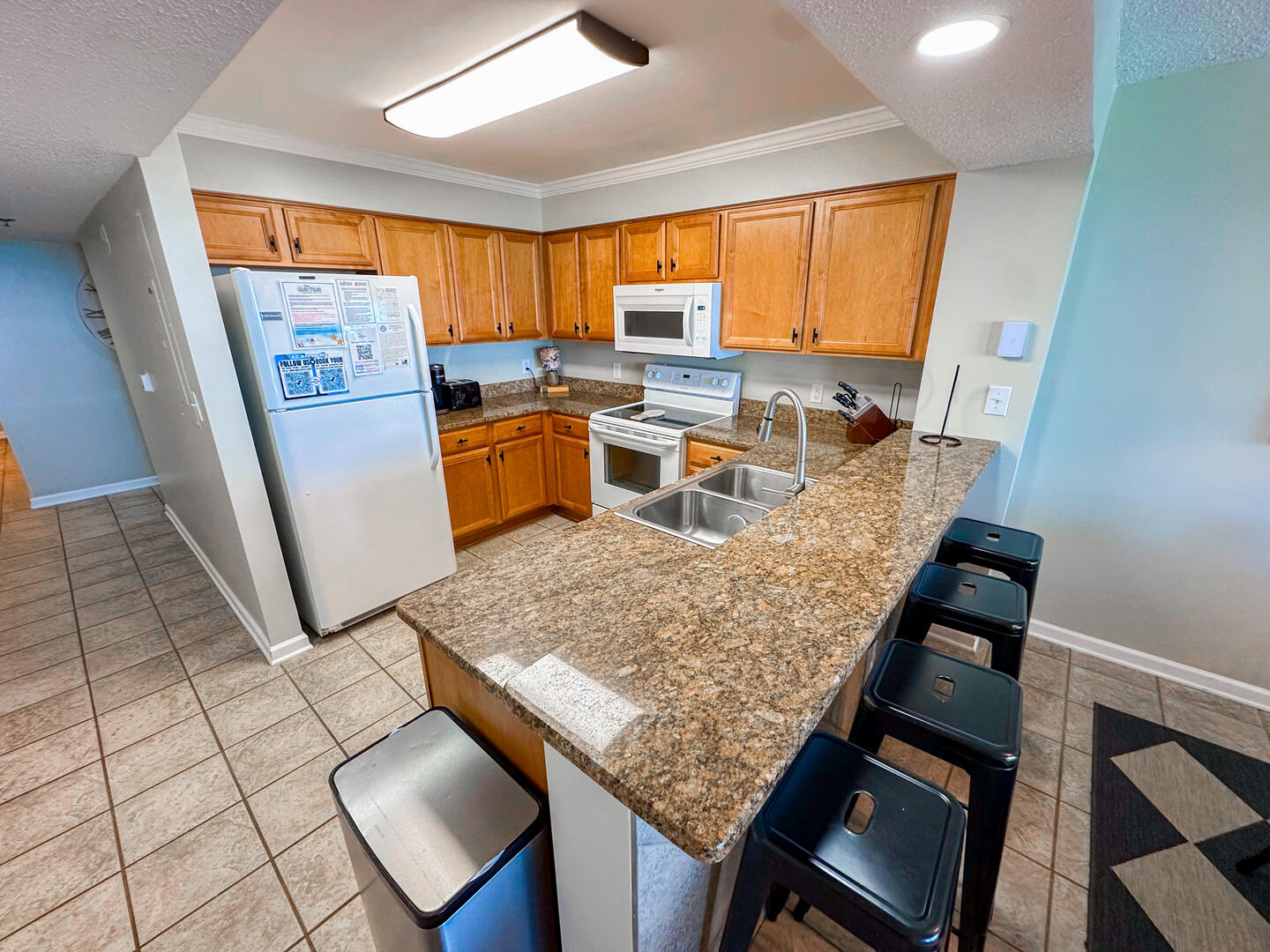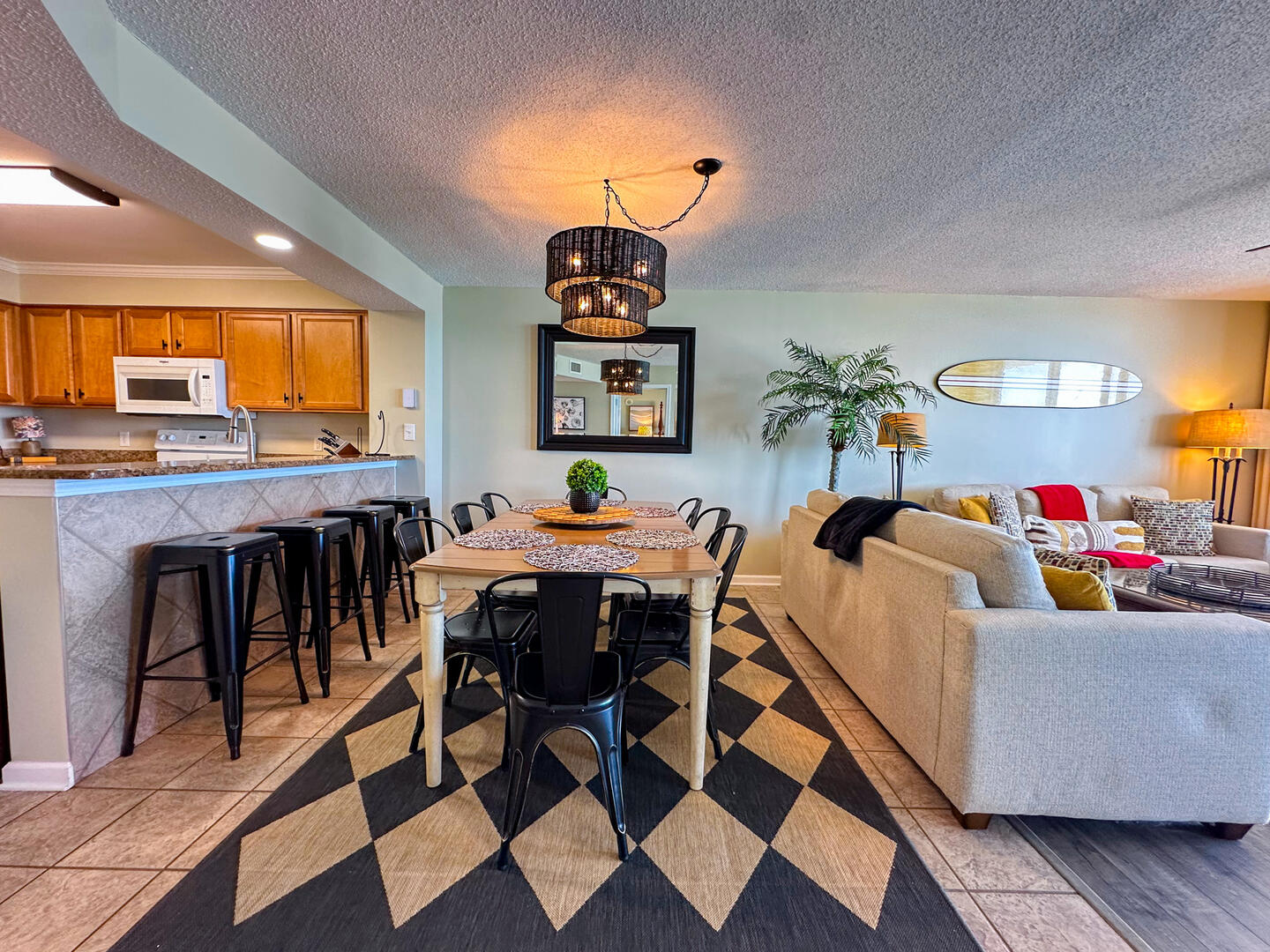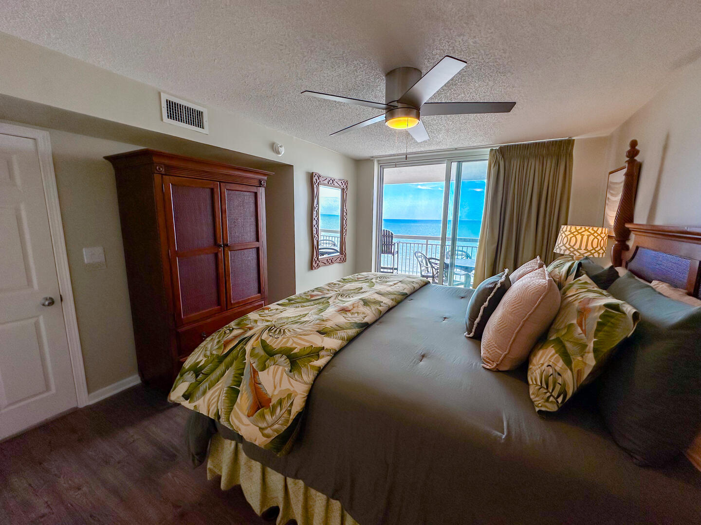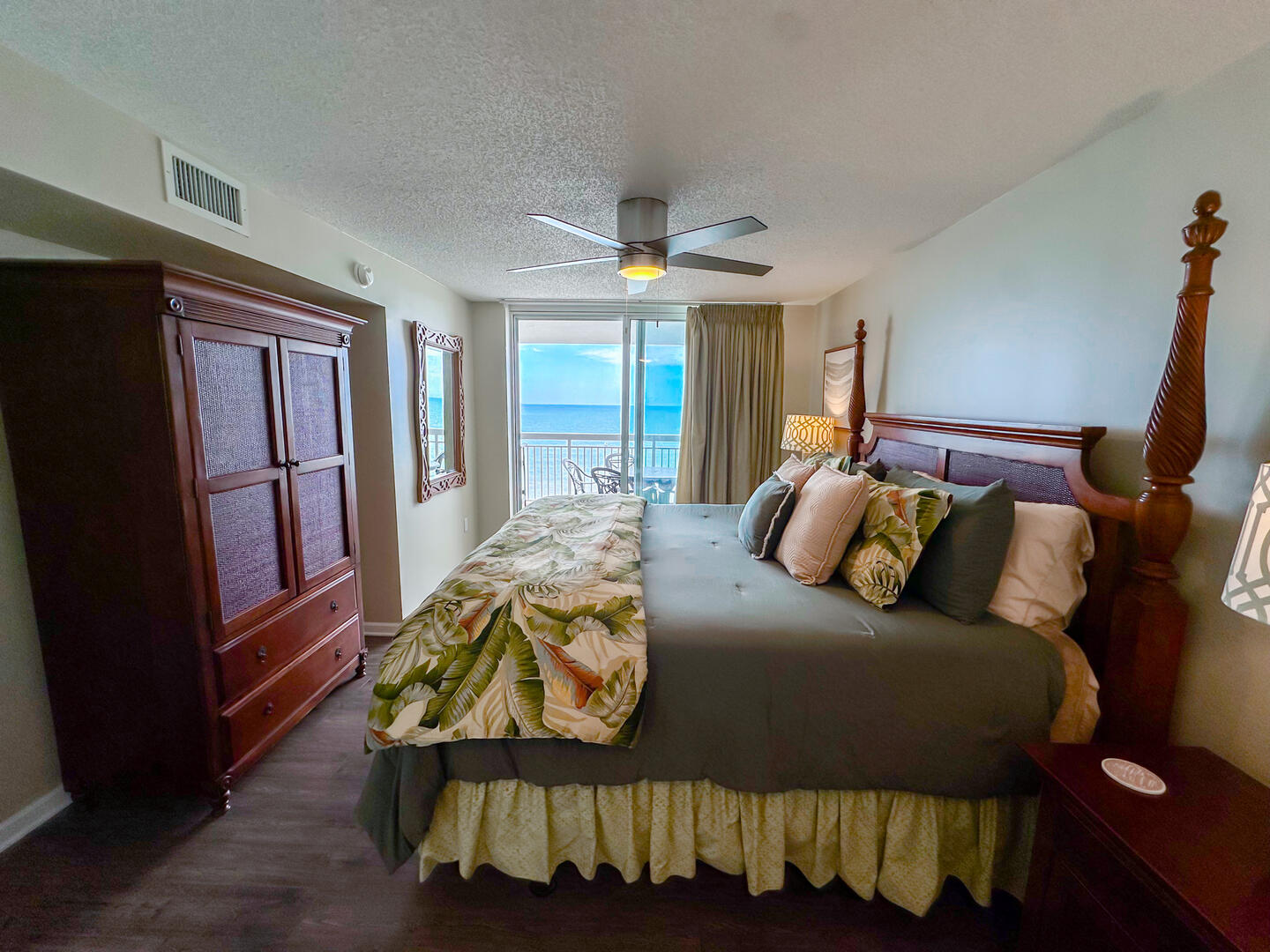 Relax in the expansive living area featuring a flat-screen TV, stylish furnishings, and complimentary high-speed Wi-Fi—ideal for unwinding after a day on the sand. Step out onto the 26-foot private balcony, accessible from both the living room and master suite, and enjoy panoramic views of the Atlantic while sipping morning coffee or evening cocktails.