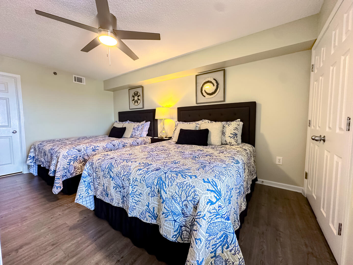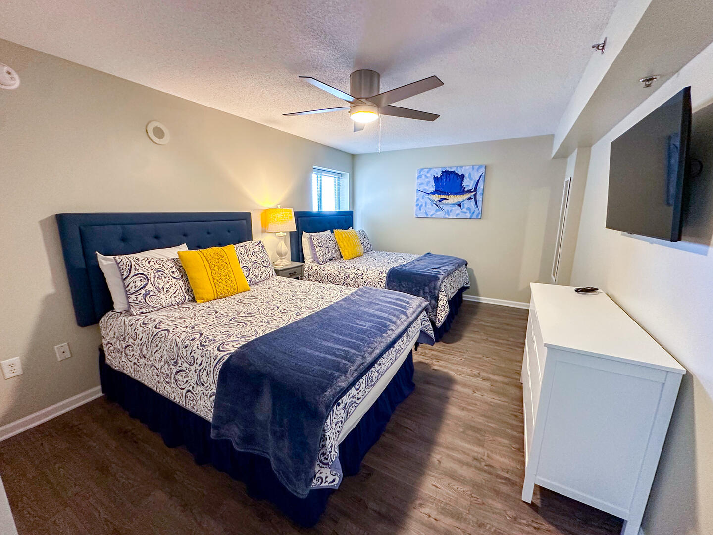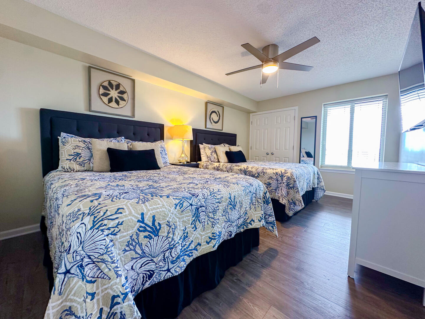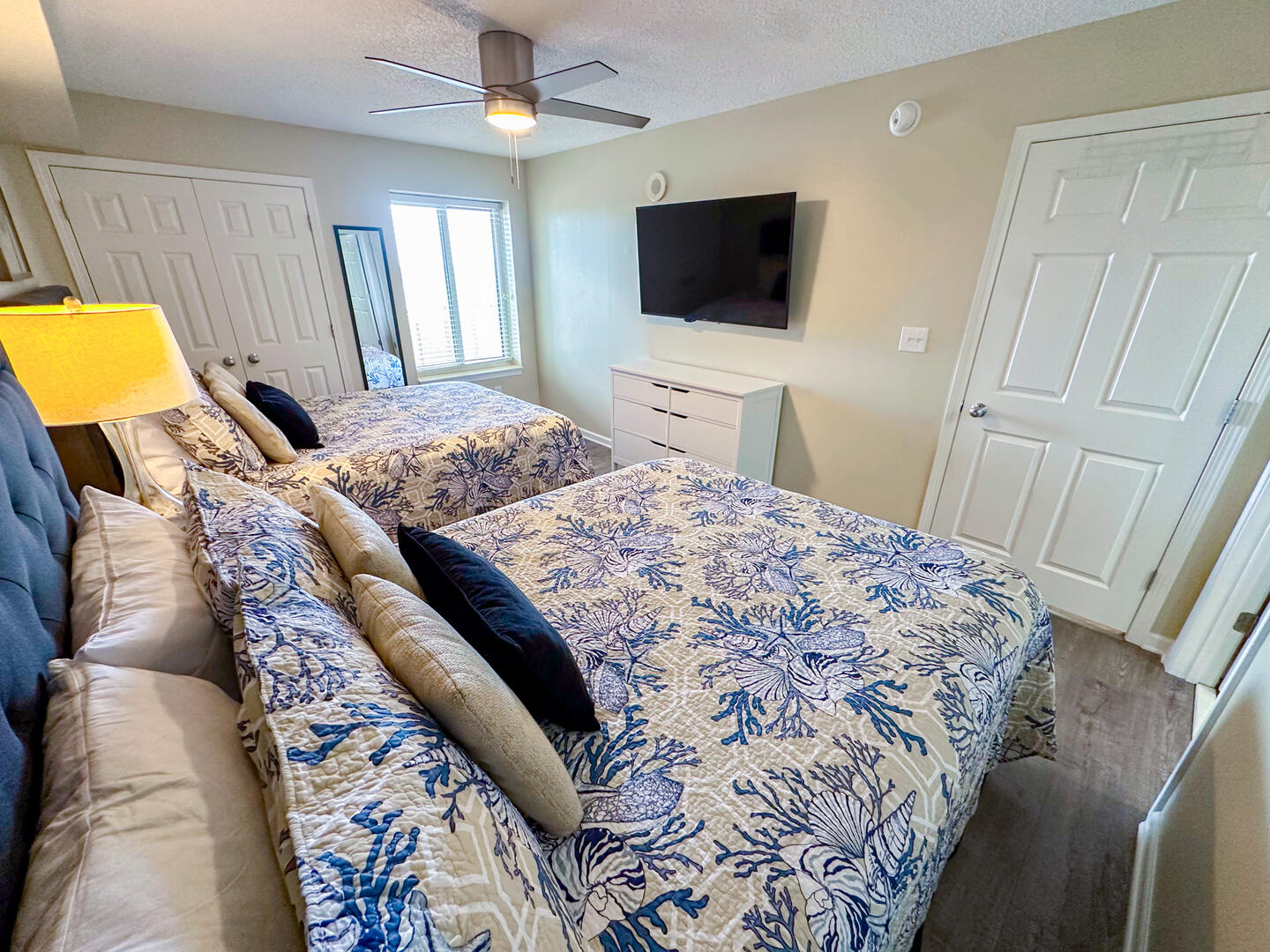 • Second Bedroom: Two queen beds + flat-screen TV + ceiling fan + private bathroom • Third Bedroom: Two queen beds + flat-screen TV + shared bathroom