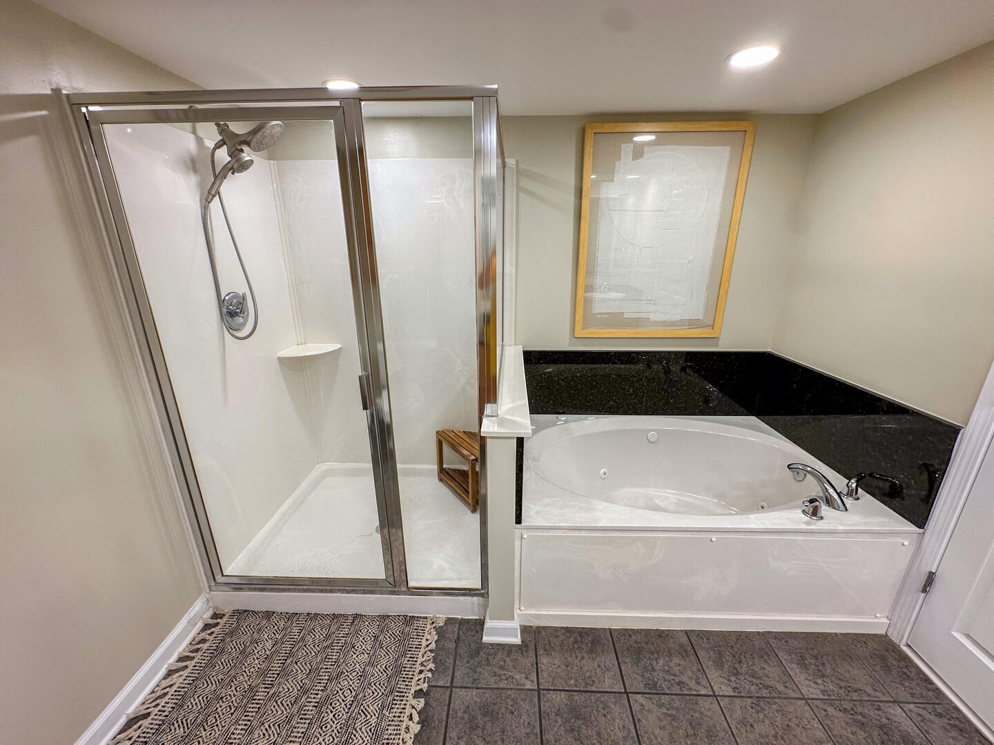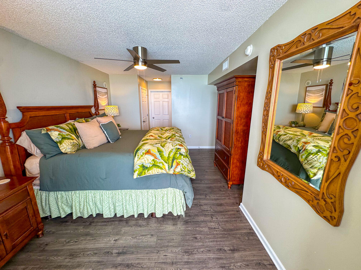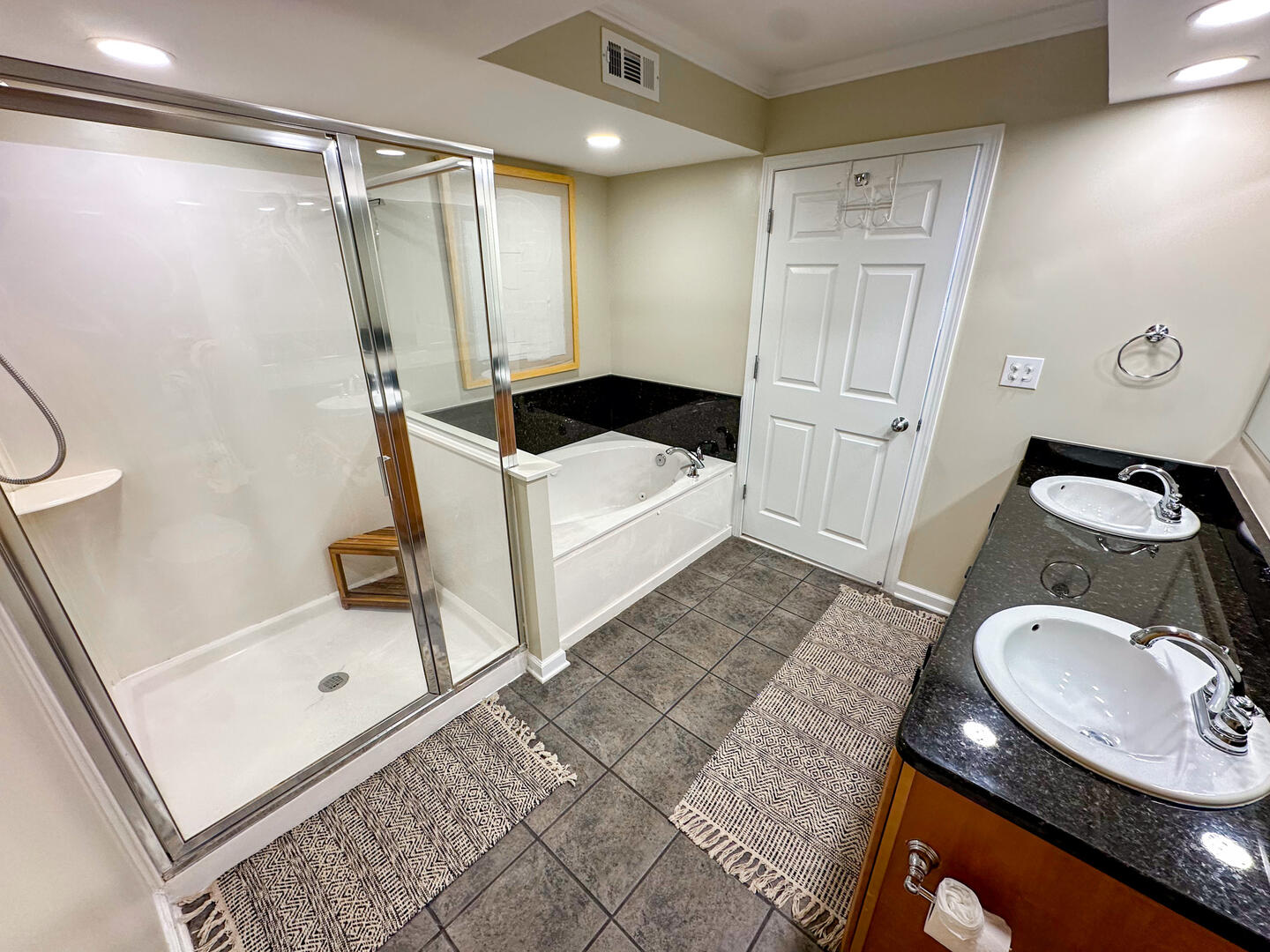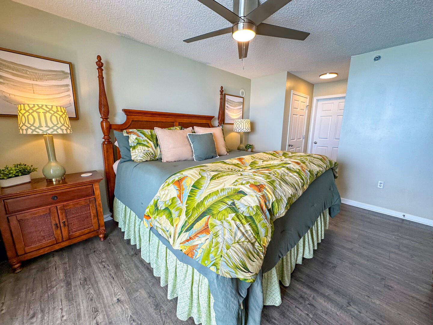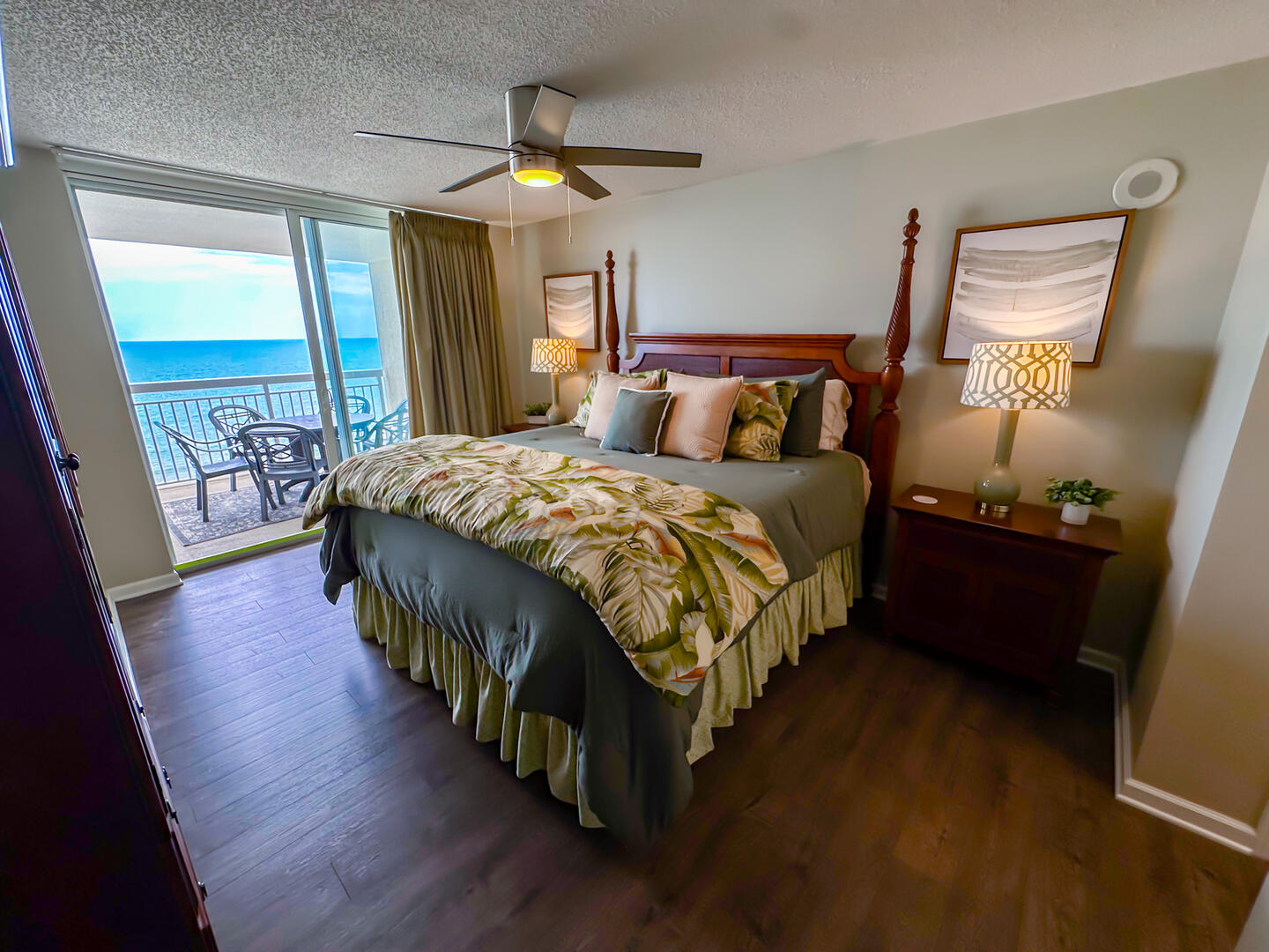 • Master Suite: King bed + flat-screen TV + ceiling fan + balcony access + ensuite with dual vanities, whirlpool tub & separate shower