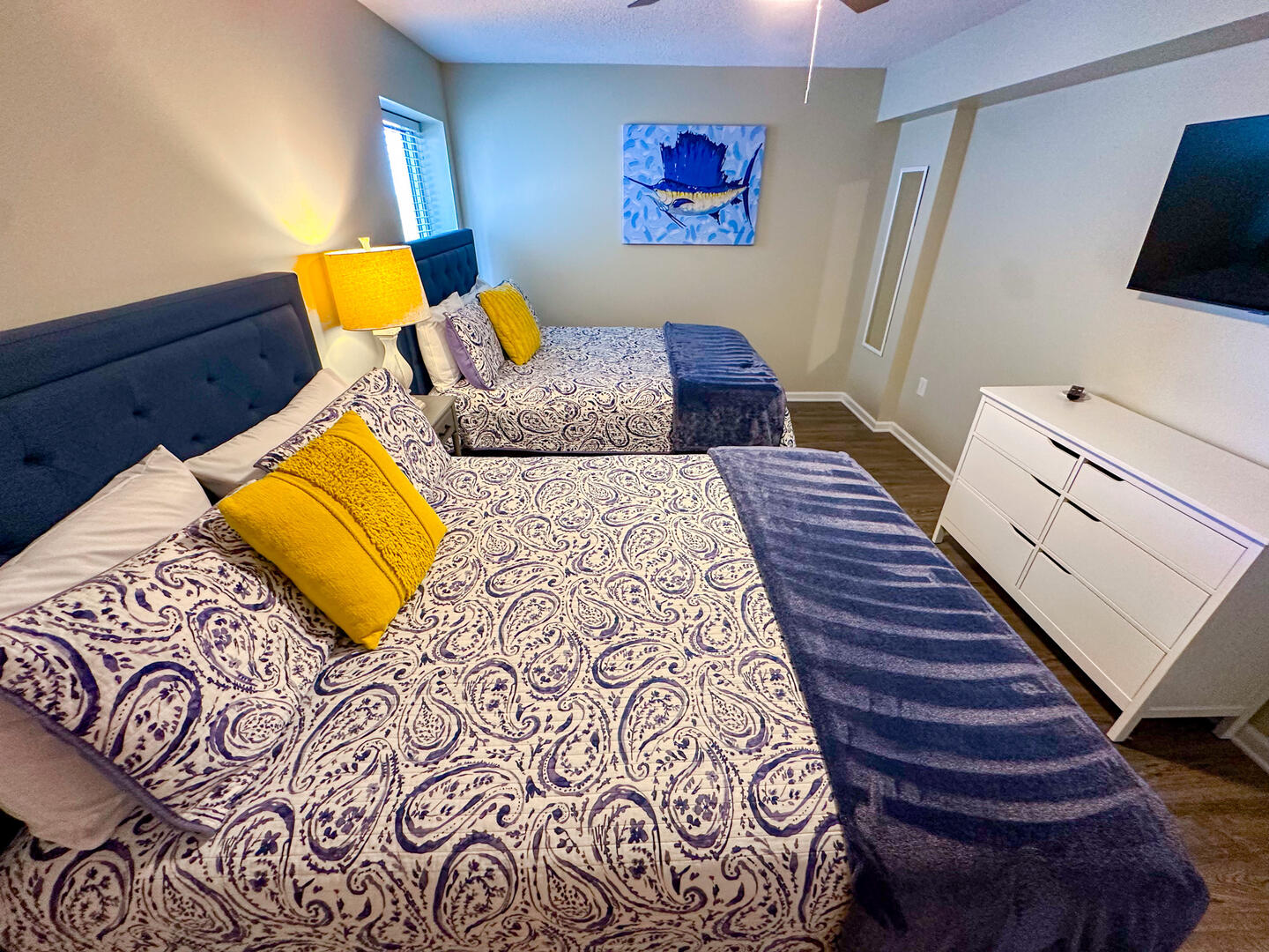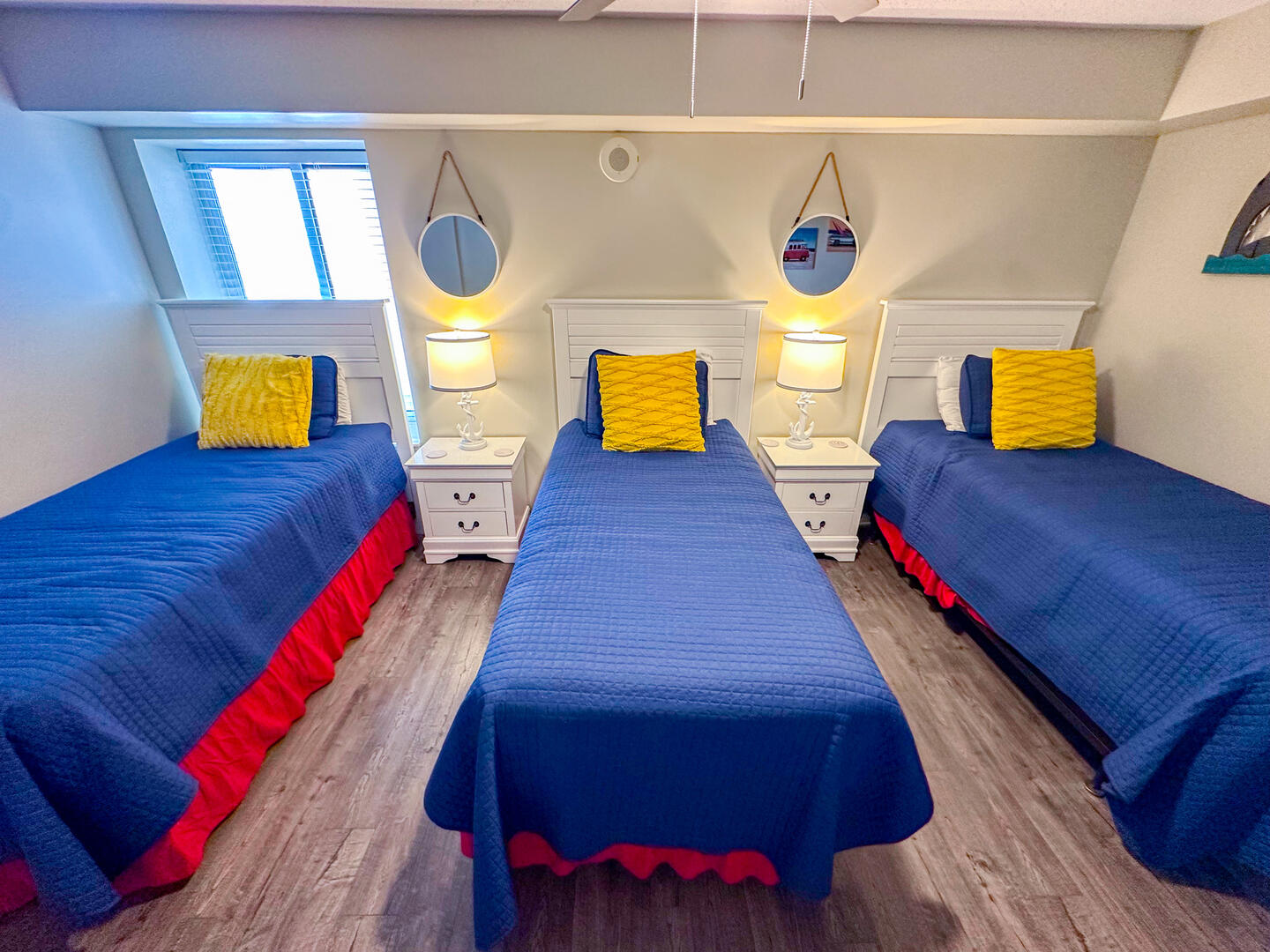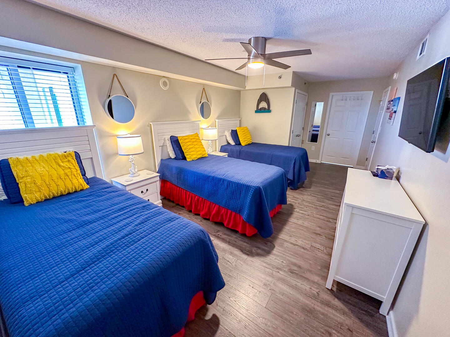 • Fourth Bedroom: Three twin beds + flat-screen TV + ceiling fan + shared bathroom