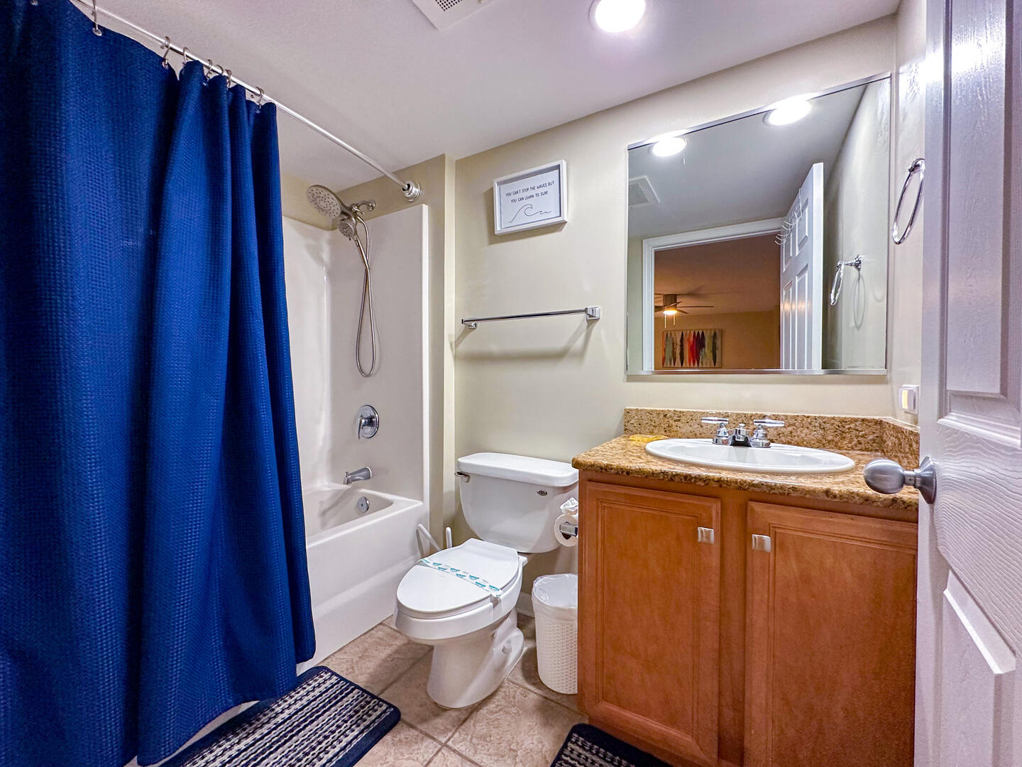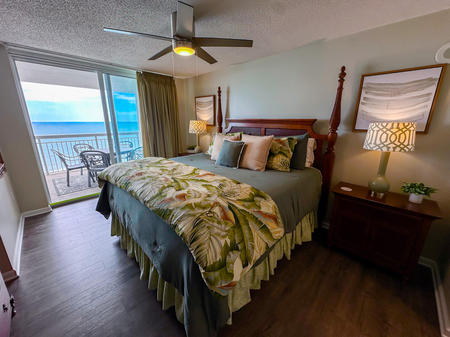 The master suite is a serene retreat with a king bed, flat-screen TV, ceiling fan, and direct balcony access. The spa-inspired ensuite includes dual vanities, a whirlpool garden tub, and a separate glass-enclosed shower. The second bedroom offers two queen beds, a flat-screen TV, ceiling fan, and a private bathroom. The third bedroom also has two queen beds, while the fourth features three twin beds—perfect for larger families or groups. Every bedroom includes flat-screen TVs and ceiling fans for comfort and entertainment.Bedrooms & Baths: