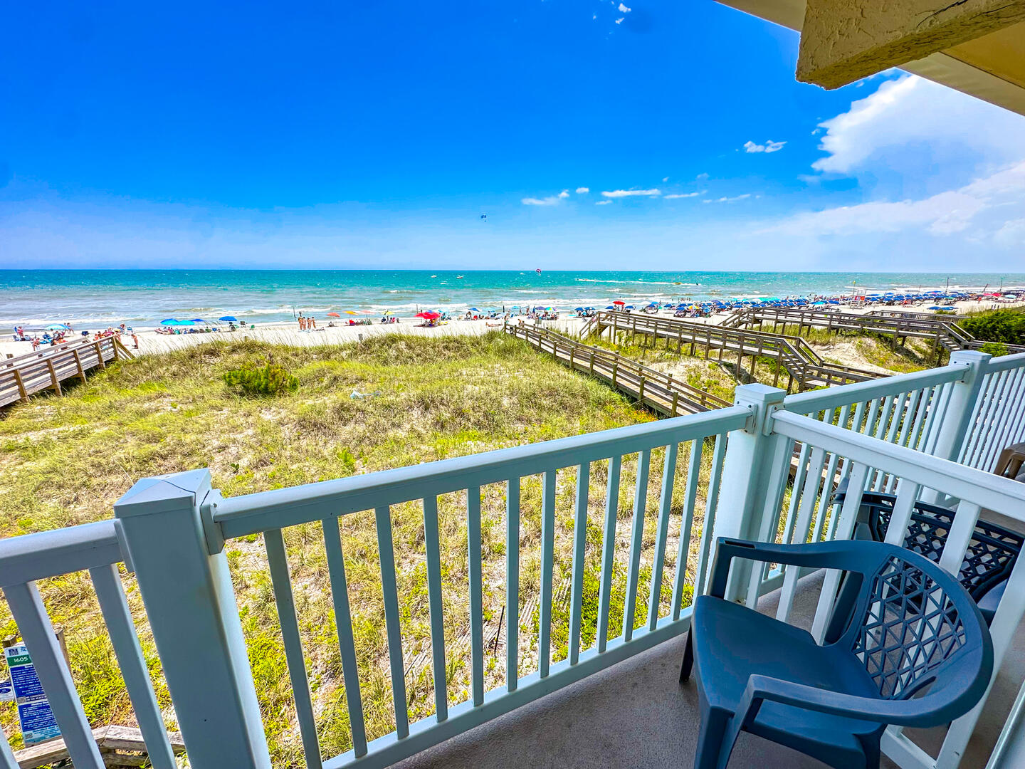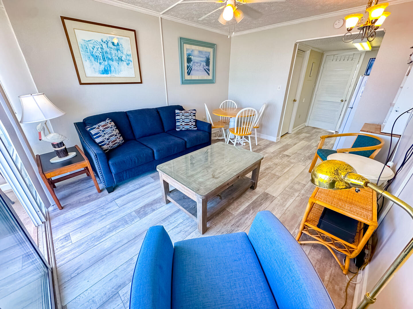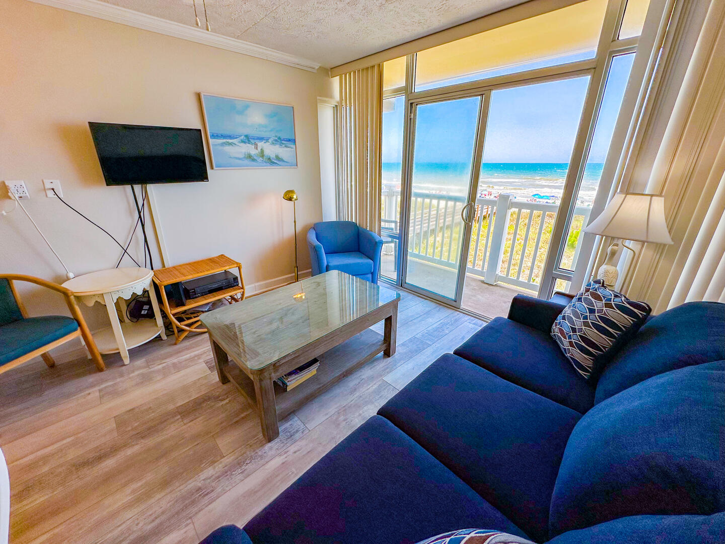 Charming 1BR oceanfront condo with private balcony, full kitchen, sleeper sofa, and stunning views, an affordable Crescent Beach escape perfect for couples.