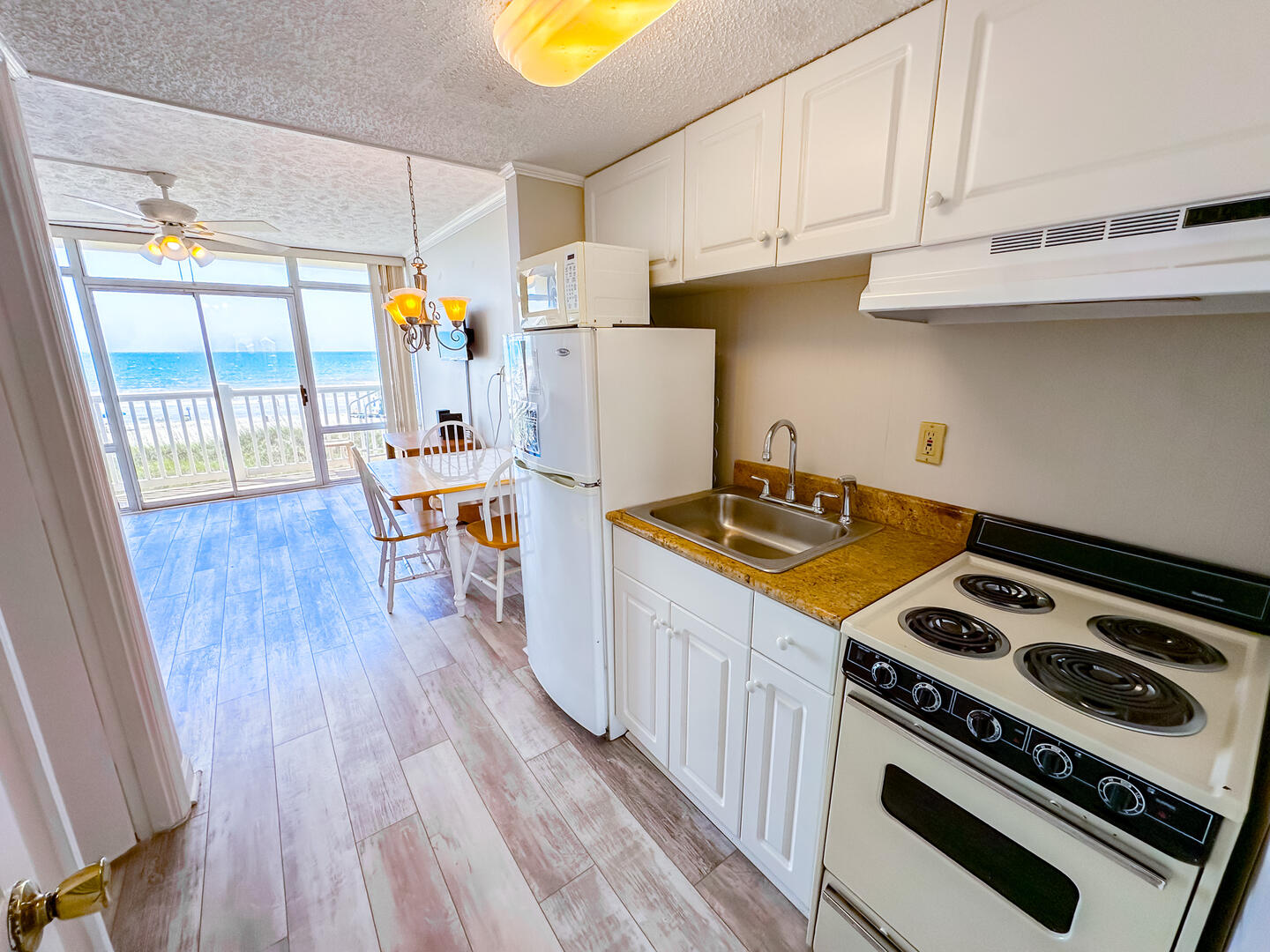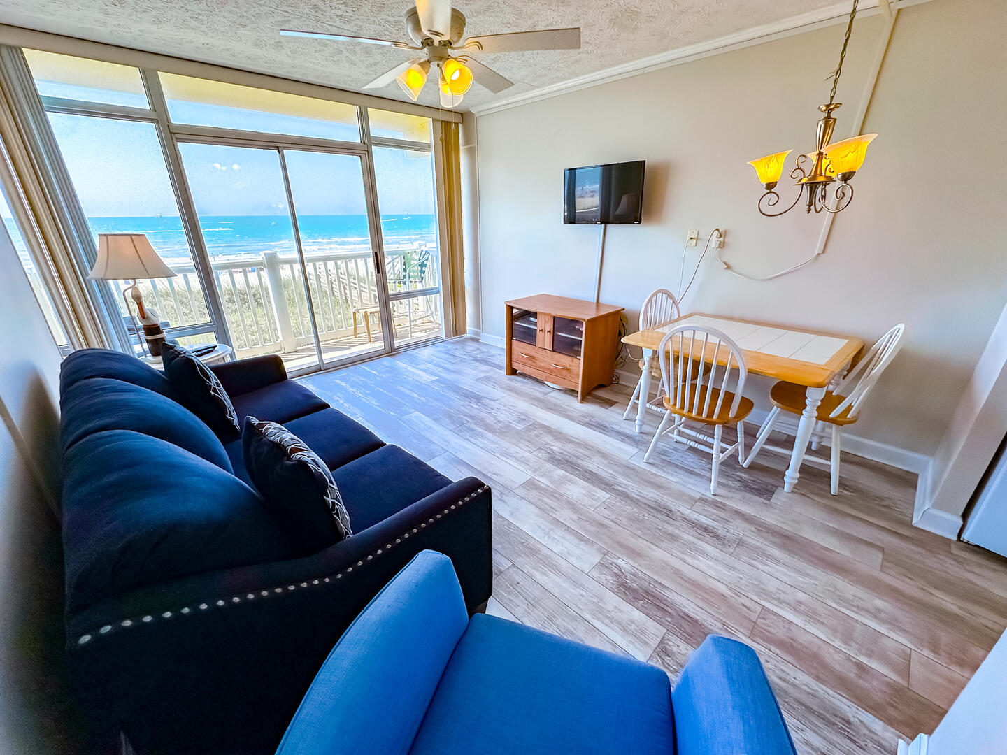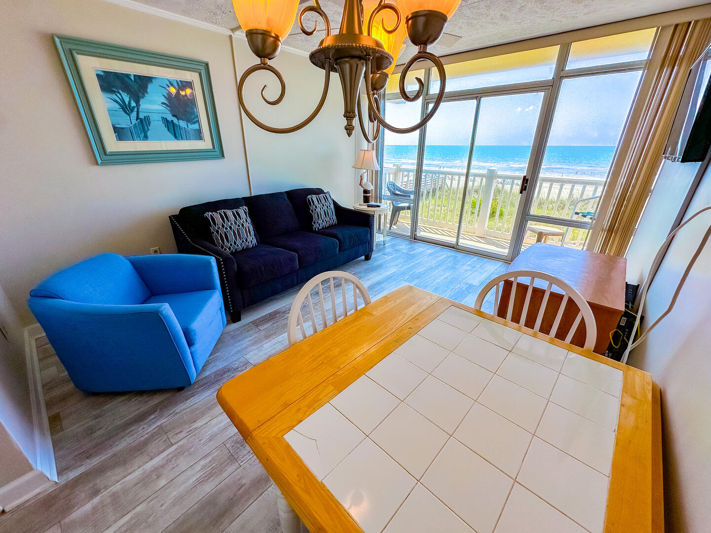 Cozy 1BR oceanfront condo with balcony views, full kitchen, sleeper sofa, and direct beach access, an affordable Crescent Beach retreat perfect for couples.