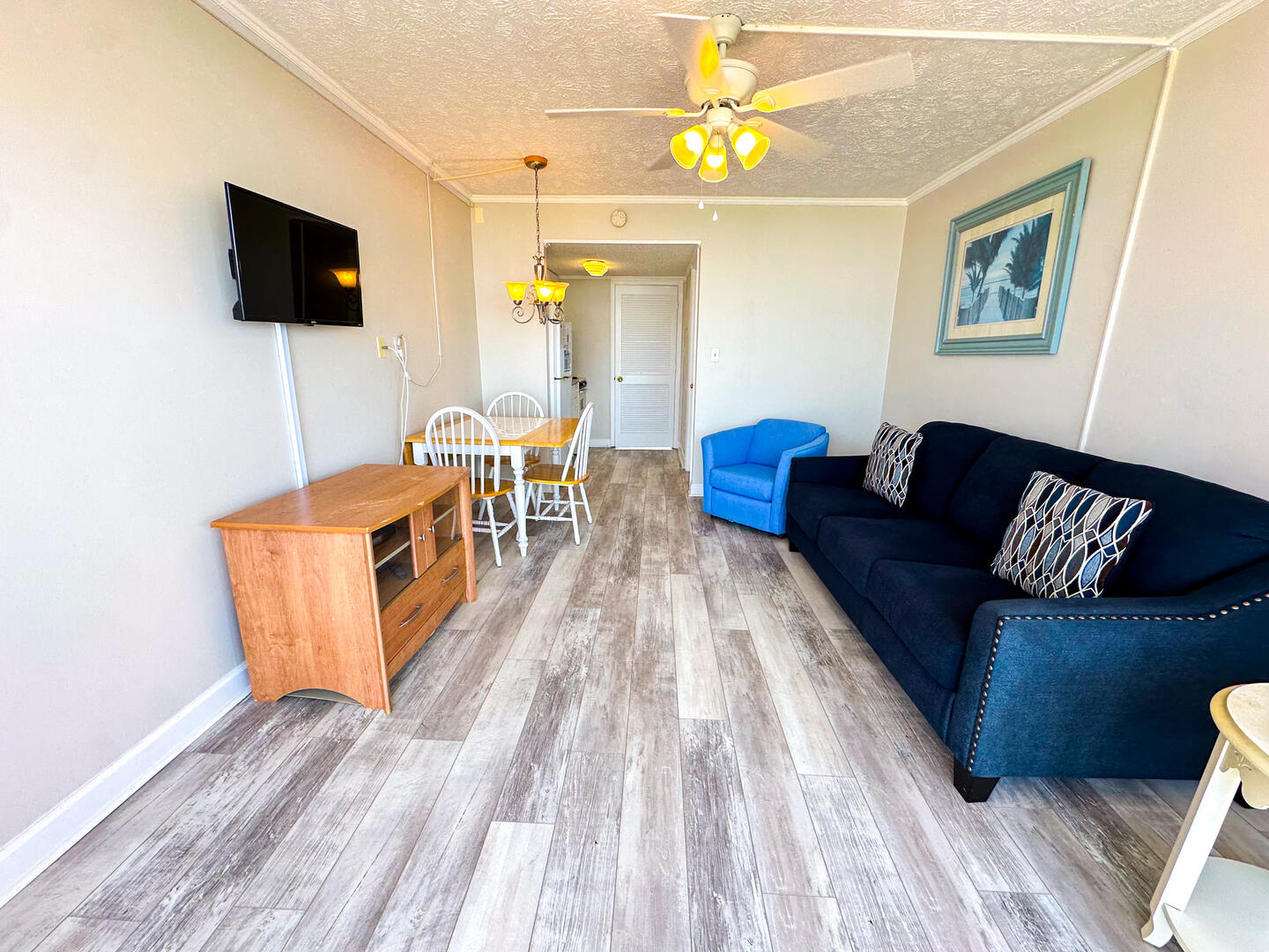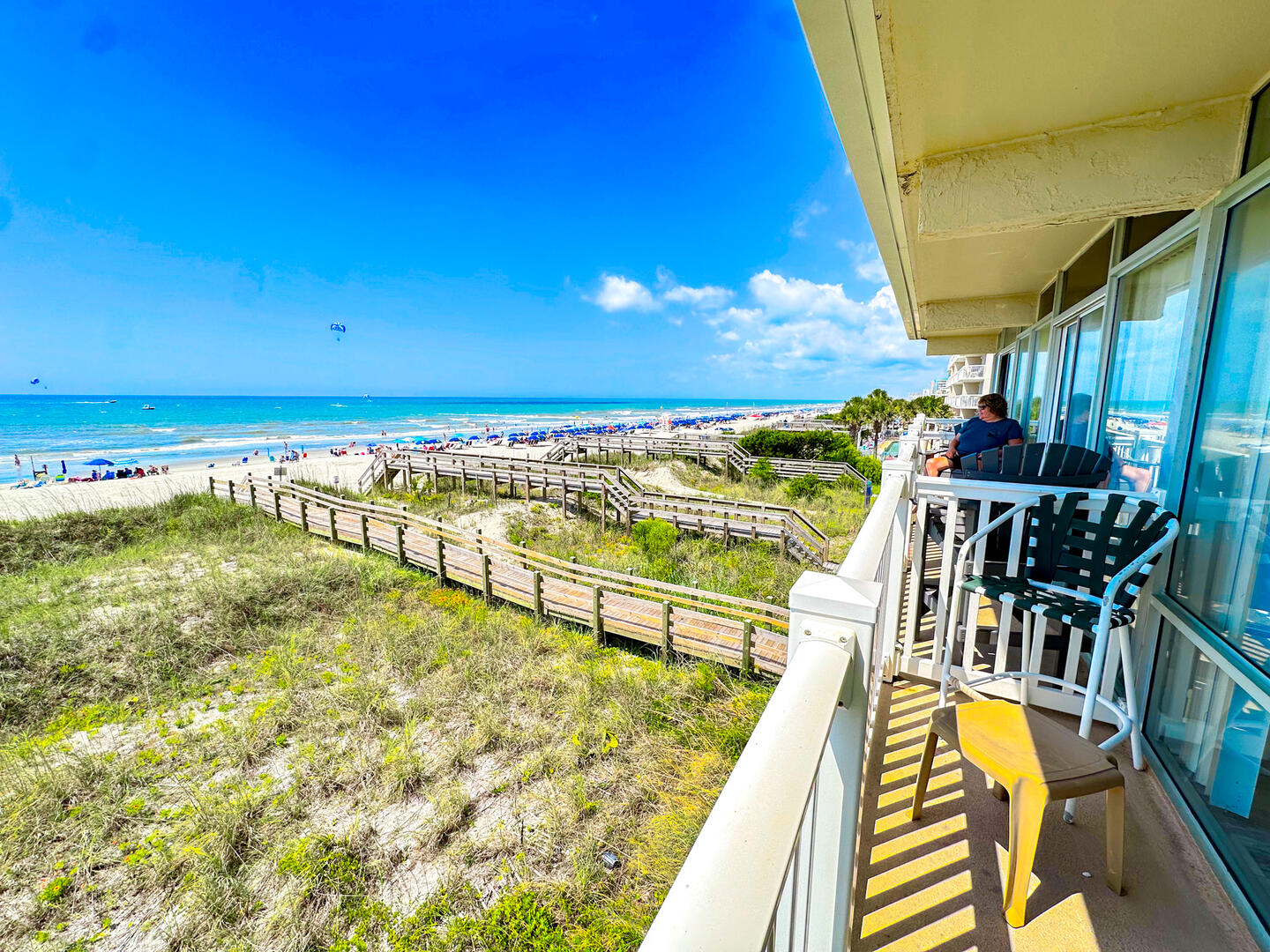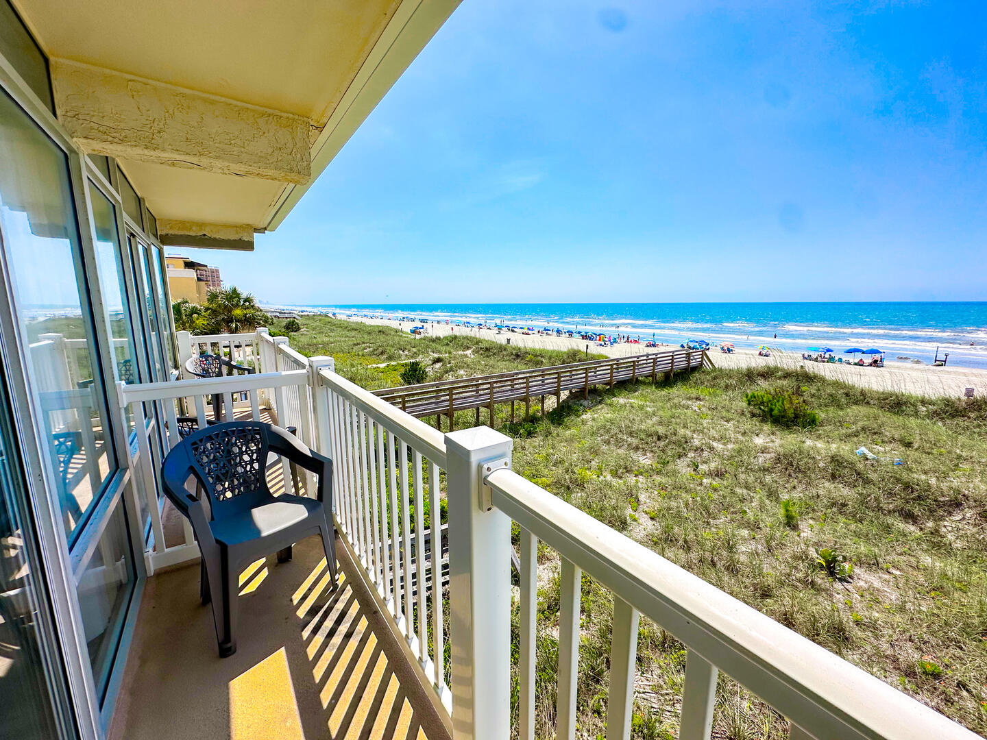 Cozy 1BR oceanfront condo with balcony views, full kitchen, sleeper sofa, and direct beach access, an affordable Crescent Beach retreat perfect for couples.
