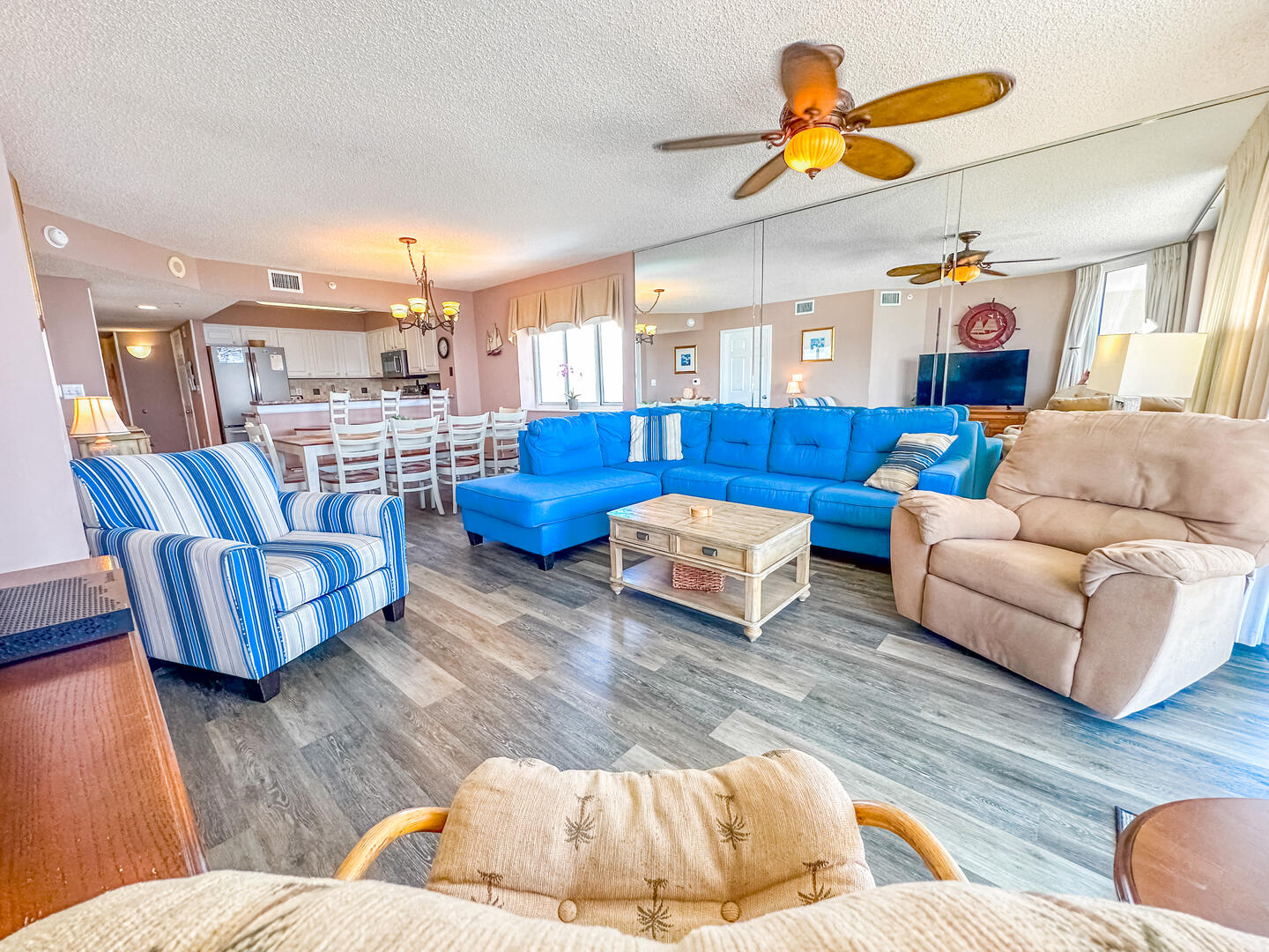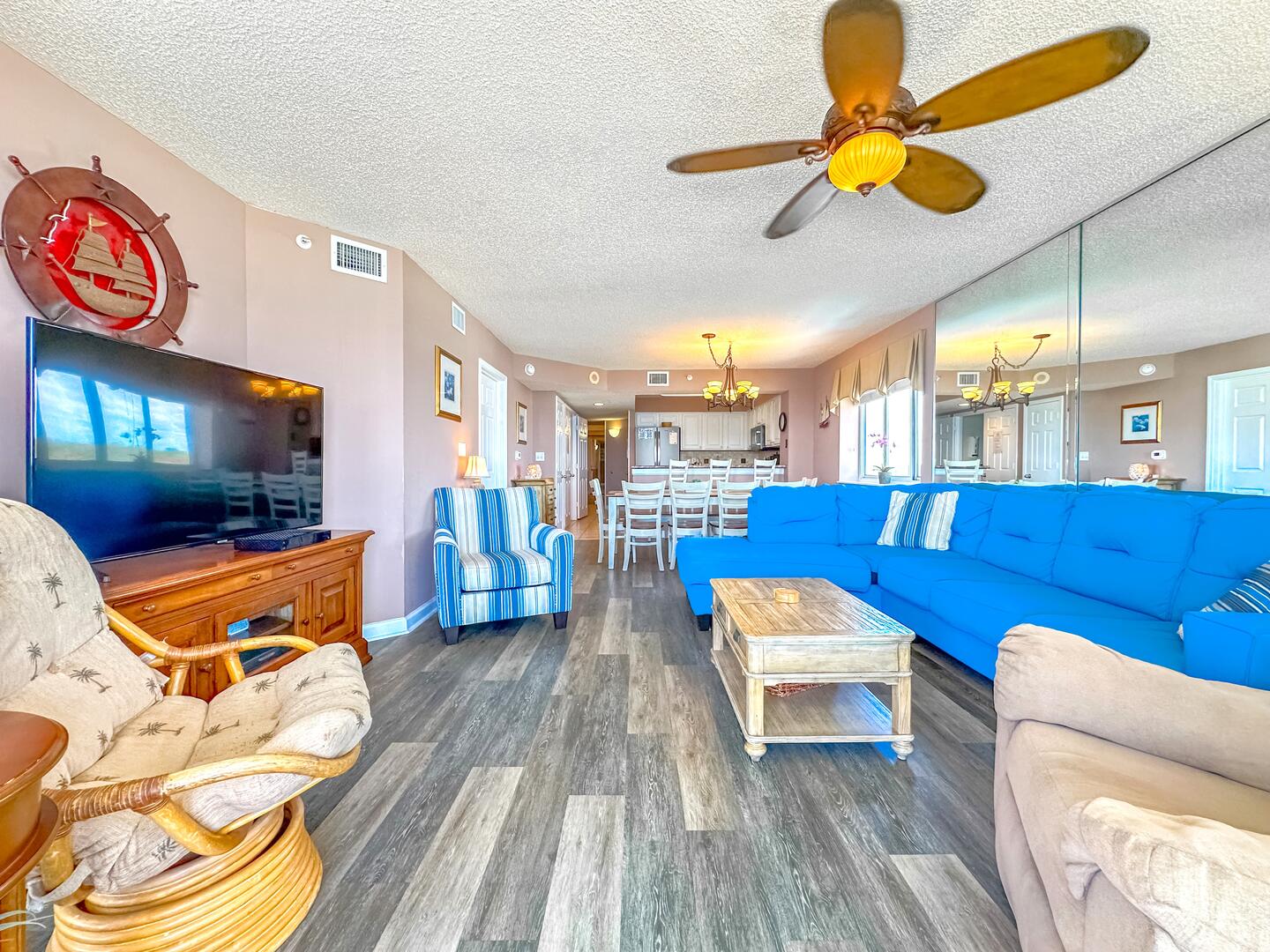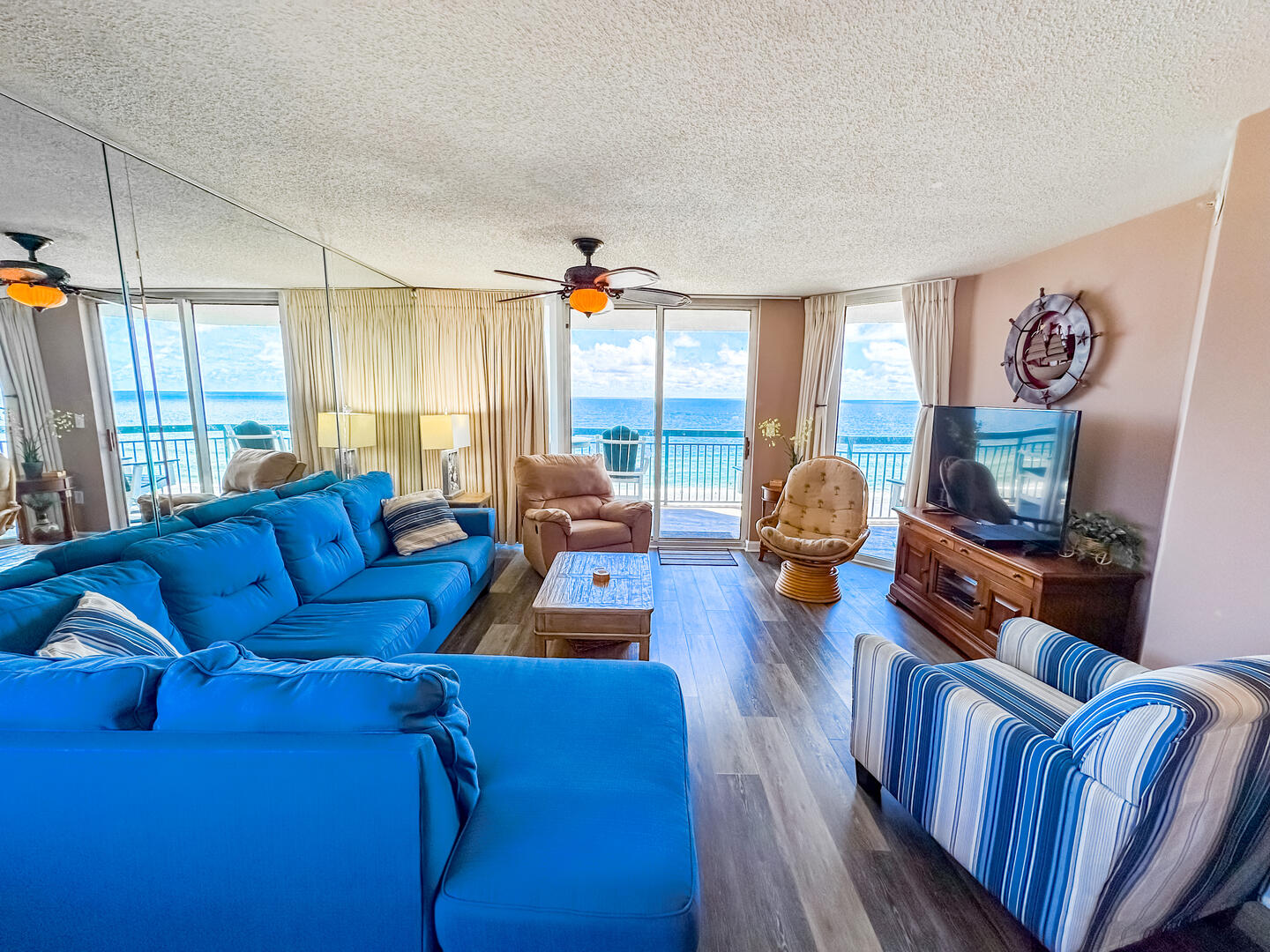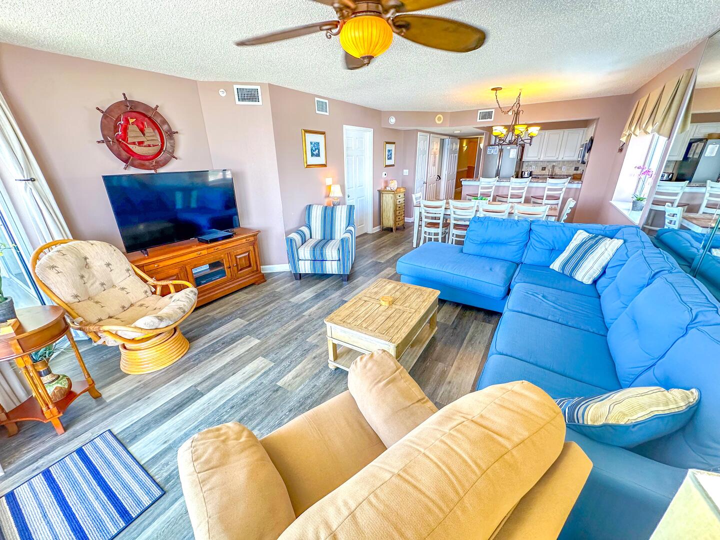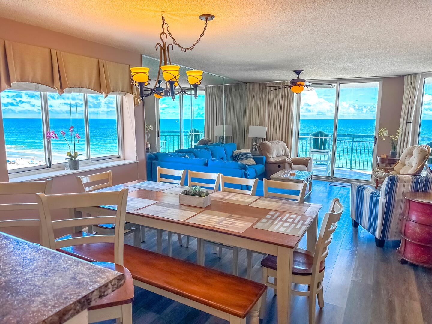 Spacious 4BR/3BA oceanfront condo at North Shore Villas 801 with panoramic views, private balcony, modern kitchen, resort pool, lazy river & hot tub—perfect for families