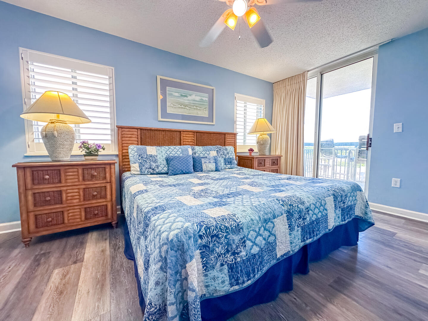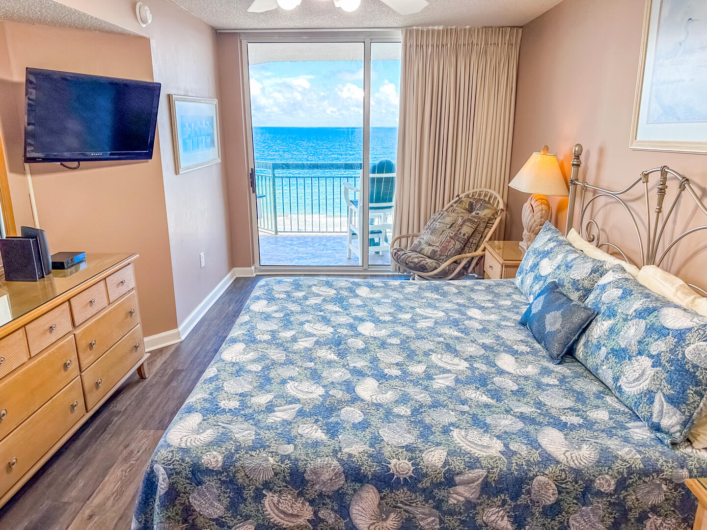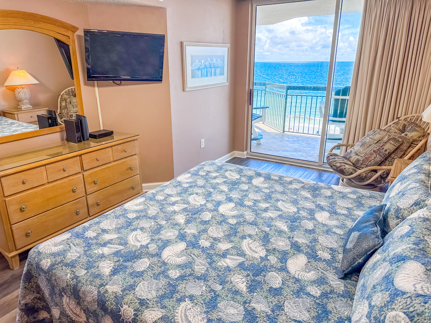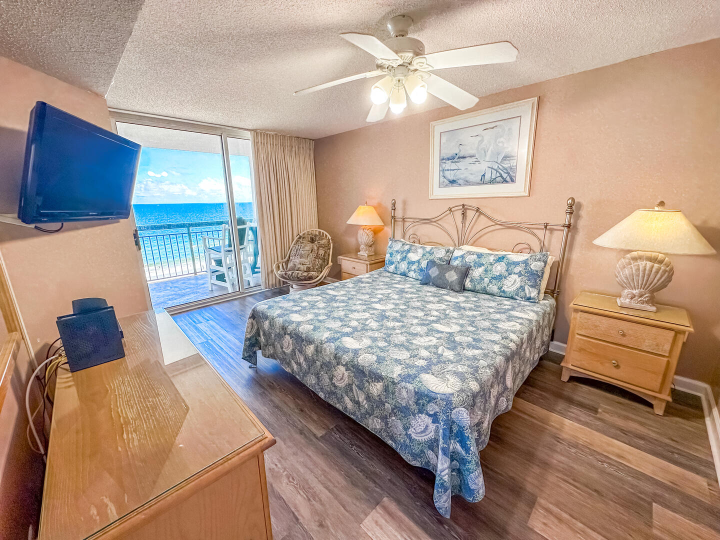 • Master Suite: King bed + flat-screen TV + ceiling fan + oceanfront balcony access + private bath with double vanities, garden tub & glass-enclosed shower