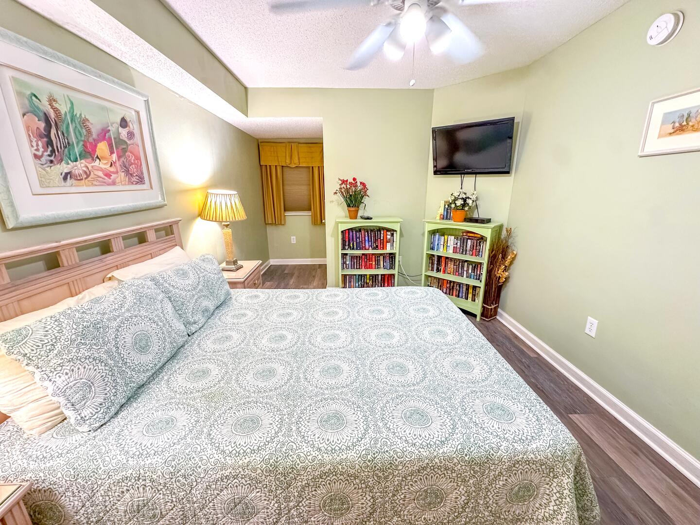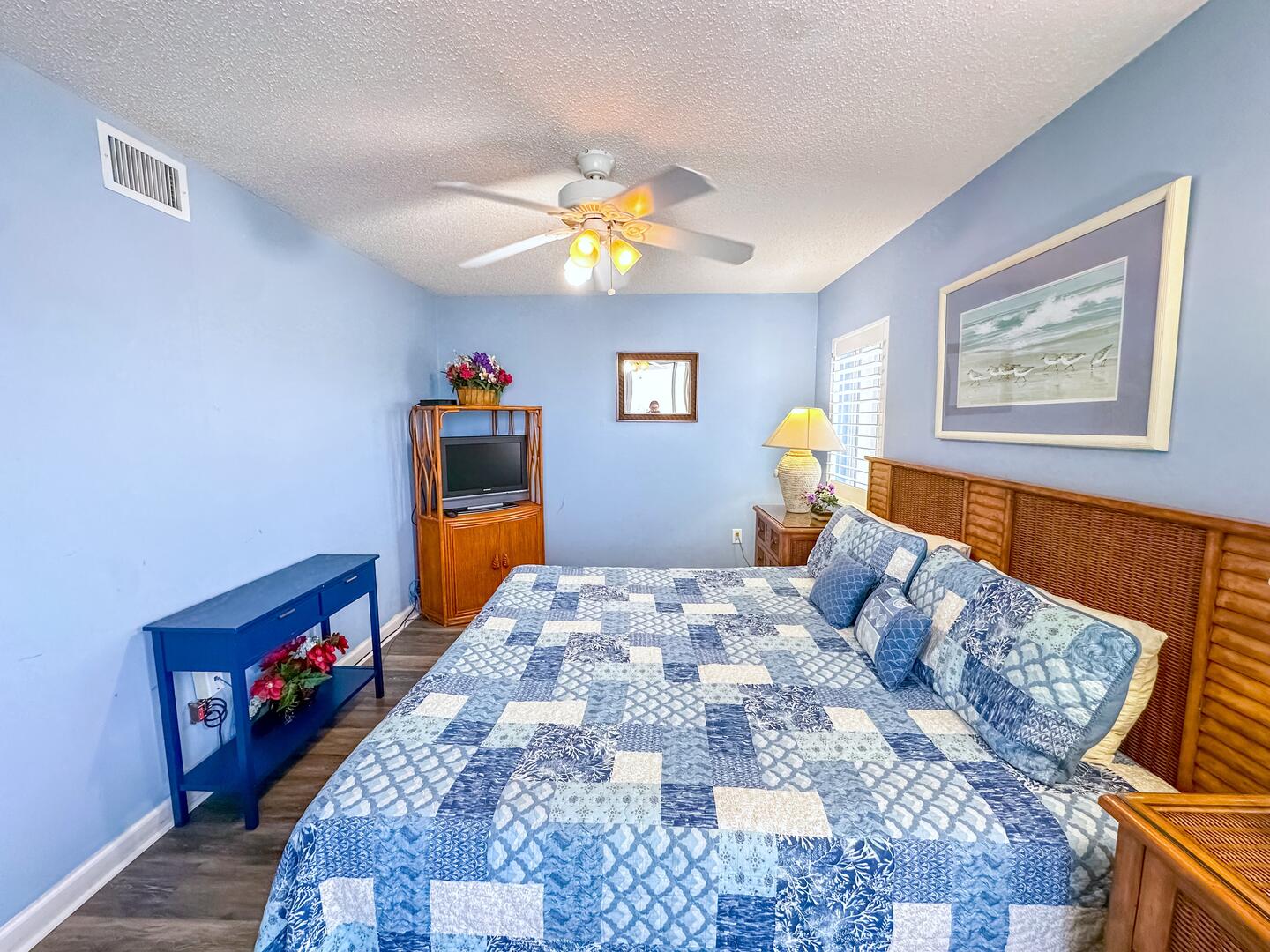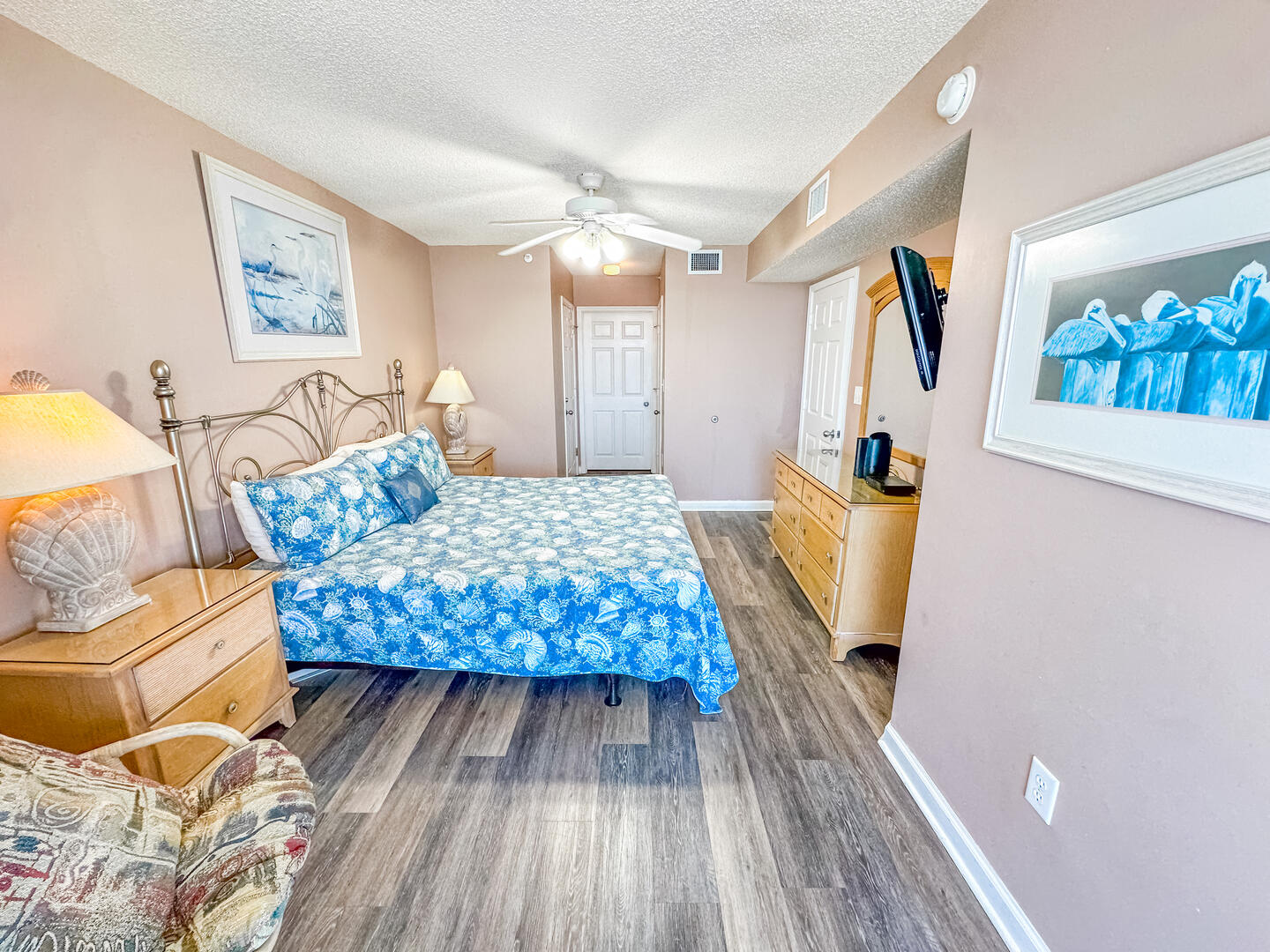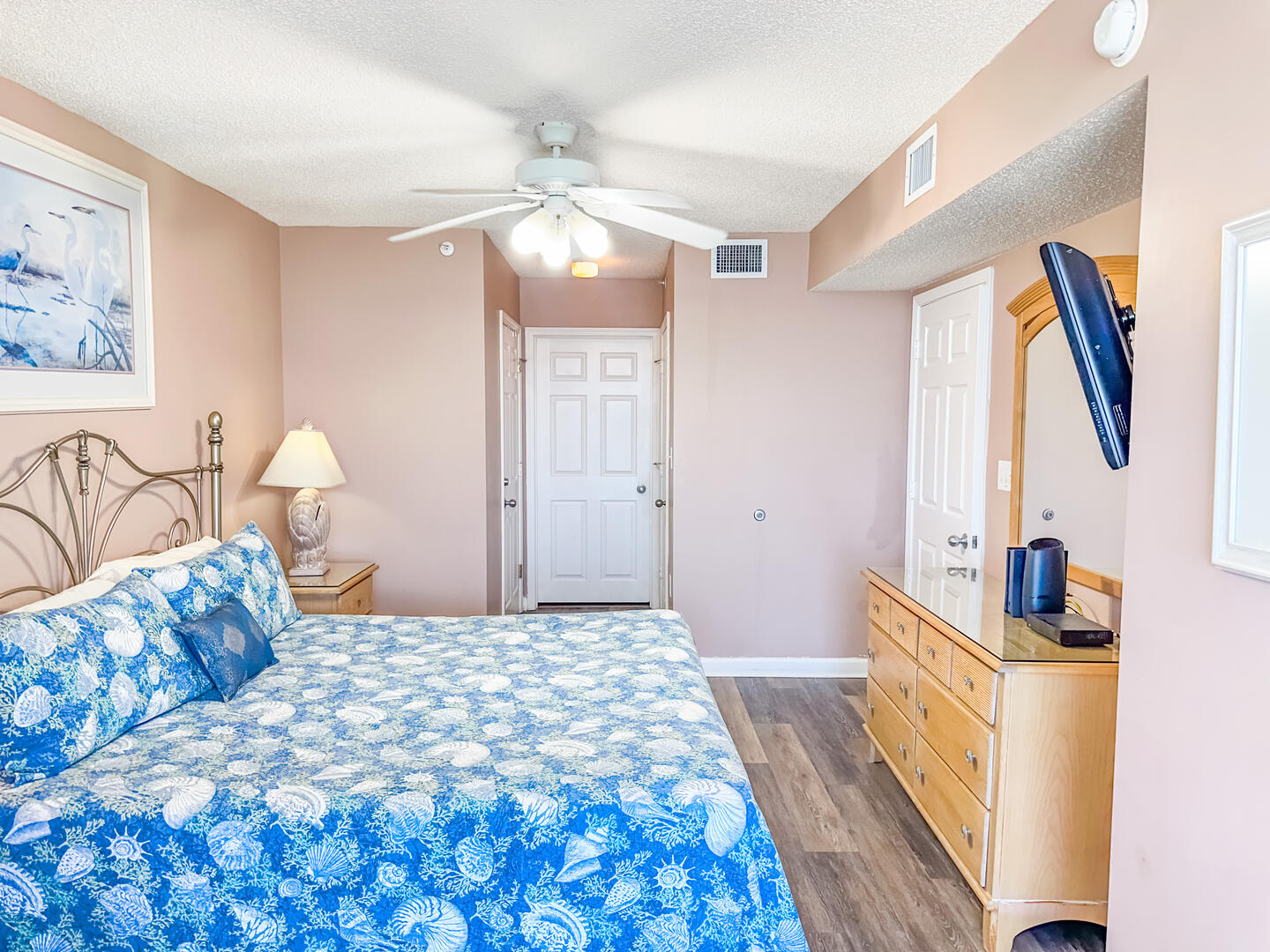 • Second Bedroom: King bed + flat-screen TV + ceiling fan + en-suite bath