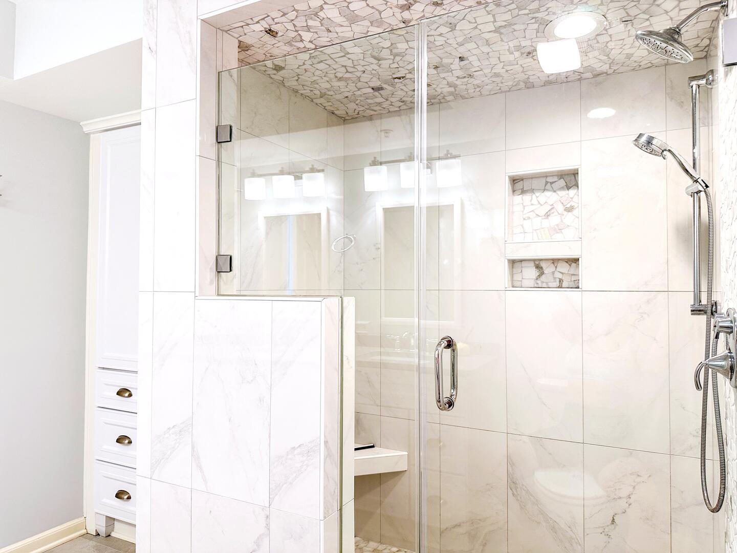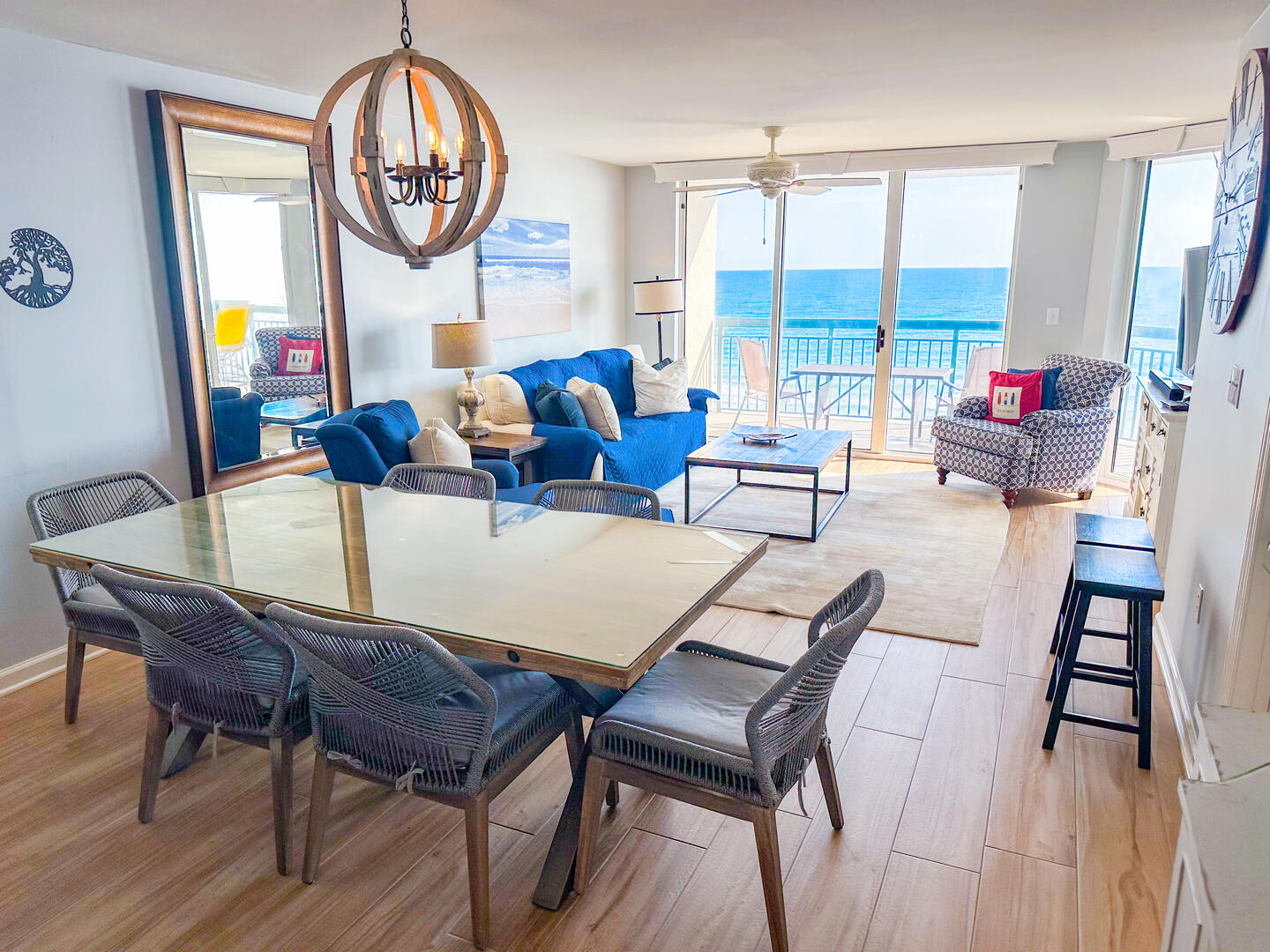 • Primary Suite: King bed + flat-screen TV + ceiling fan + oceanfront balcony access + private ensuite with double vanities & oversized glass-enclosed shower