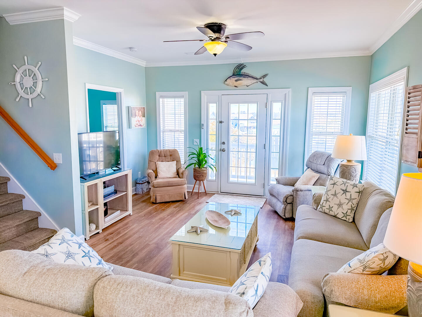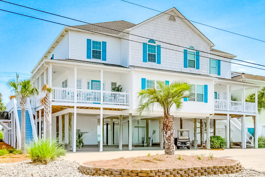 Spacious second-row beach home in Cherry Grove, North Myrtle Beach. Pelican Manor Unit D offers 4 bedrooms, 4.5 baths, sleeps 12, wrap-around balconies with marsh views, modern décor, updated appliances, ample parking, and just a 1-minute walk to the beach.