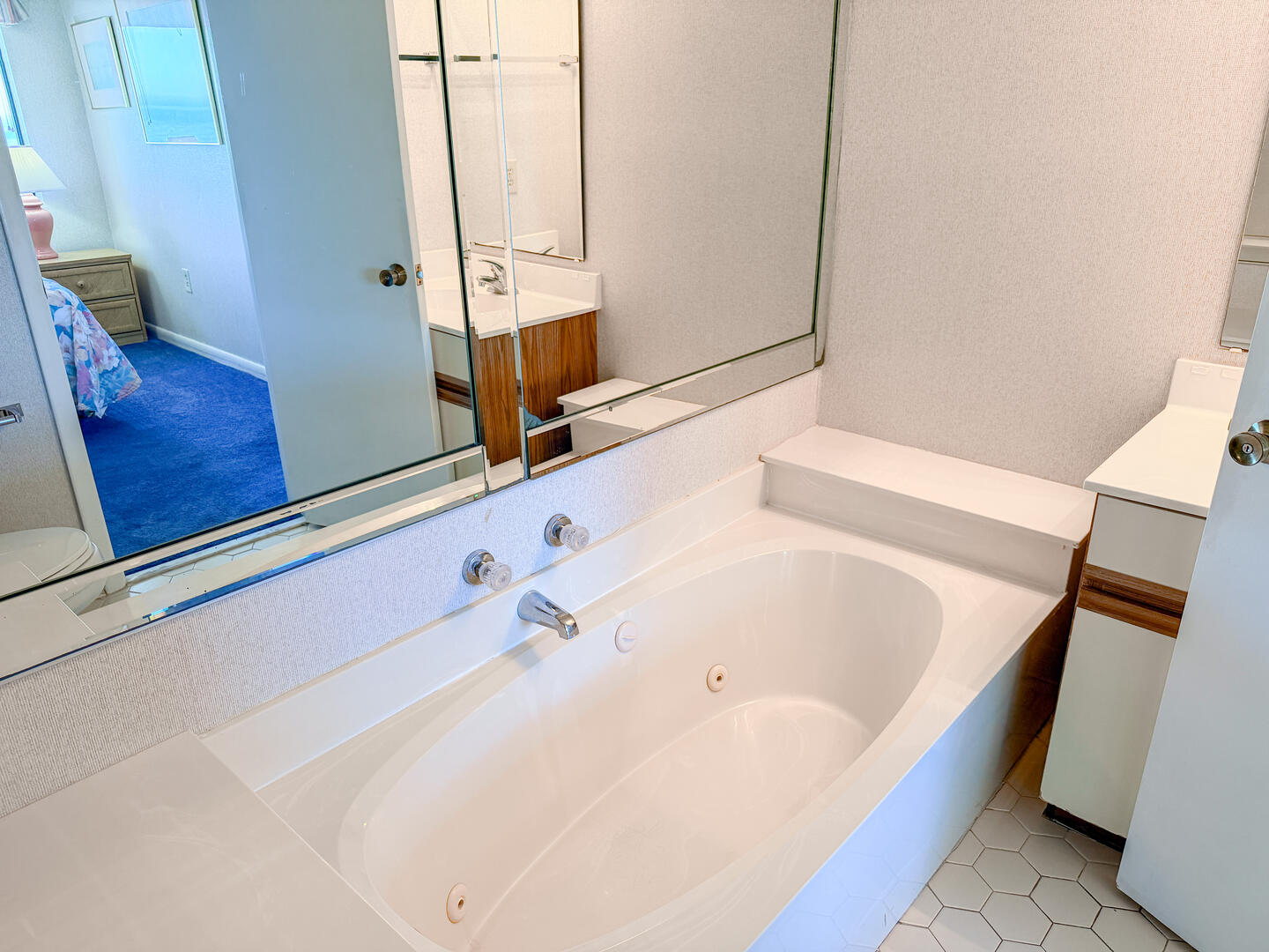 • Bedroom 1: Queen bed + flat screen TV + private ensuite bathroom with tub