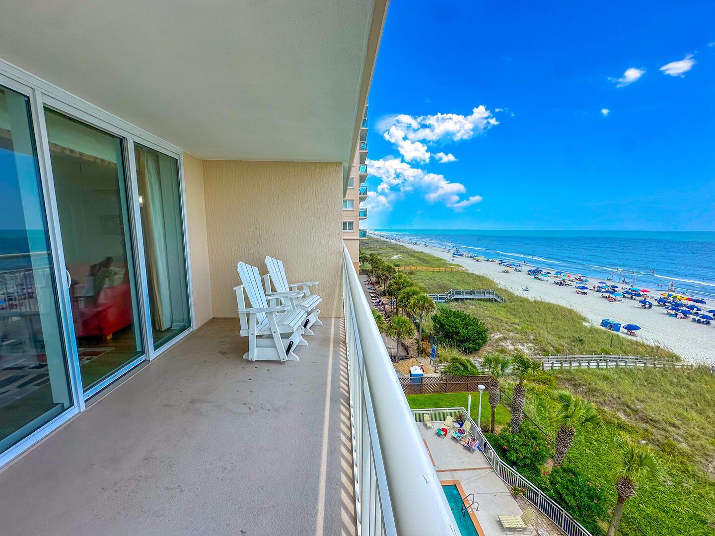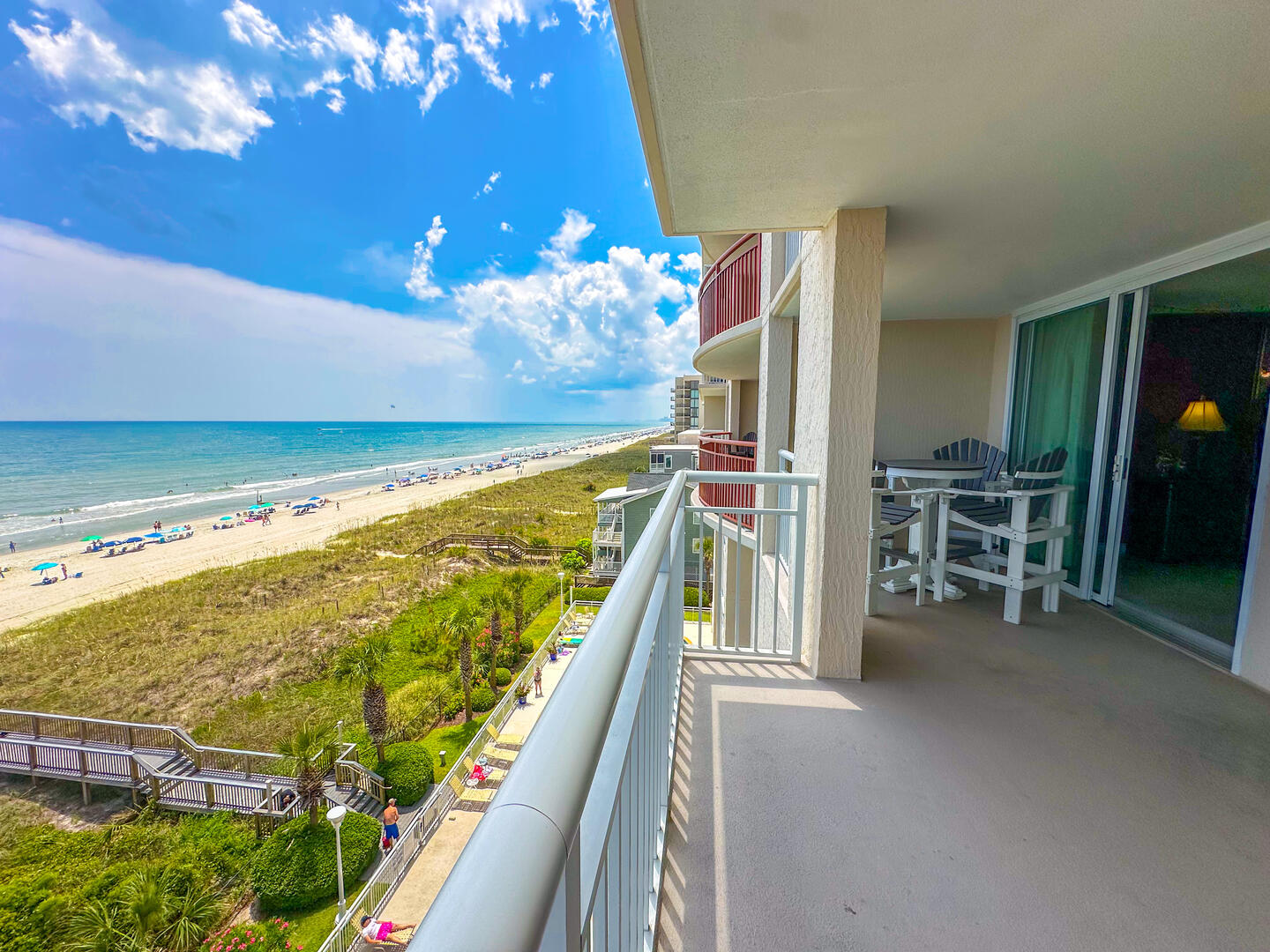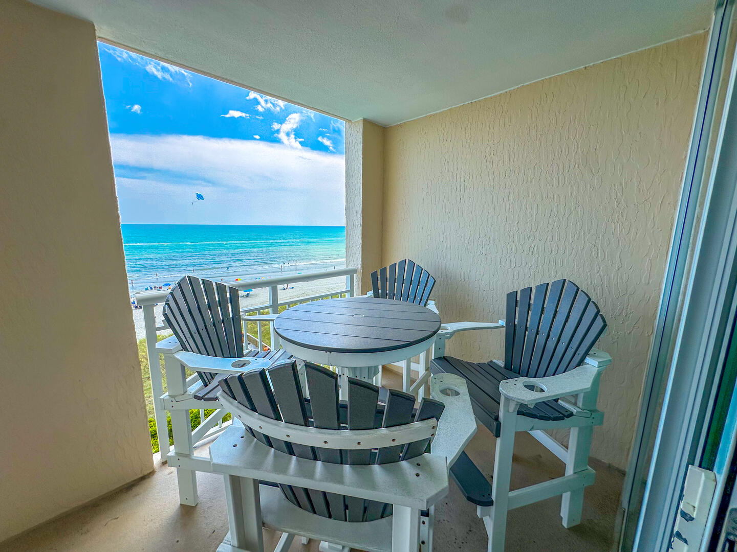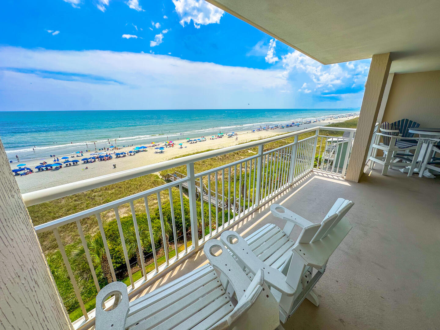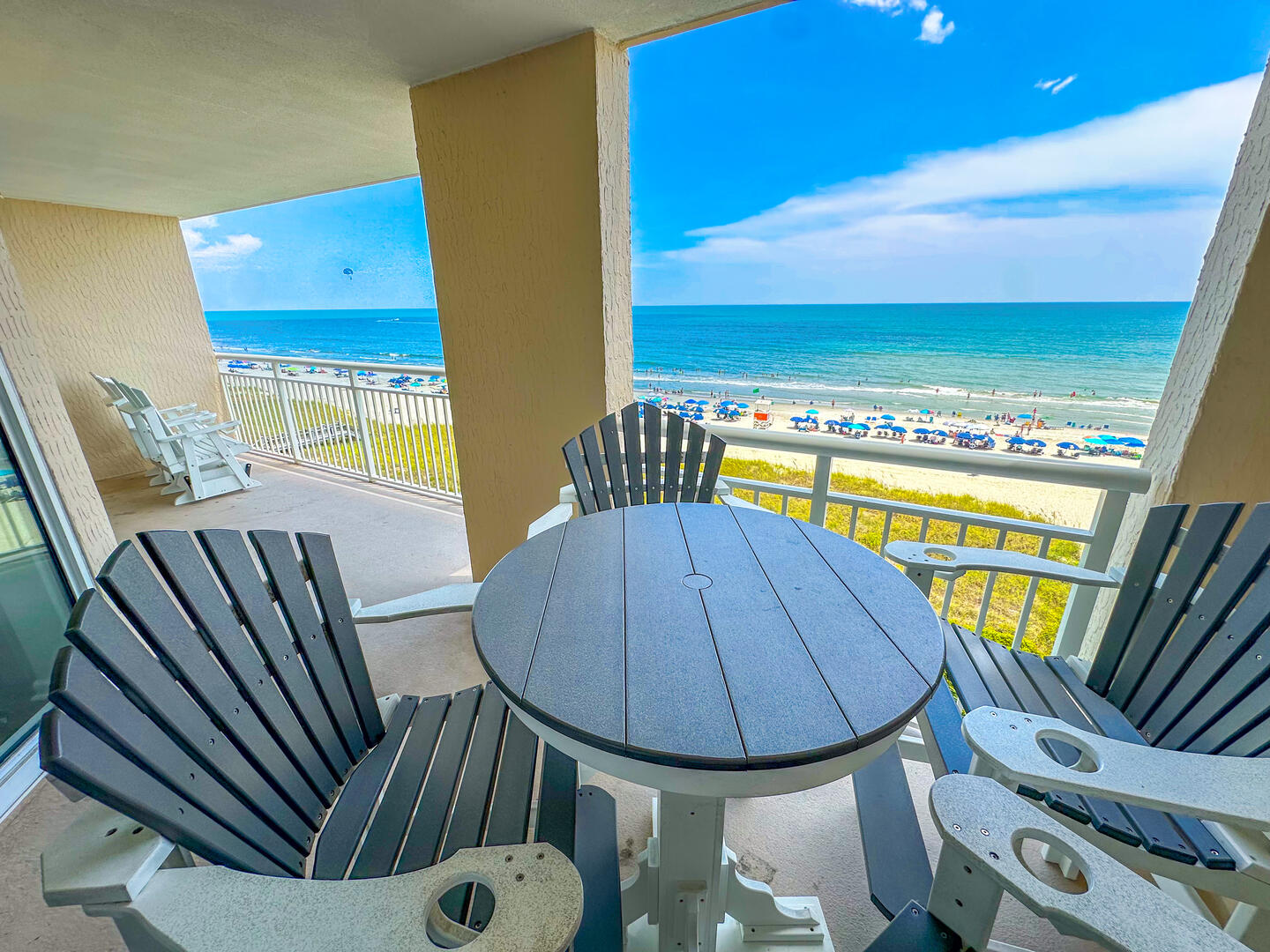 Discover peace and coastal elegance at South Shore Villas 503 a spacious 2-bedroom, 2-bath oceanfront condo offering 1,525 sq. ft. of pure relaxation. Perched on the 5th floor, this serene escape combines breathtaking Atlantic Ocean views with all the modern comforts of home — perfect for couples, small families, or anyone seeking a peaceful beach retreat. Step into a bright, open-concept living area featuring a large flat-screen TV, ceiling fan, and complimentary Wi-Fi. The floor-to-ceiling glass doors open to an expansive 25-foot private balcony, shared with the master suite making it the perfect spot for your morning coffee or evening glass of wine as the waves roll in. The fully equipped kitchen includes granite countertops, a breakfast bar, full-size appliances, a Keurig coffee maker, and a washer and dryer for convenience during extended stays. Bedrooms & Baths: