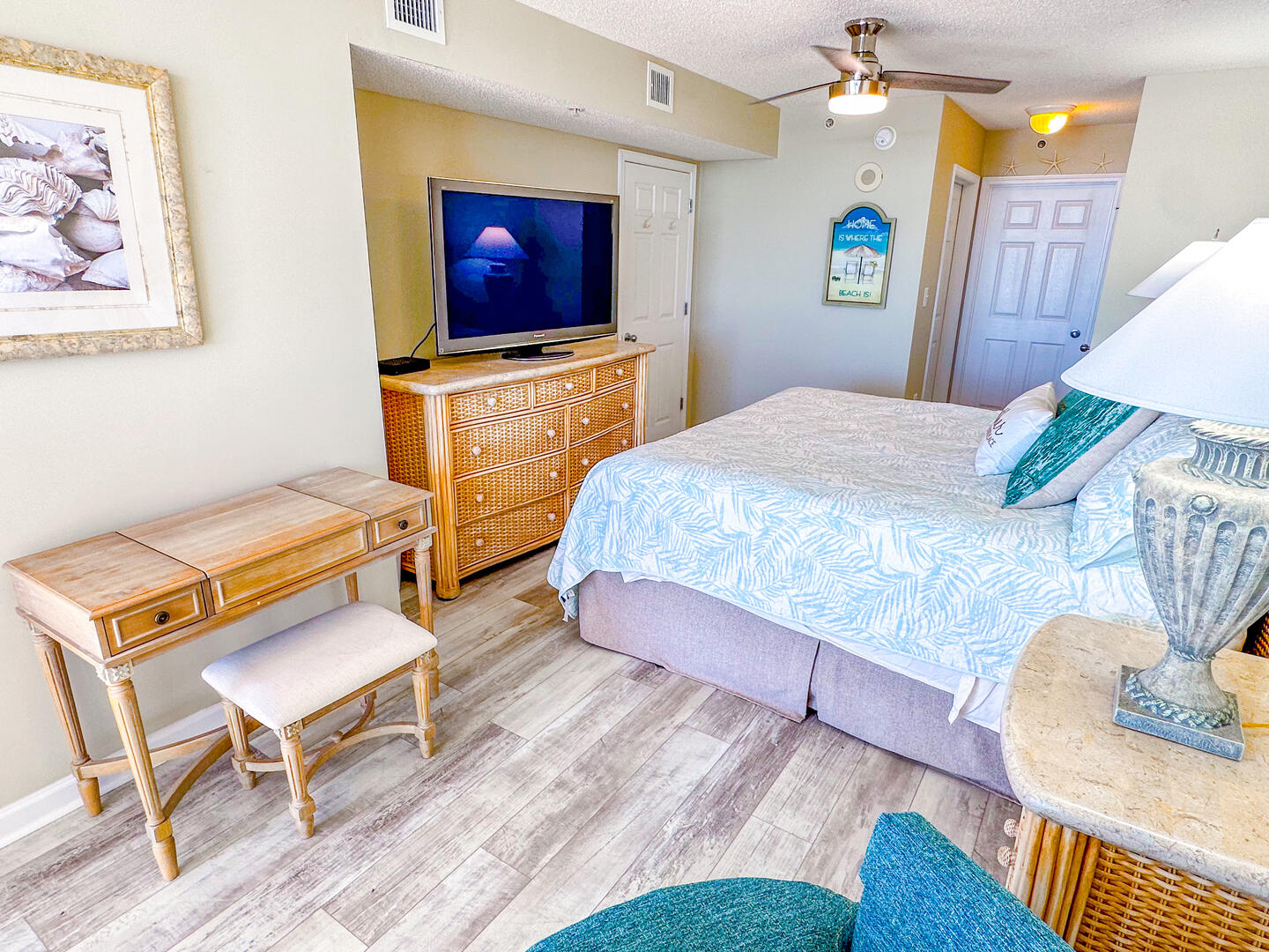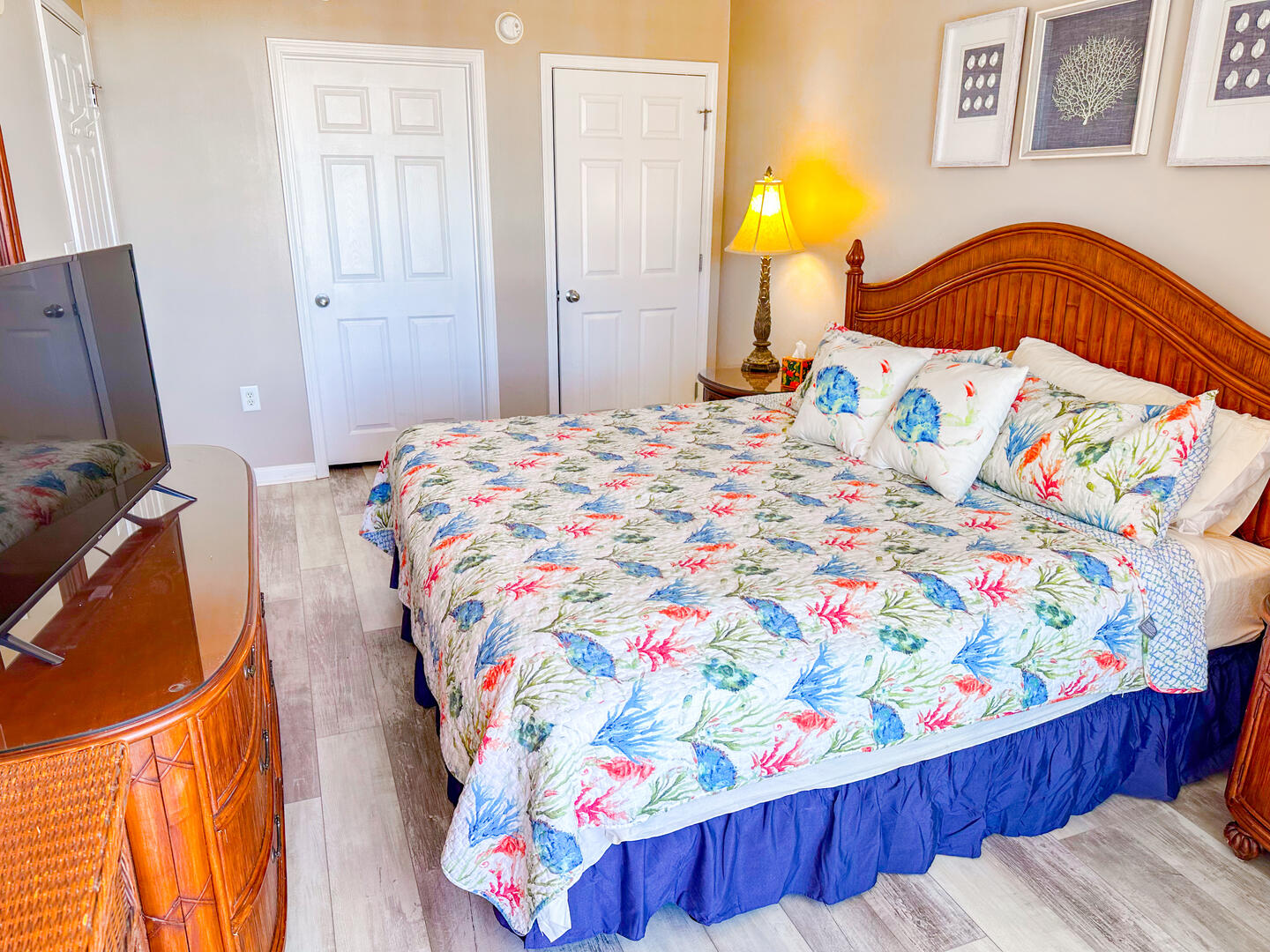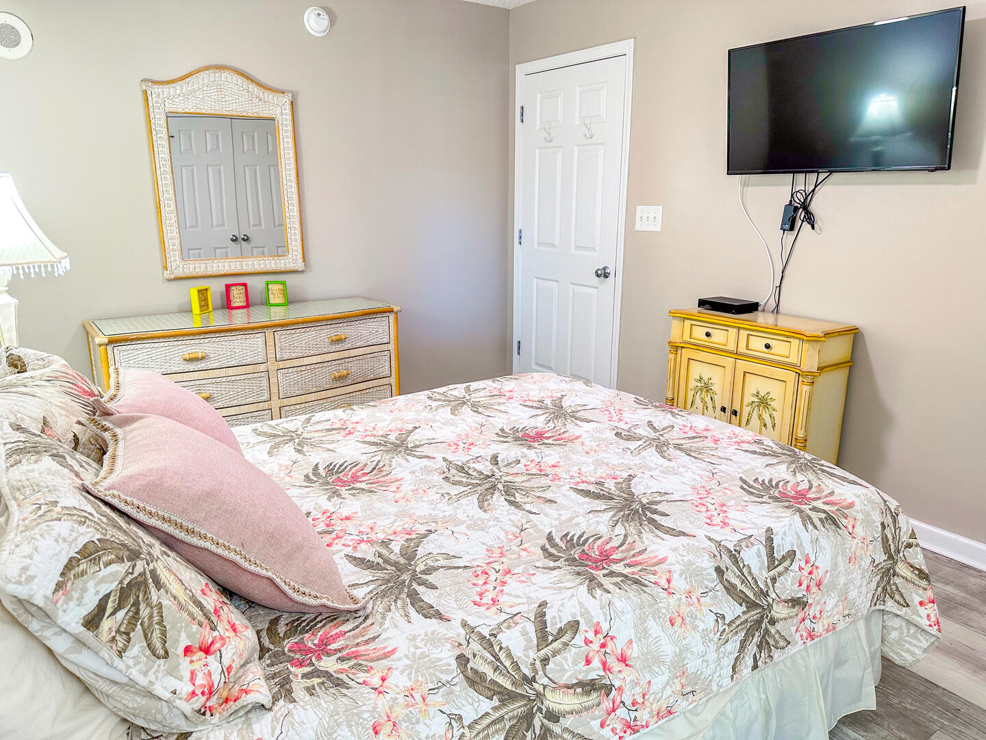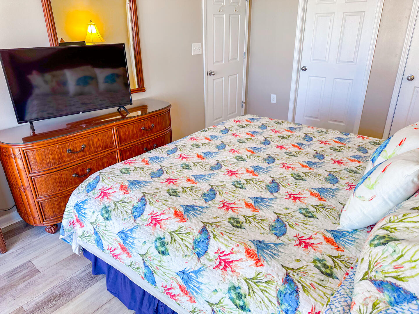 • Bedroom 2: King bed, TV, and shared Jack-and-Jill bath.