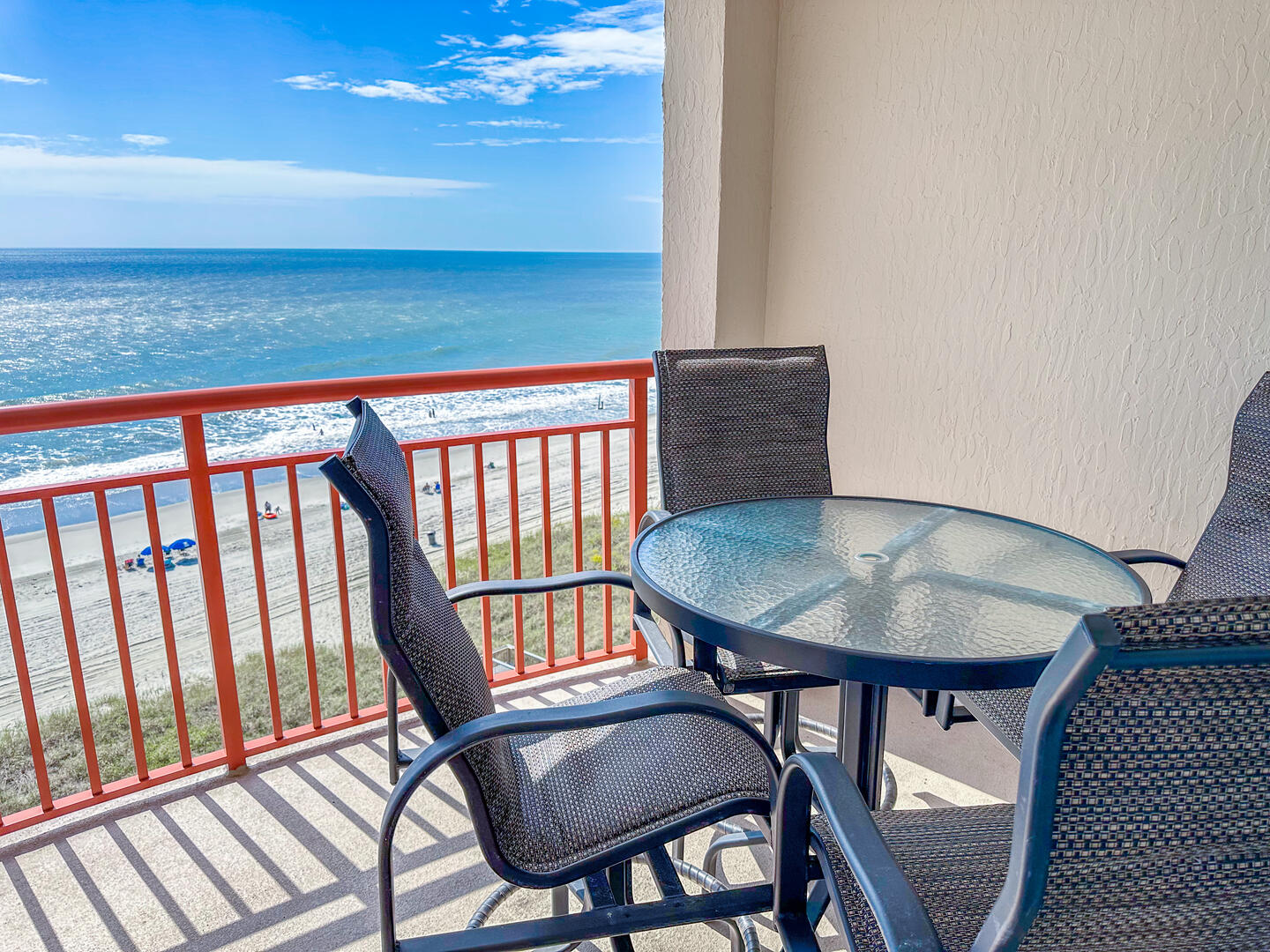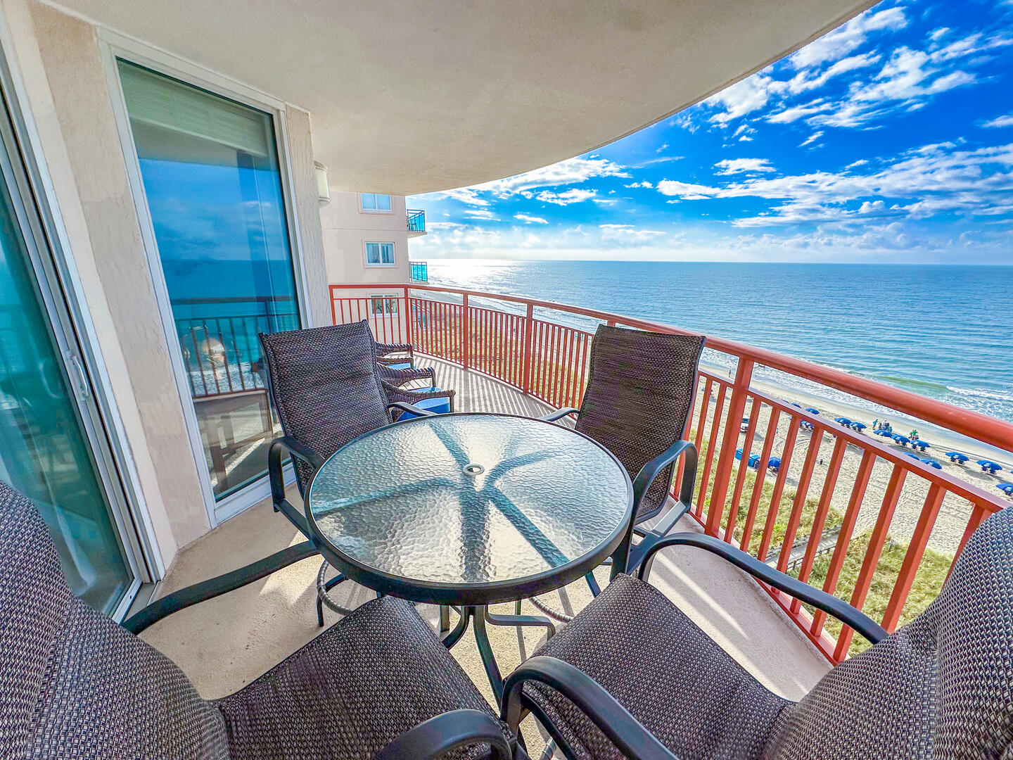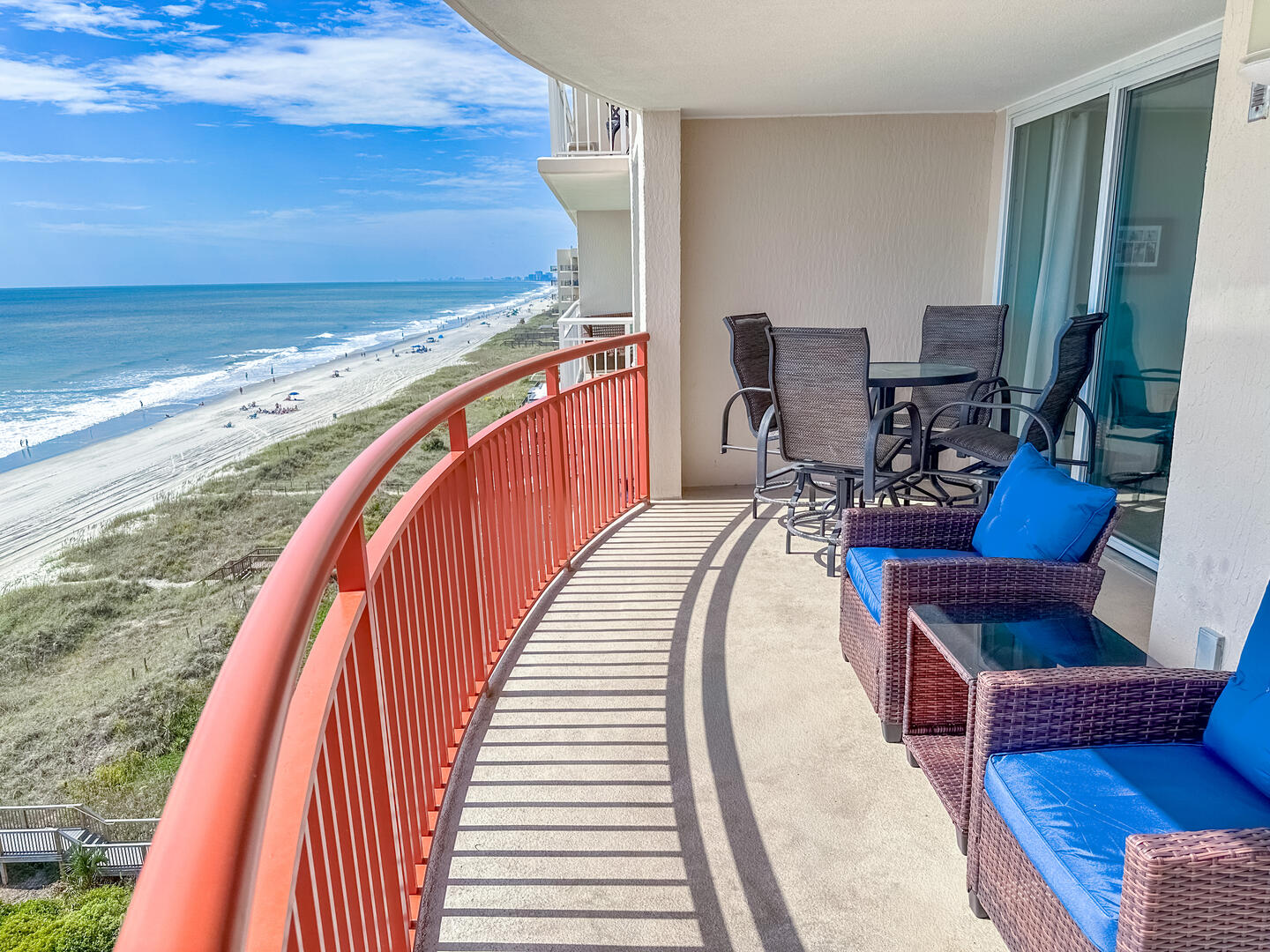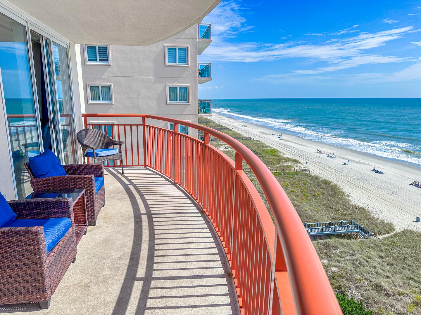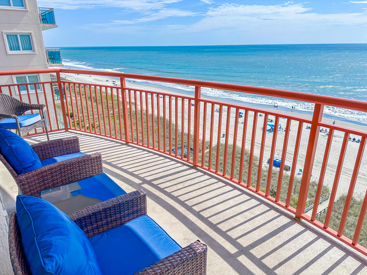 The open-concept living area invites relaxation, featuring a comfortable leather recliner, flat-screen TV, ceiling fan, and complimentary Wi-Fi. Floor-to-ceiling glass doors lead to a spacious 25-foot private balcony, accessible from both the living room and master suite, where you can enjoy breathtaking sunrises and ocean breezes all day long. The fully equipped kitchen offers granite countertops, a breakfast bar, and full-size appliances — including a washer and dryer — providing everything you need for a stress-free stay.Bedrooms & Baths: