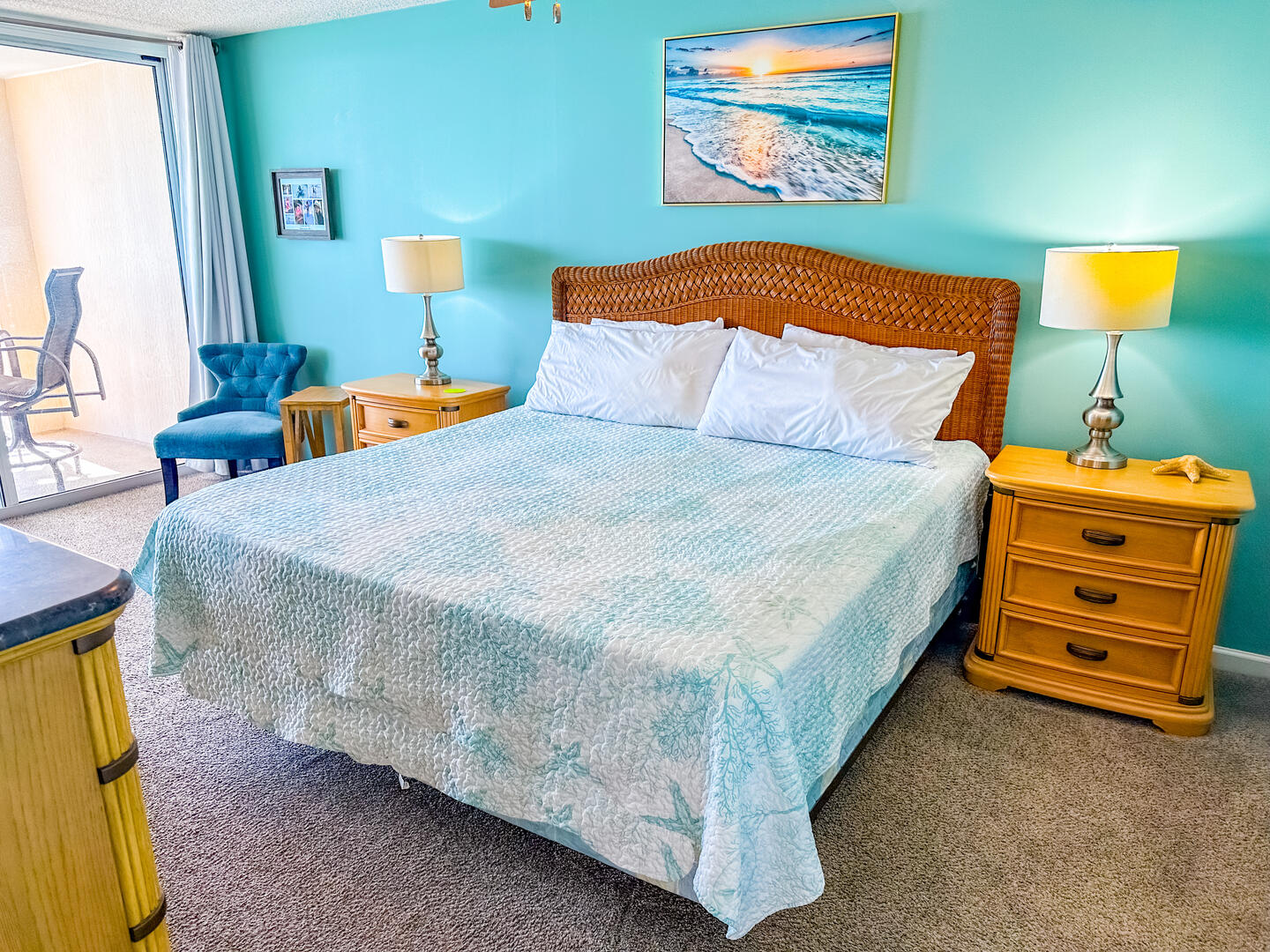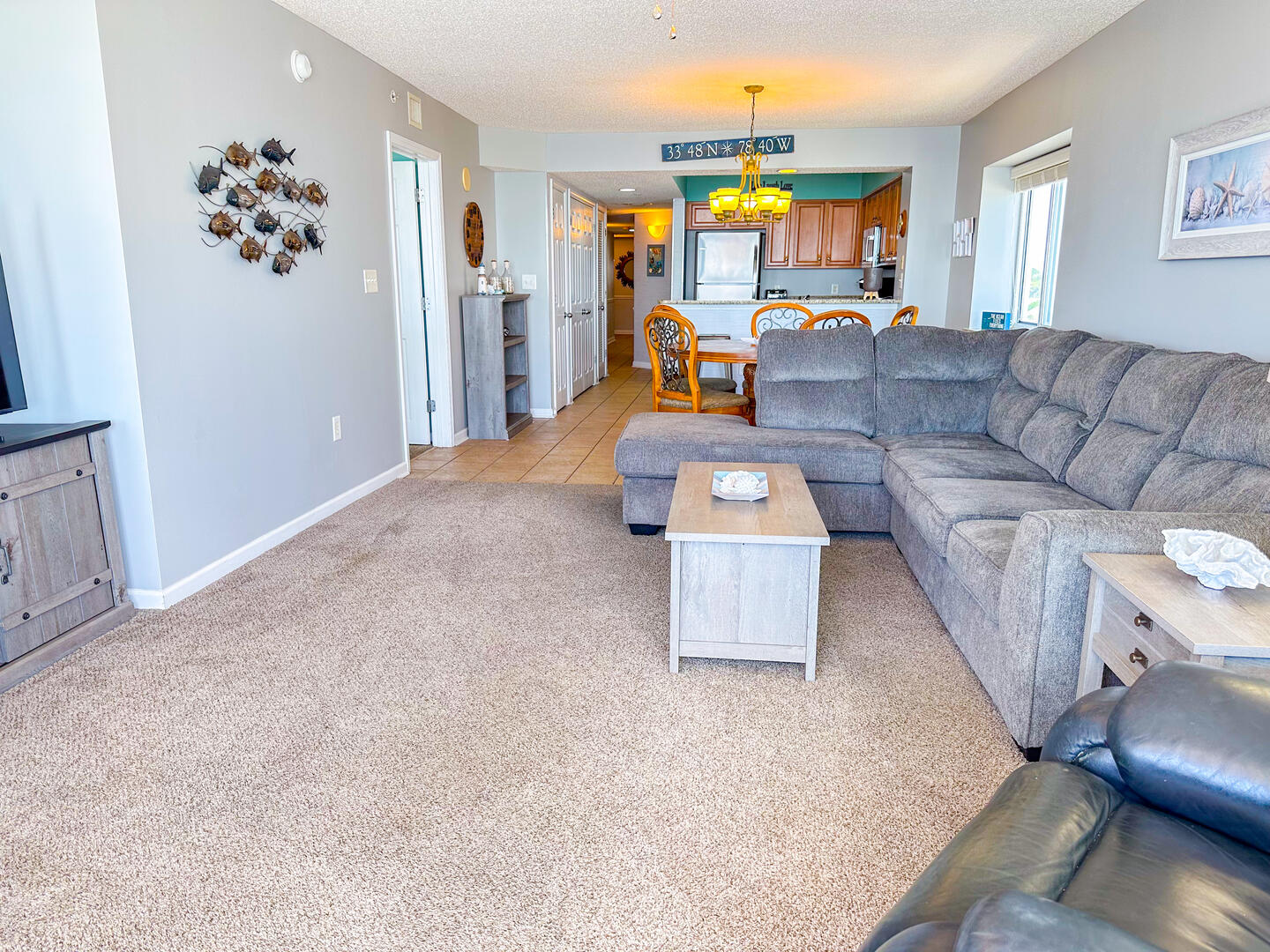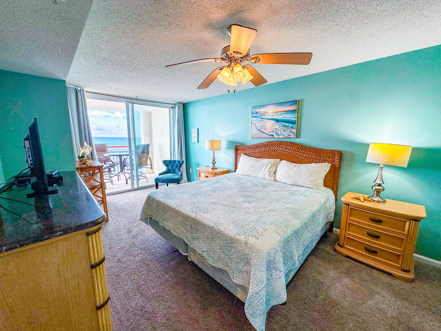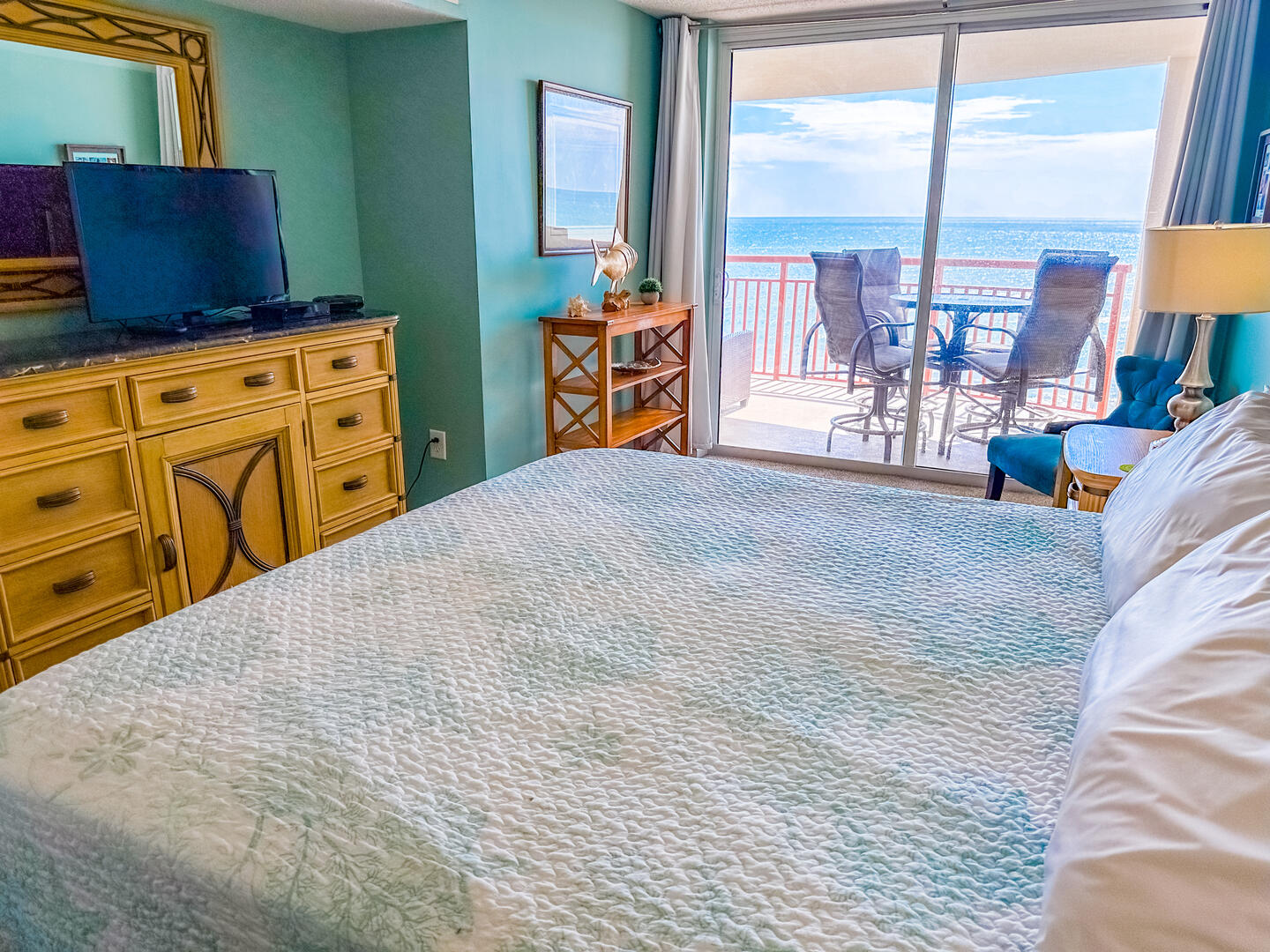 The open-concept living area invites relaxation, featuring a comfortable leather recliner, flat-screen TV, ceiling fan, and complimentary Wi-Fi. Floor-to-ceiling glass doors lead to a spacious 25-foot private balcony, accessible from both the living room and master suite, where you can enjoy breathtaking sunrises and ocean breezes all day long. The fully equipped kitchen offers granite countertops, a breakfast bar, and full-size appliances — including a washer and dryer — providing everything you need for a stress-free stay.Bedrooms & Baths:
