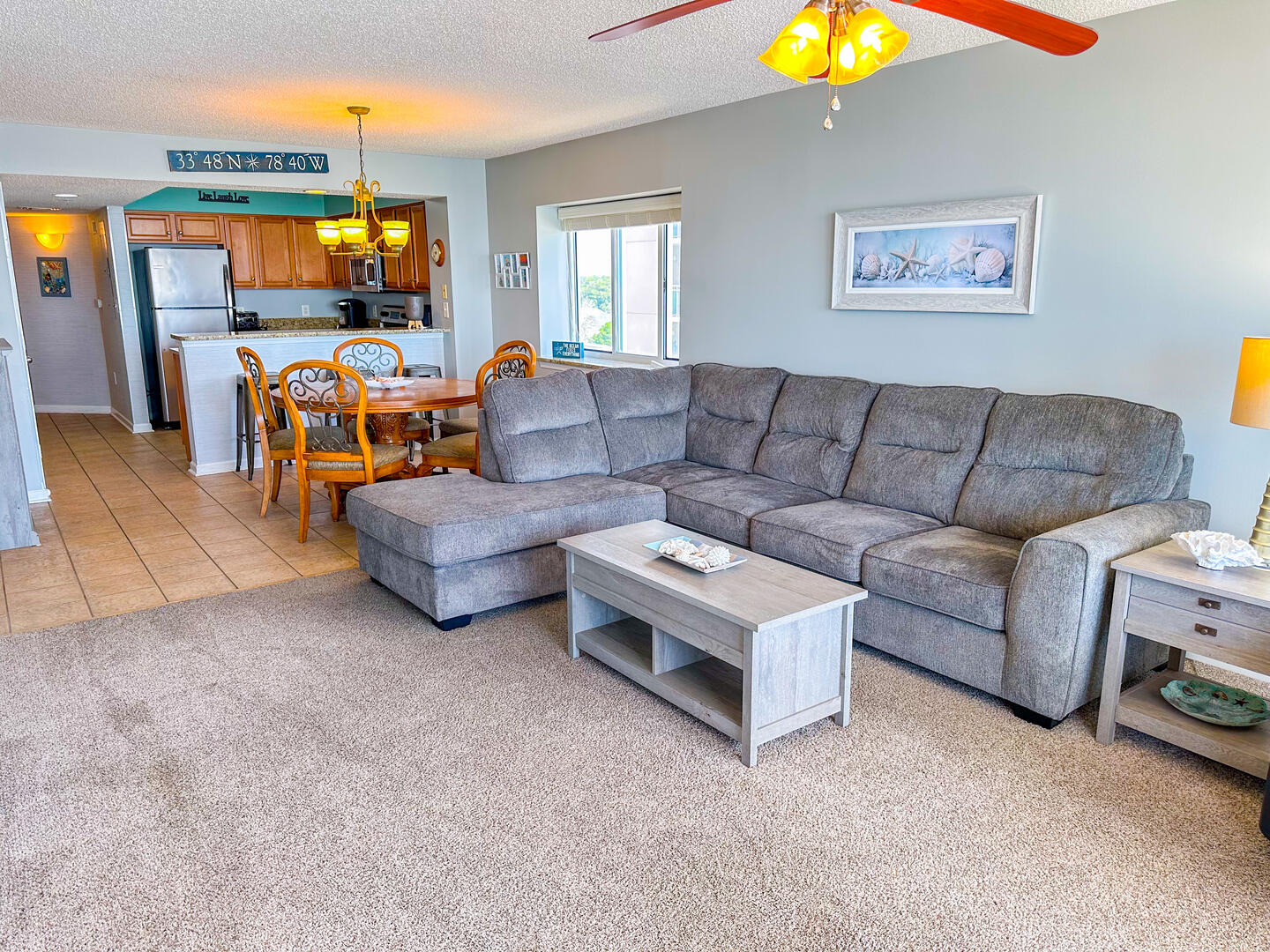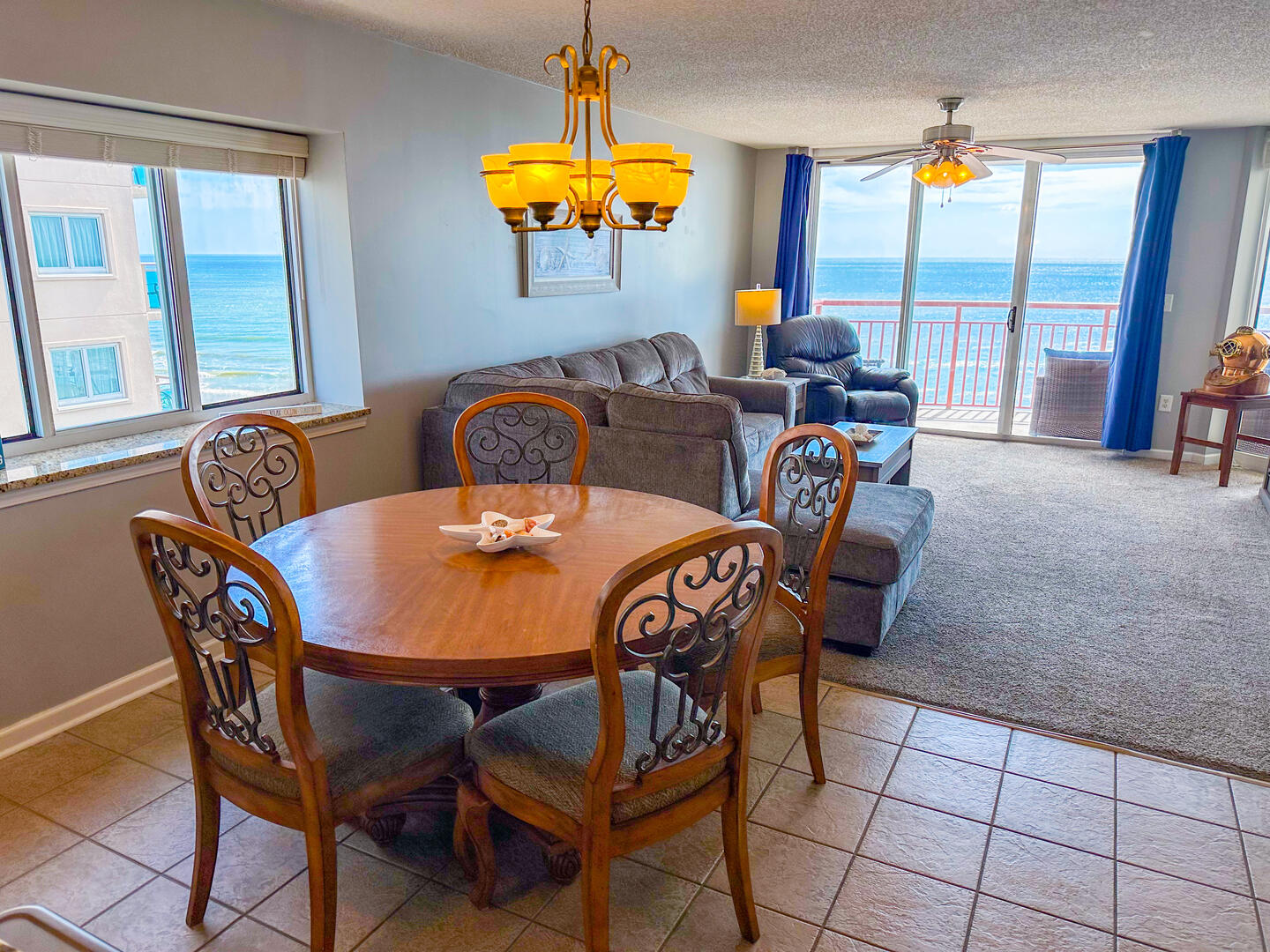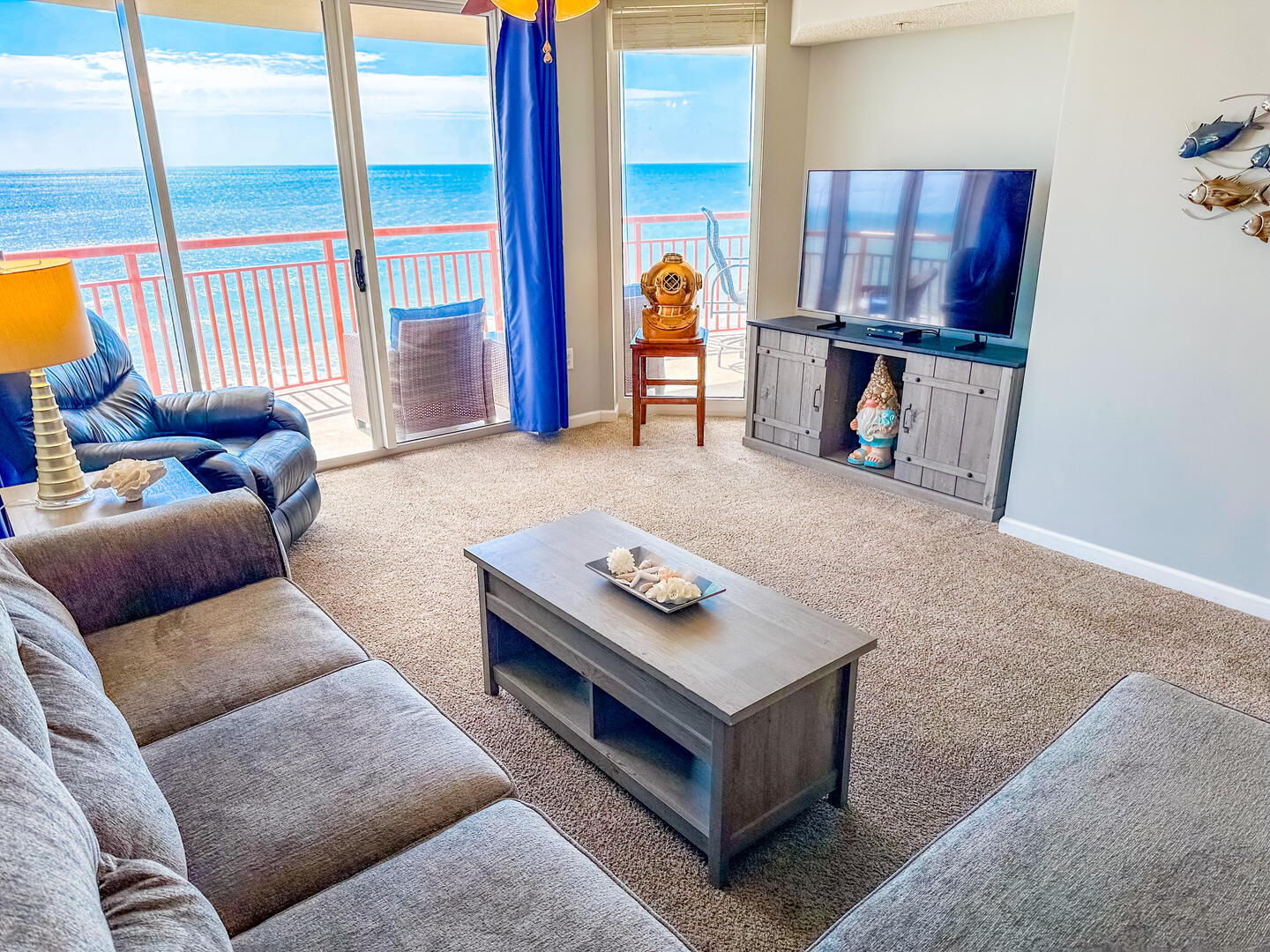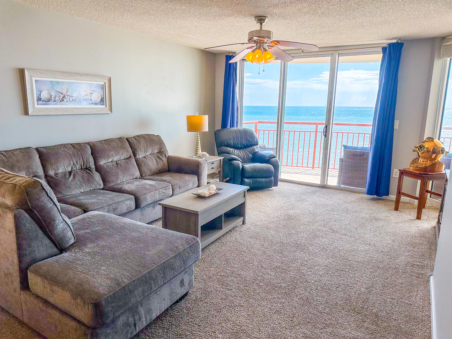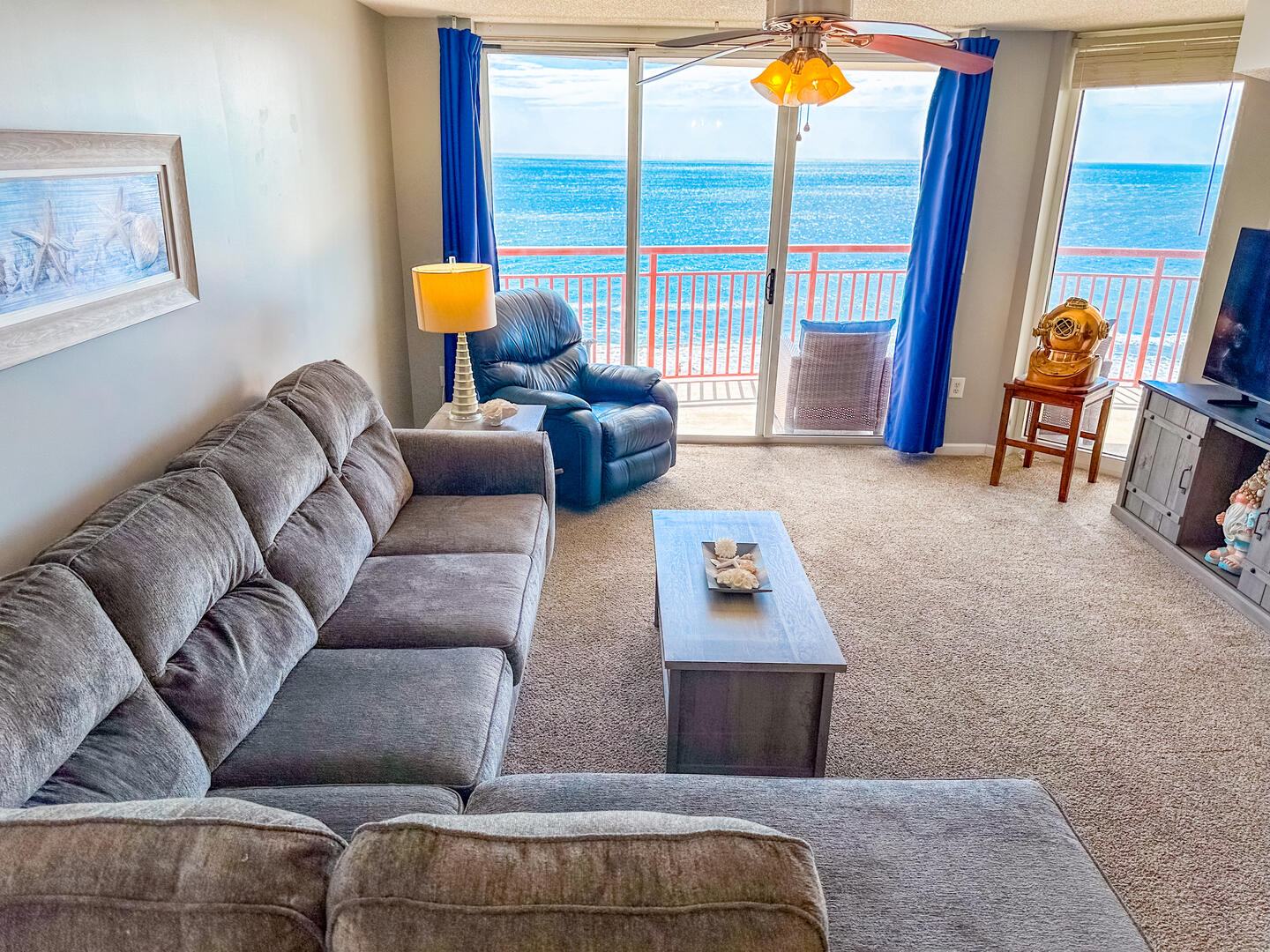 The open-concept living area invites relaxation, featuring a comfortable leather recliner, flat-screen TV, ceiling fan, and complimentary Wi-Fi. Floor-to-ceiling glass doors lead to a spacious 25-foot private balcony, accessible from both the living room and master suite, where you can enjoy breathtaking sunrises and ocean breezes all day long. The fully equipped kitchen offers granite countertops, a breakfast bar, and full-size appliances — including a washer and dryer — providing everything you need for a stress-free stay.Bedrooms & Baths: