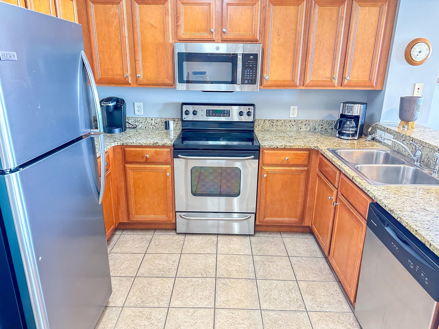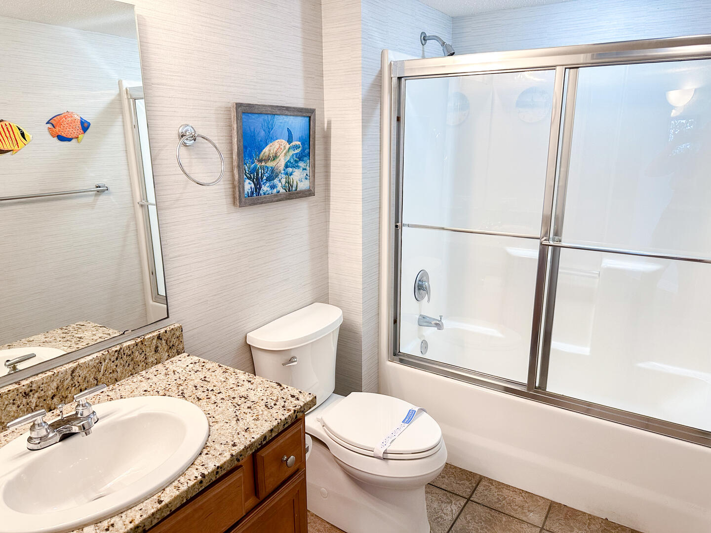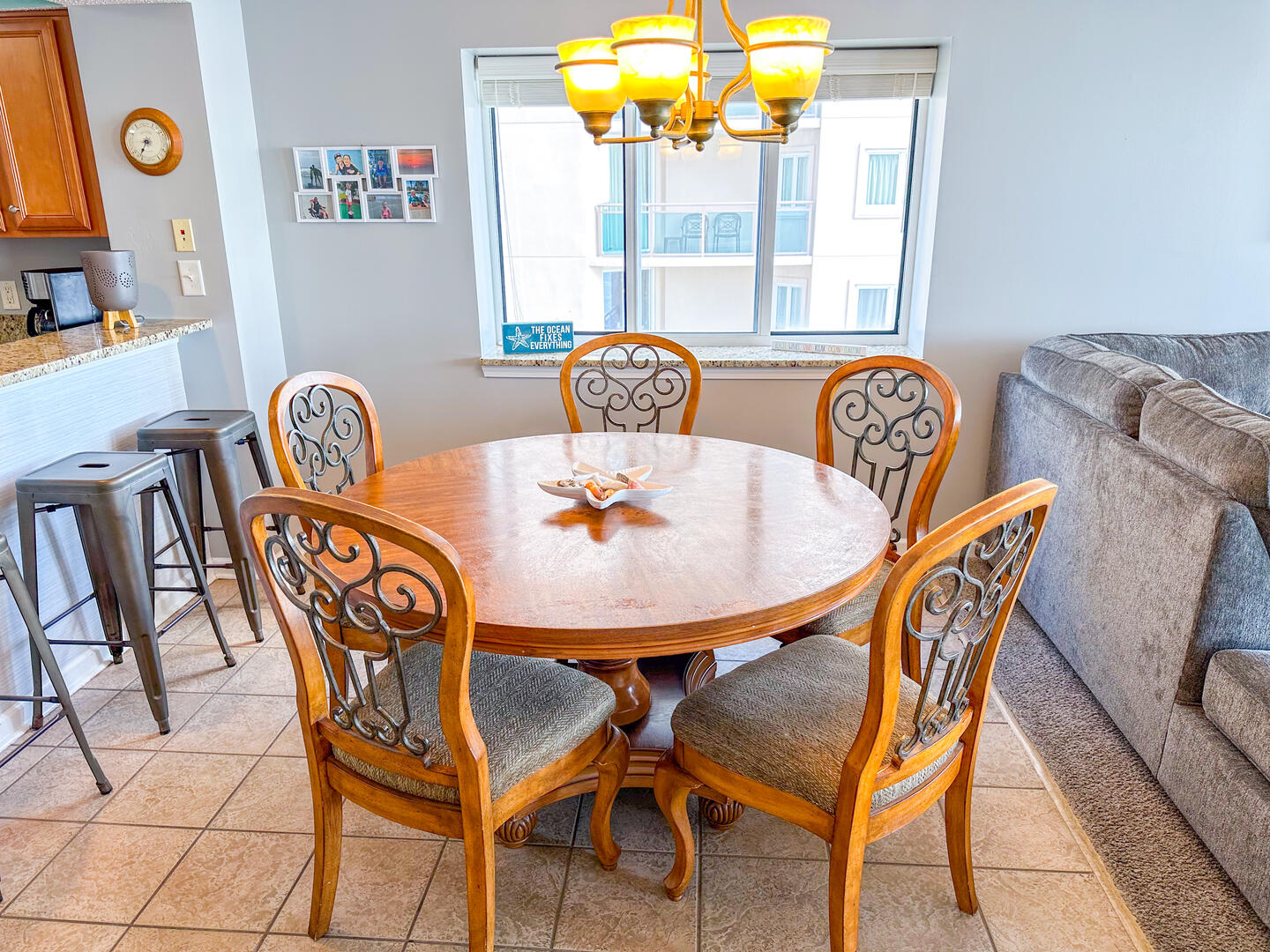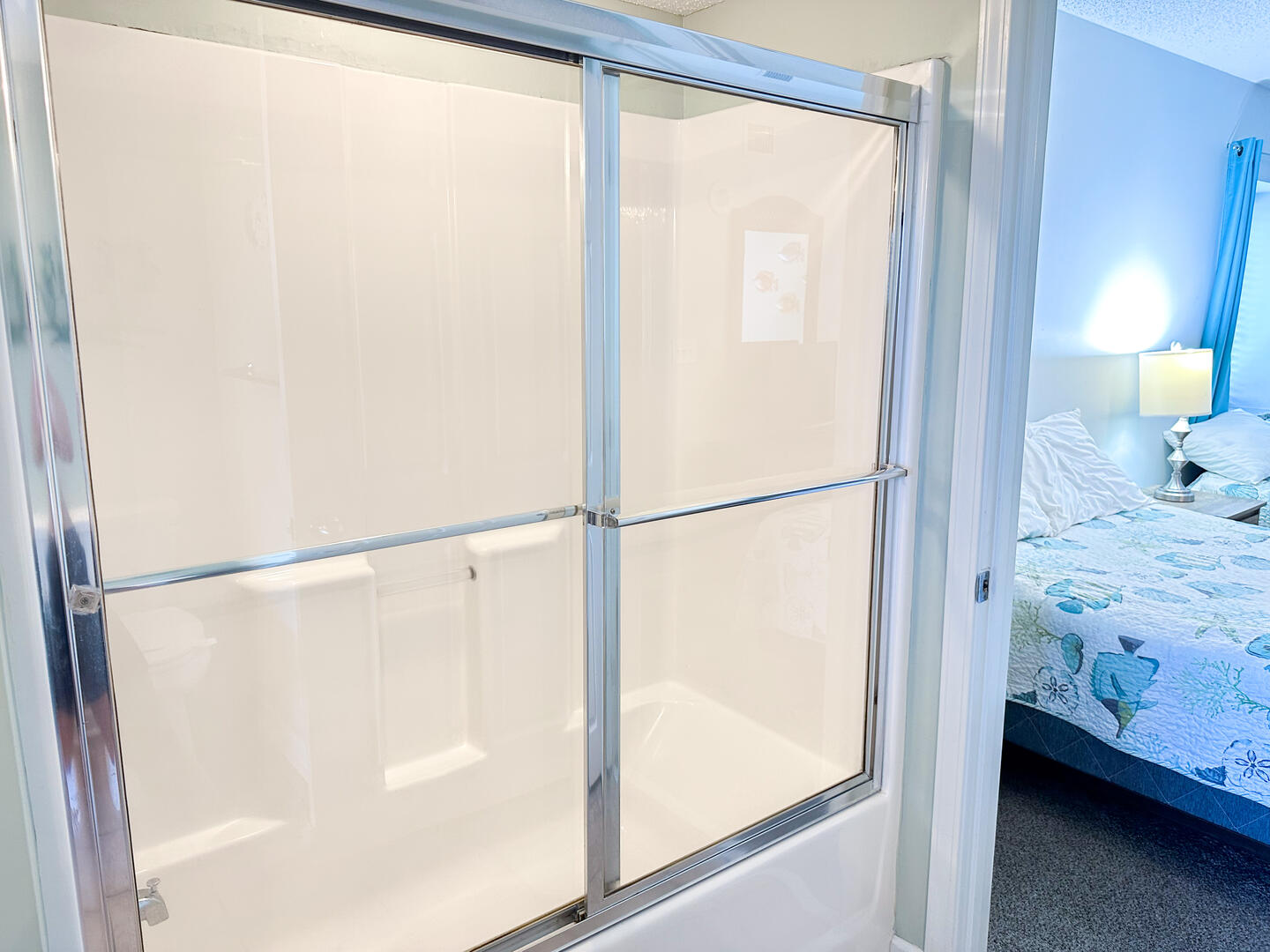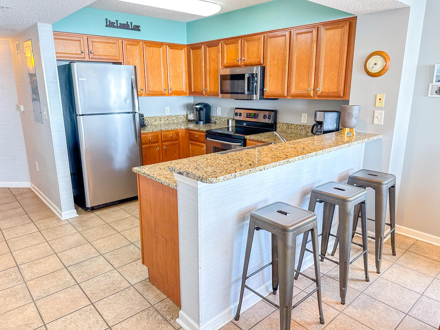 The open-concept living area invites relaxation, featuring a comfortable leather recliner, flat-screen TV, ceiling fan, and complimentary Wi-Fi. Floor-to-ceiling glass doors lead to a spacious 25-foot private balcony, accessible from both the living room and master suite, where you can enjoy breathtaking sunrises and ocean breezes all day long. The fully equipped kitchen offers granite countertops, a breakfast bar, and full-size appliances — including a washer and dryer — providing everything you need for a stress-free stay.Bedrooms & Baths: