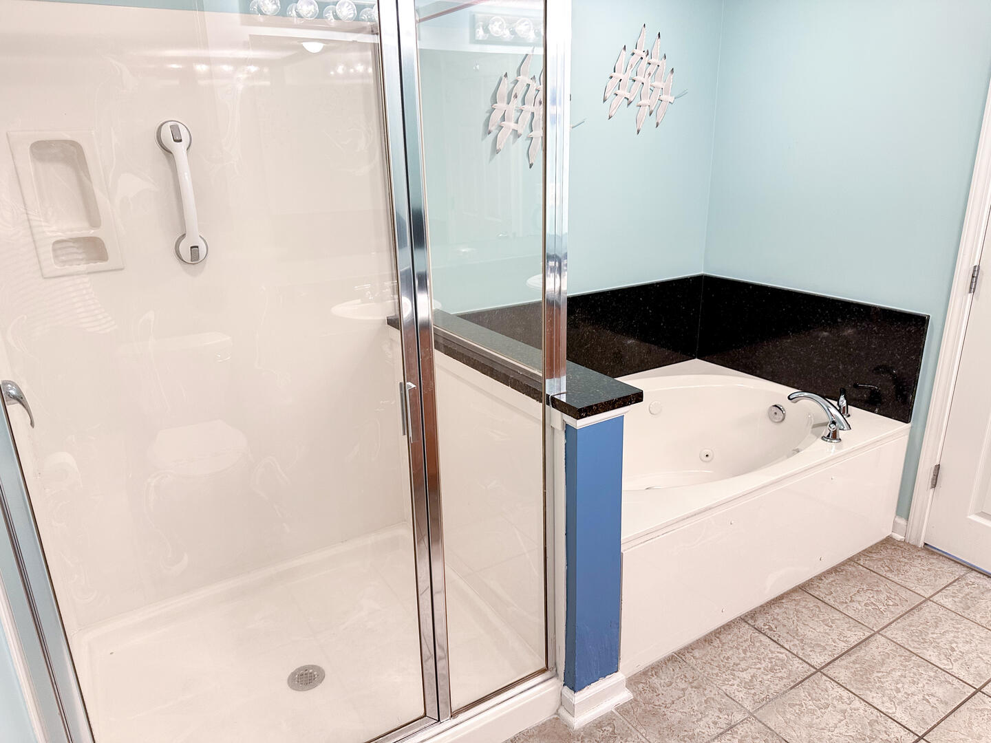• Bedroom 1: King bed, private balcony access, flat-screen TV, ceiling fan, and a luxurious en suite with double vanities, jacuzzi tub, and glass-enclosed shower.