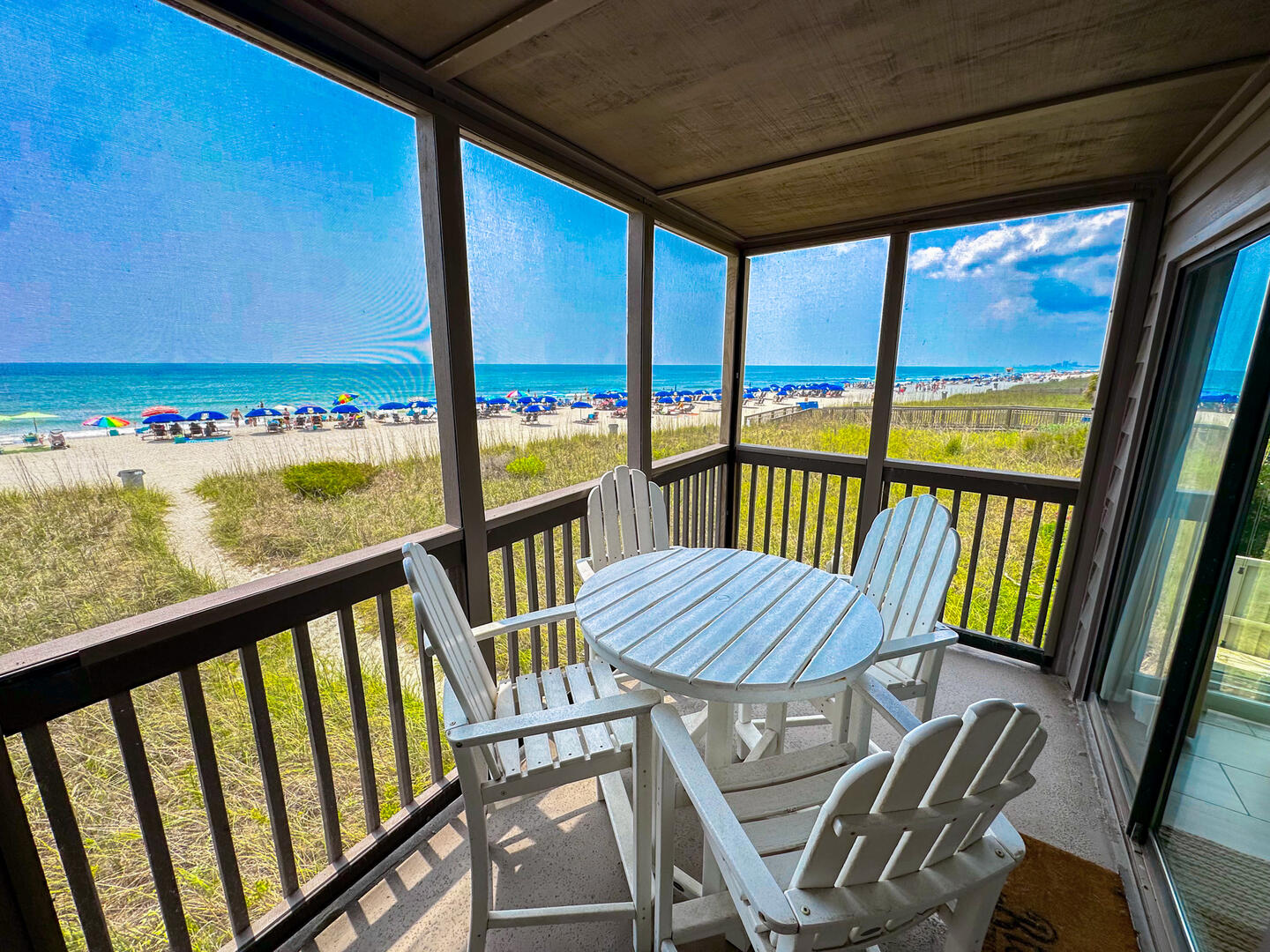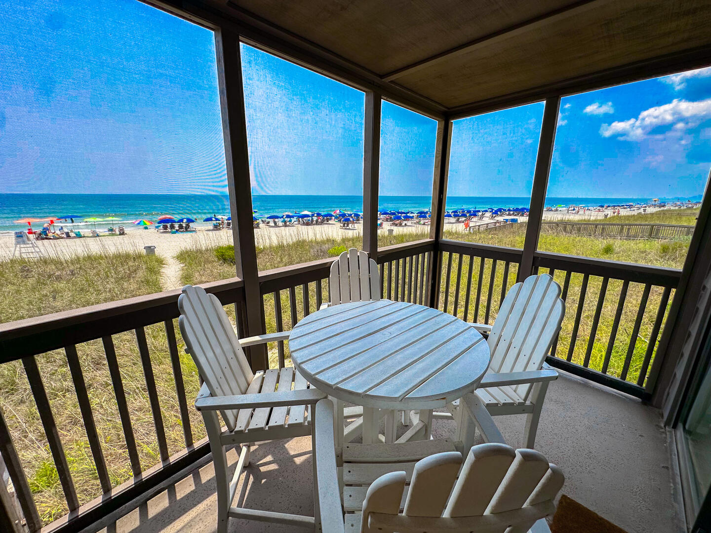 Inside, you'll find a bright, coastal-inspired living space with modern updates, a fully equipped kitchen, and a washer and dryer for added convenience. The screened-in oceanfront deck offers breathtaking 180° views ideal for sunrise coffee or relaxing evenings by the sea. Long-term stays (one month or more) are welcome, making this the perfect place for your extended North Myrtle Beach getaway.Bedrooms & Baths: