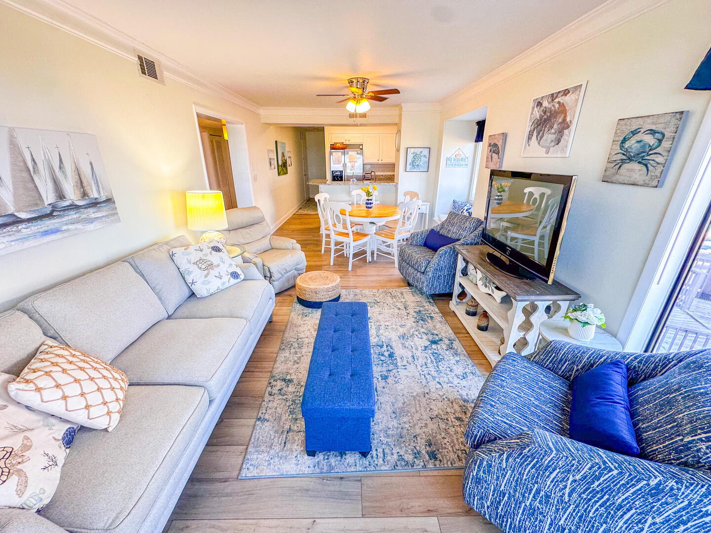 Experience the perfect blend of coastal charm and convenience at Tilghman Beach & Racquet Club 108, a beautifully appointed oceanfront 3-bedroom, 2.5-bath condo located on the first floor of Building 2. With direct beach access, a private screened-in balcony, and a bright, inviting layout, this oceanfront retreat is ideal for families, couples, and groups seeking comfort just steps from the sand. Relax in the spacious living area with a flat-screen TV and free Wi-Fi, or unwind on the screened balcony as you enjoy peaceful ocean views and the calming Carolina breeze.Enjoy the convenience of a fully equipped kitchen, complete with a microwave, dishwasher, and all the essential cookware needed to prepare meals with ease. Whether you're whipping up a quick breakfast or a full dinner, everything is right at your fingertips. For added comfort during extended stays, the in-unit washer and dryer make it simple to keep everything fresh without ever leaving your space.Bedrooms & Baths: