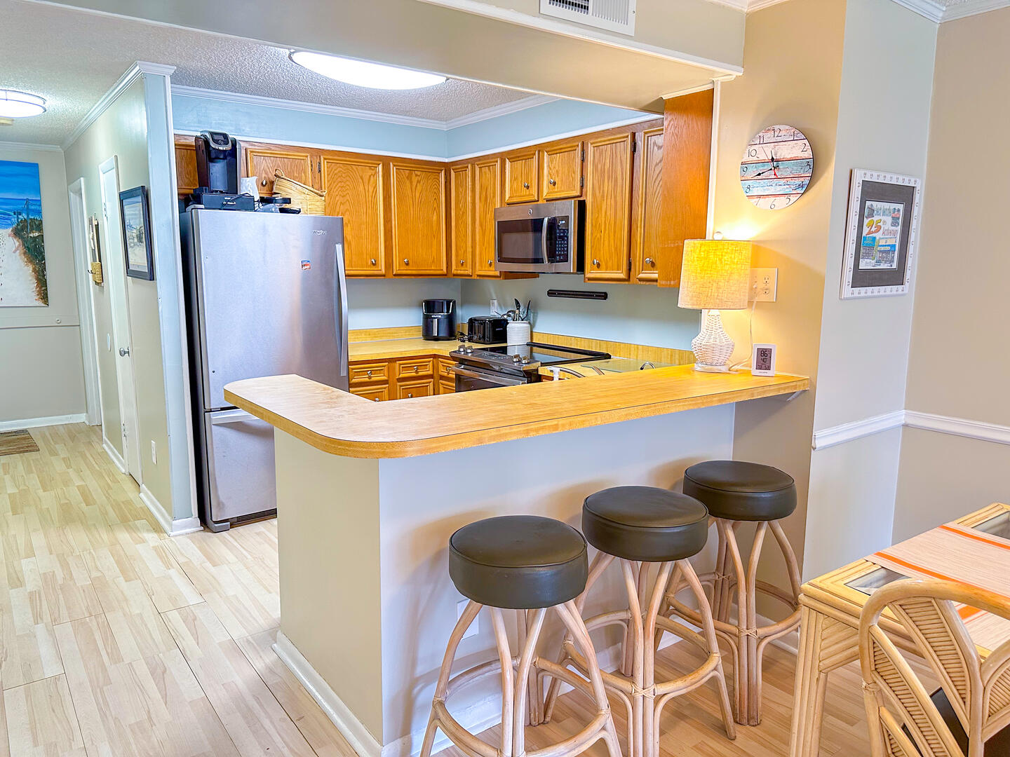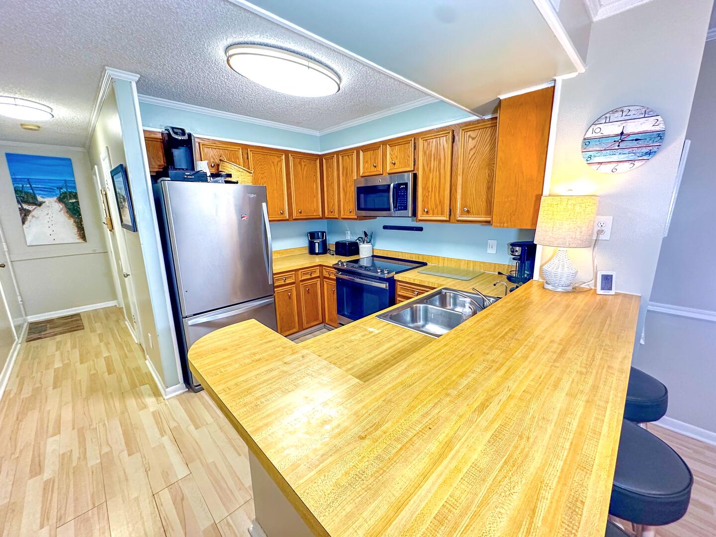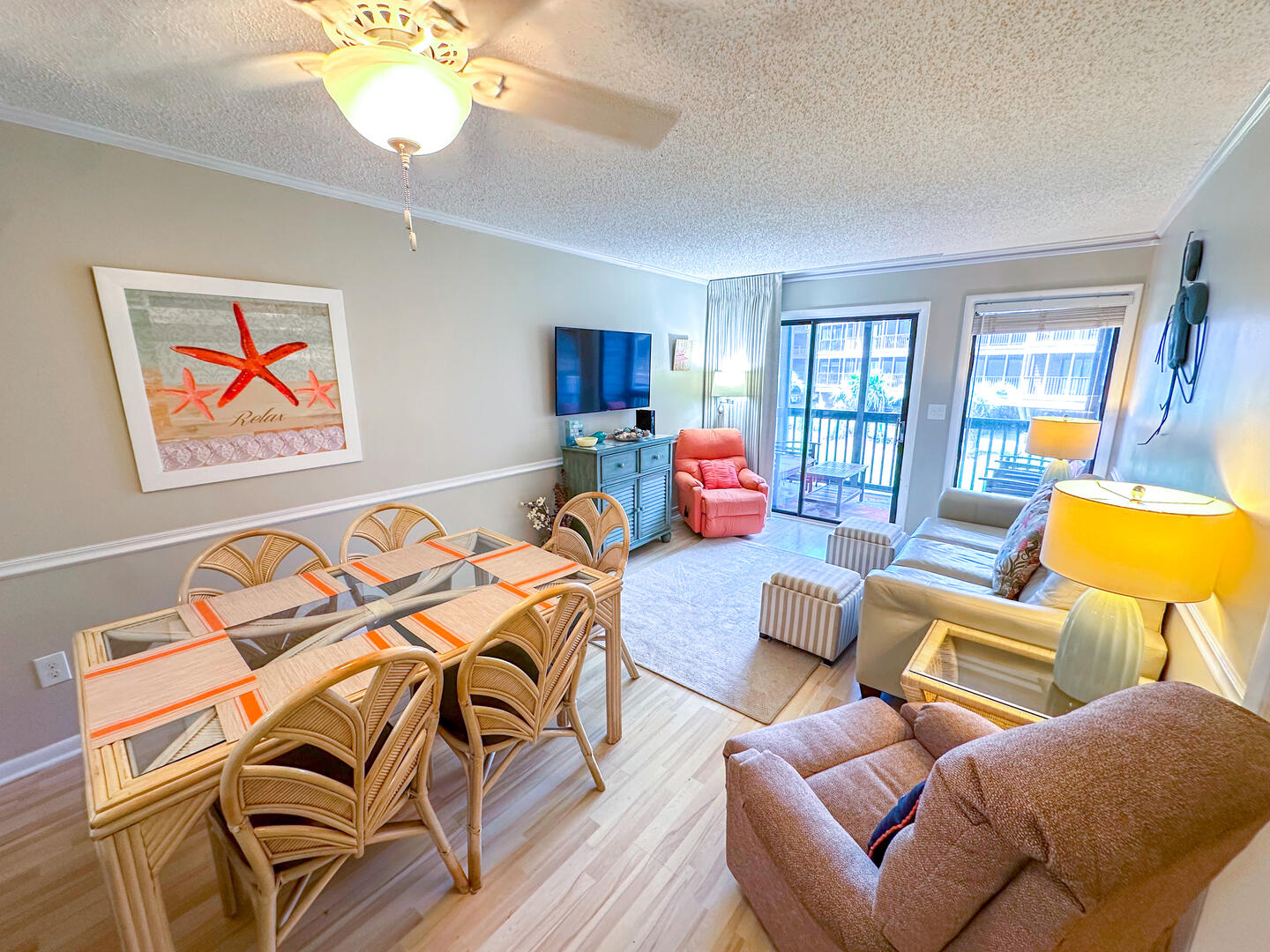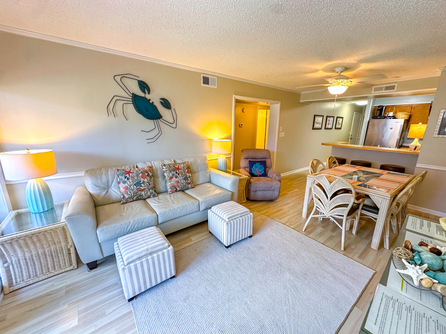 Enjoy the perfect blend of relaxation and prime location at Tilghman Beach & Racquet Club 117, a spacious 3-bedroom, 2.5-bath oceanview condo situated in the heart of North Myrtle Beach's Ocean Drive. Just steps from the beach and moments from Main Street's dining, shopping, and entertainment, this inviting retreat offers all the comforts of home with the added bonus of beautiful coastal views. Spend your mornings sipping coffee on one of two private oceanview balconies, accessible from both the living room and the master bedroom, while soaking in the refreshing Carolina breeze.This condo sleeps up to 6 guests comfortably with a king bed in the primary suite, a queen bed in the second bedroom, and two twin beds in the third. Relax with 4 flat-screen TVs and free Wi-Fi, or prepare meals in the fully equipped kitchen designed for easy and convenient in-unit dining. A washer and dryer ensure added convenience for longer stays, making this condo an ideal choice for families, couples, and small groups seeking a relaxing coastal escape.Bedrooms & Baths: