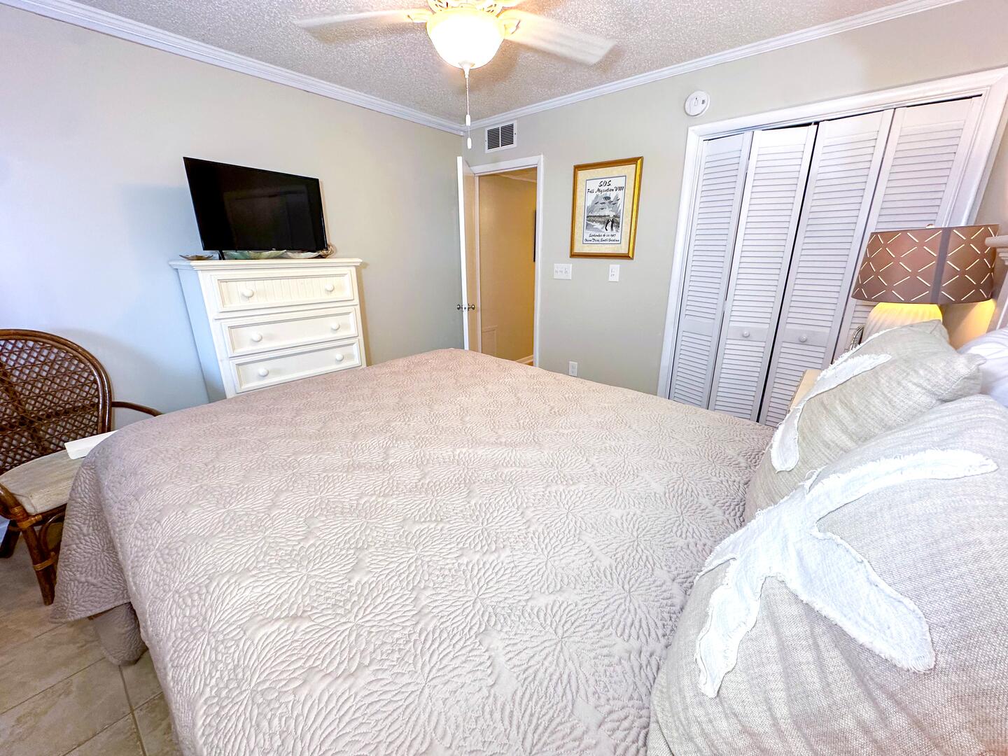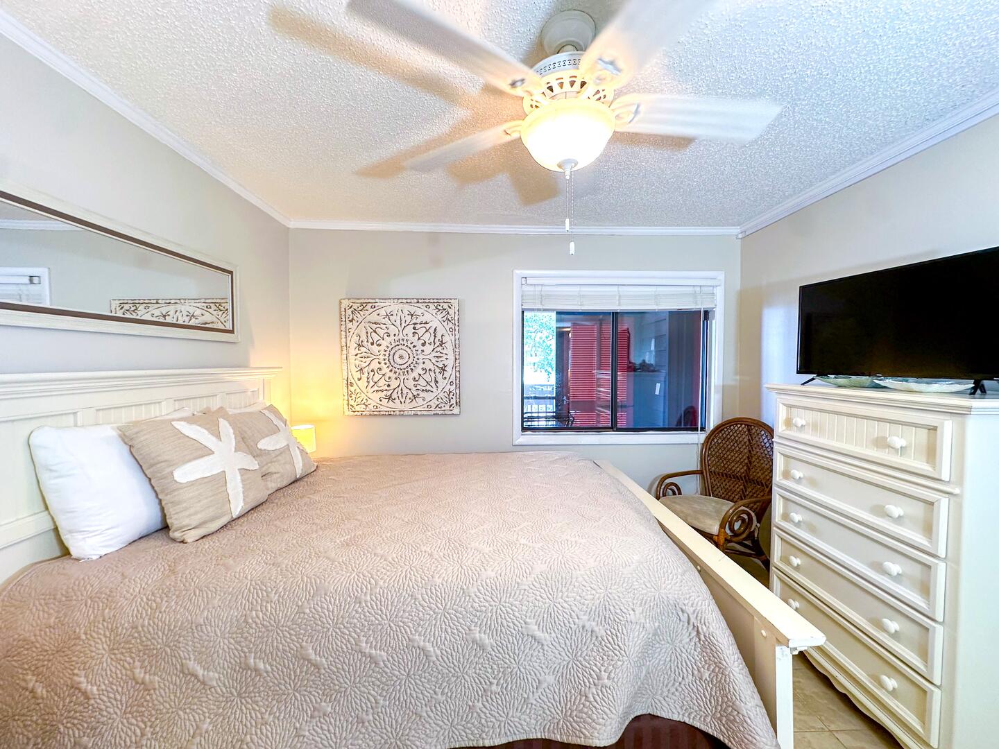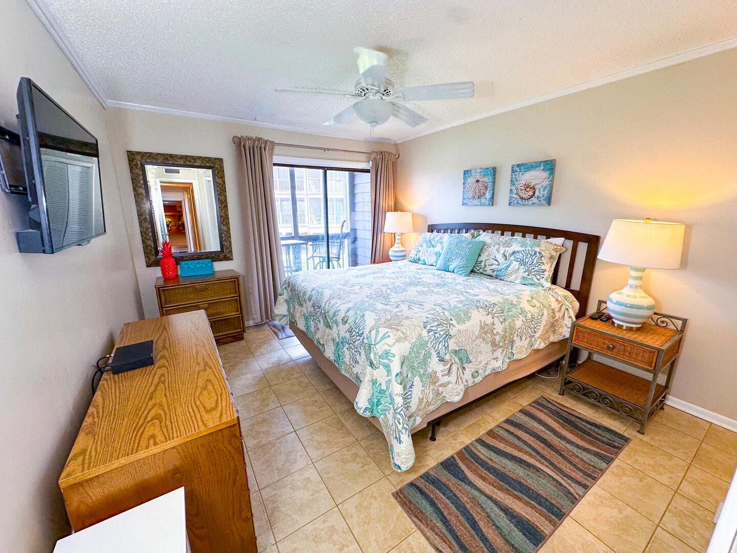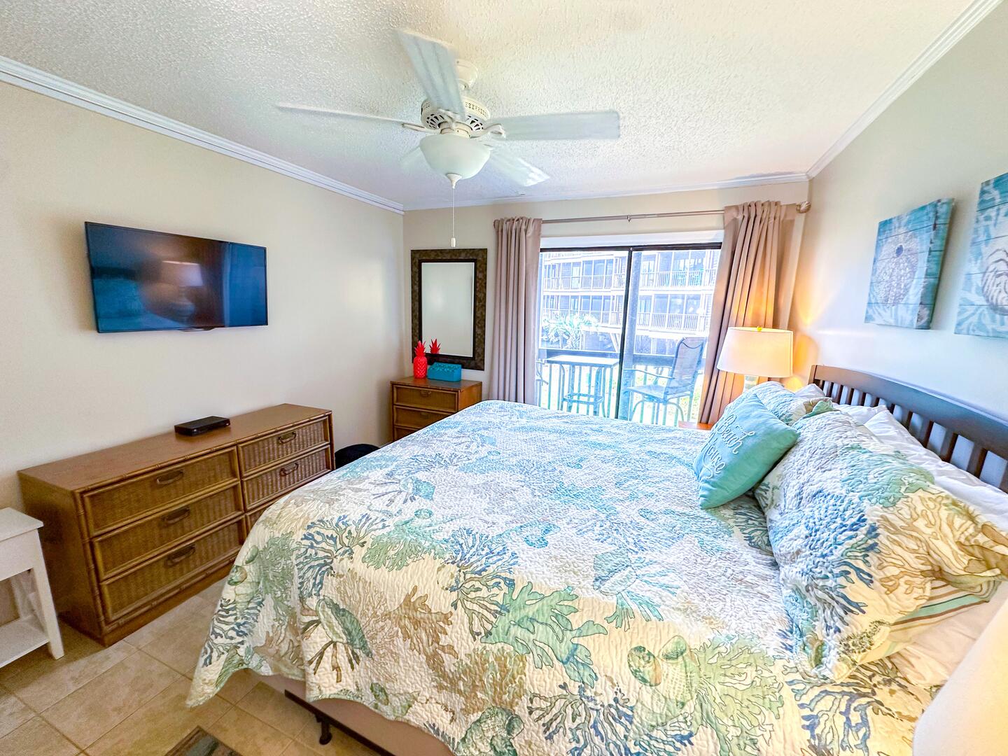 • Primary Bedroom: King bed + oceanview balcony access + flat-screen TV + ensuite bathroom