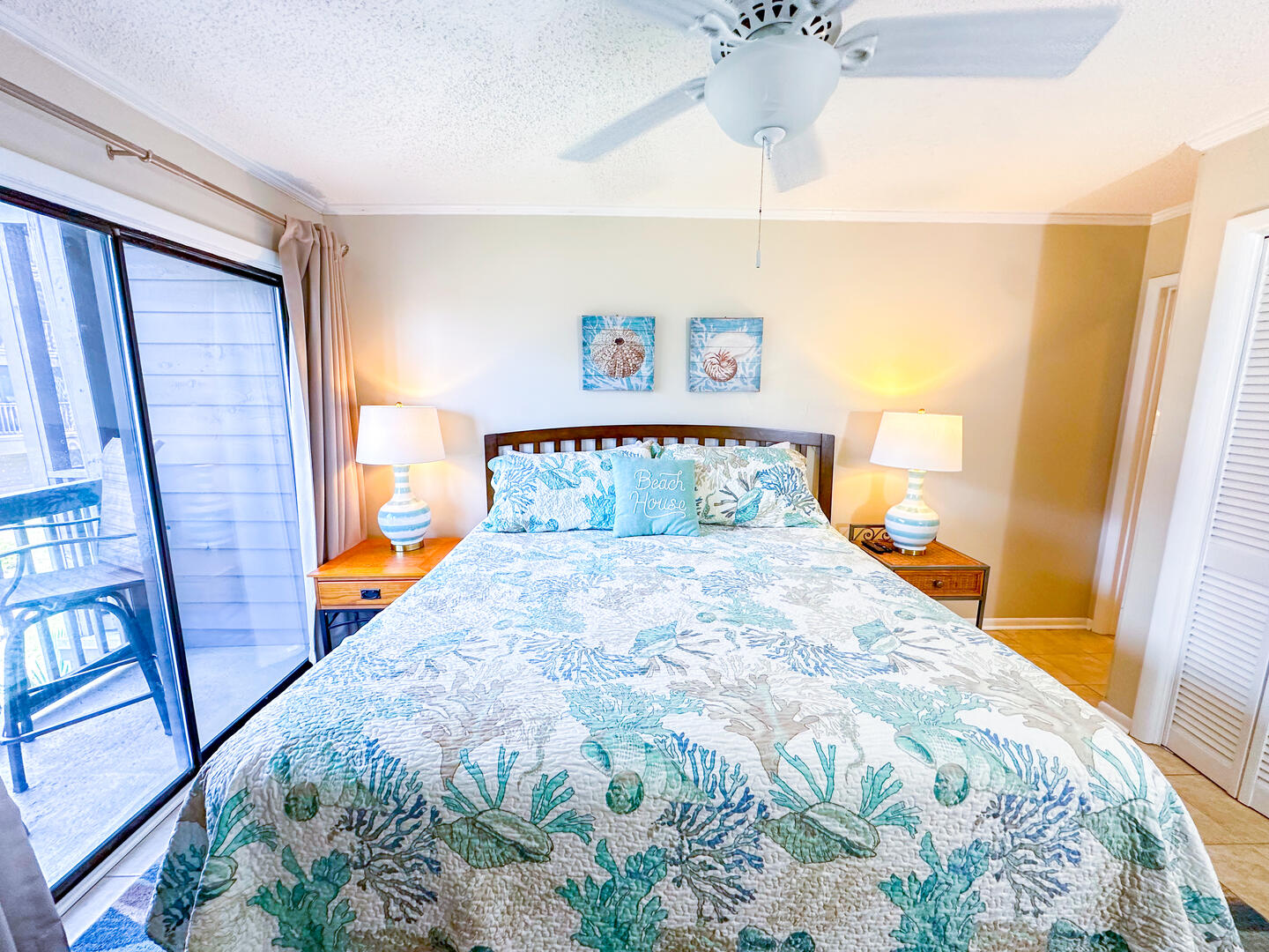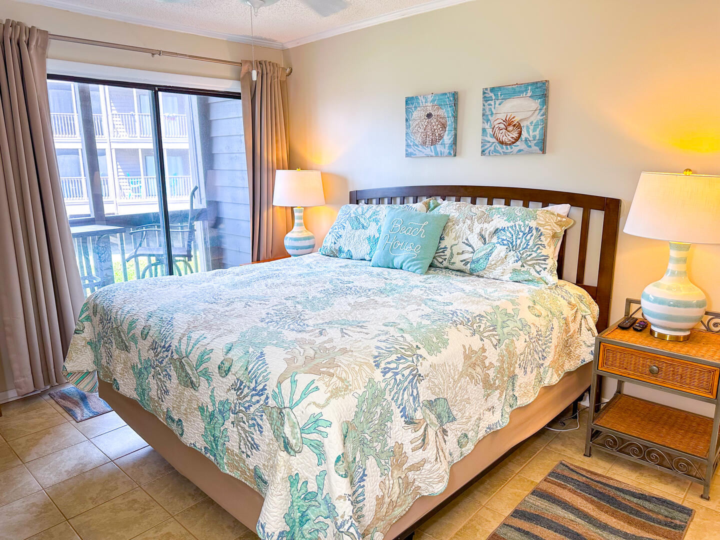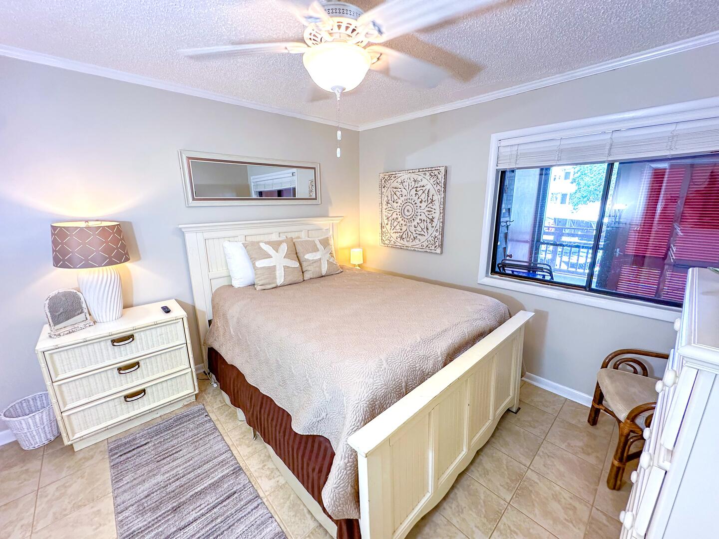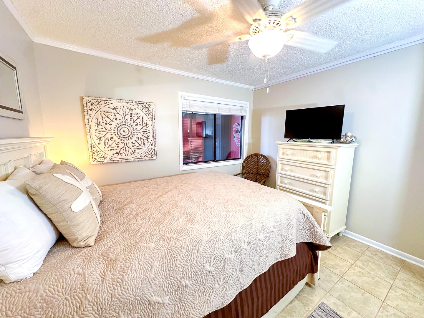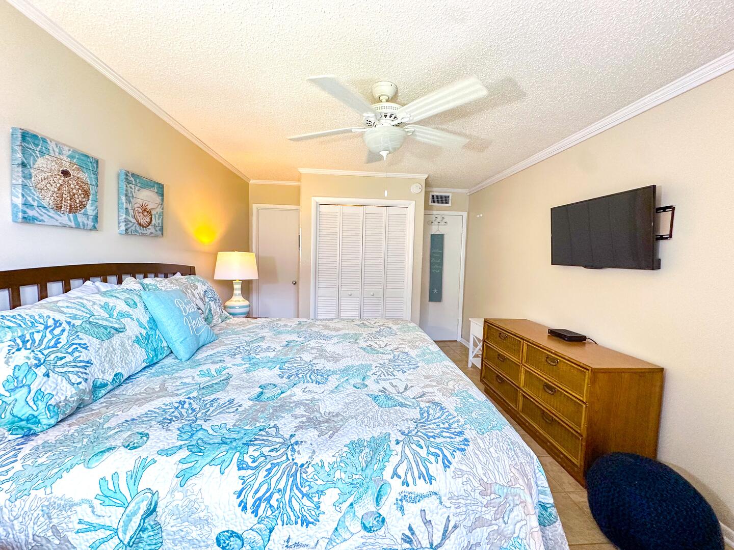 • Primary Bedroom: King bed + oceanview balcony access + flat-screen TV + ensuite bathroom
