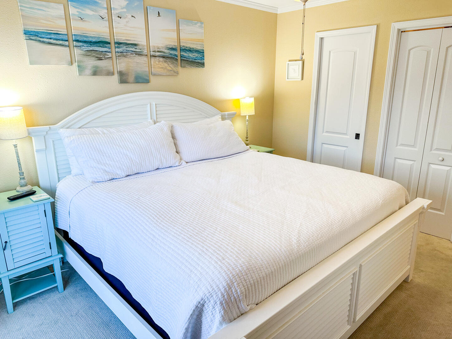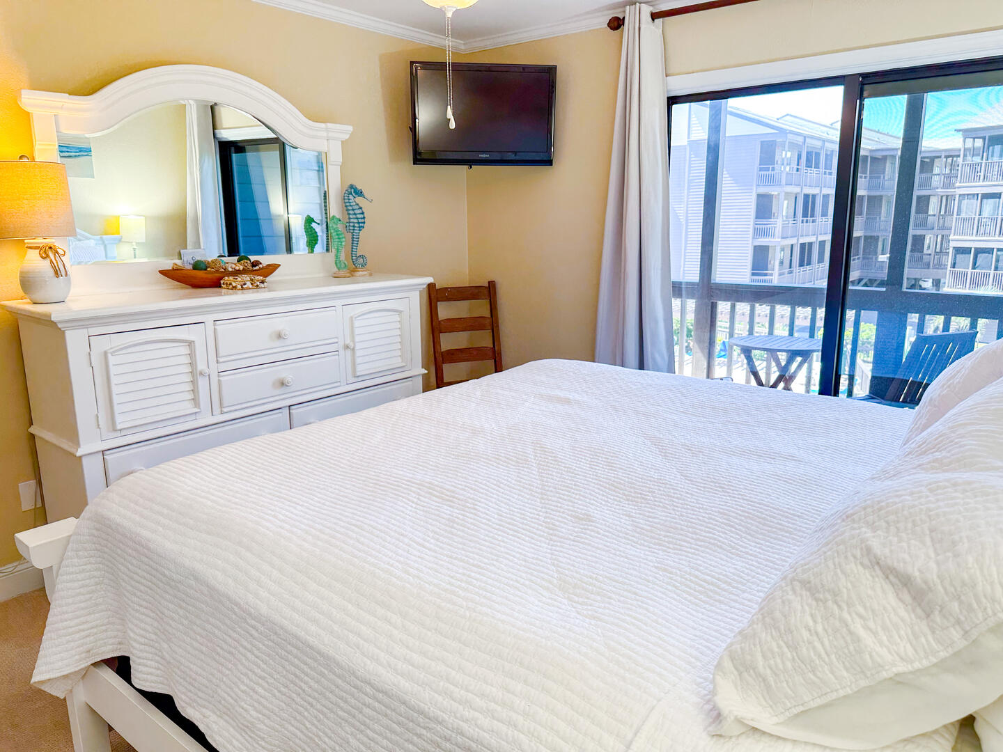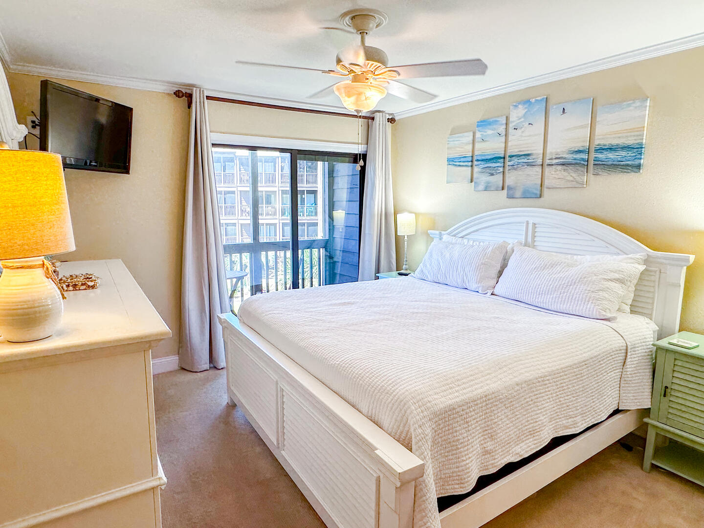• Bedroom 1: King bed + flat-screen TV + private en-suite bath + screened-in balcony