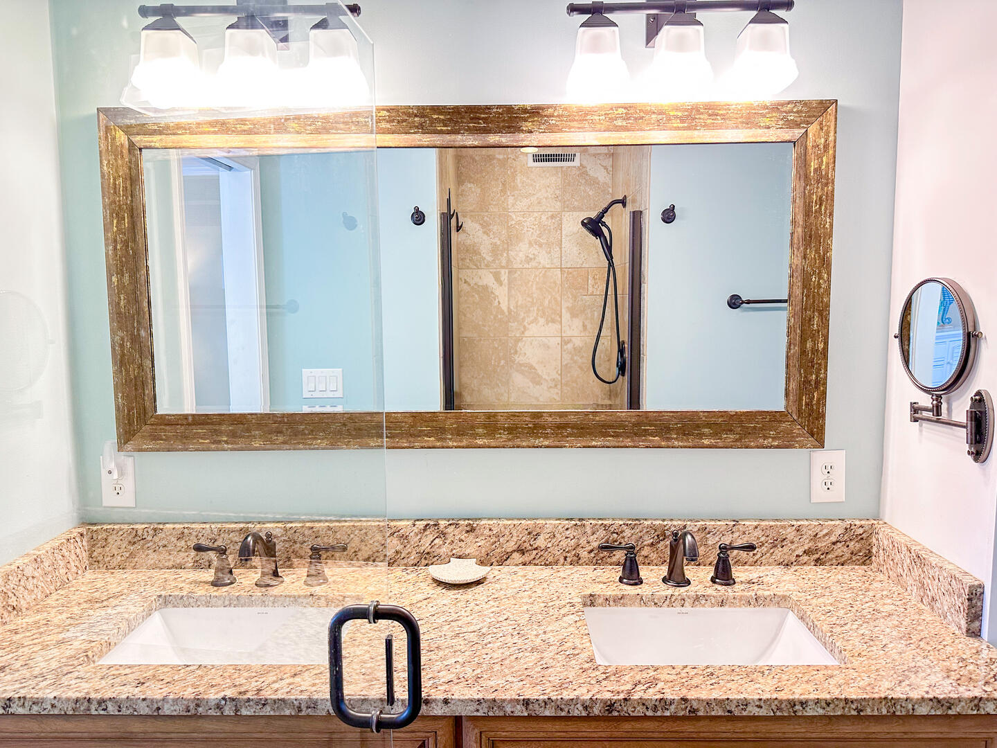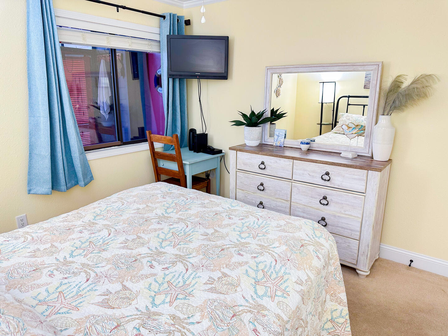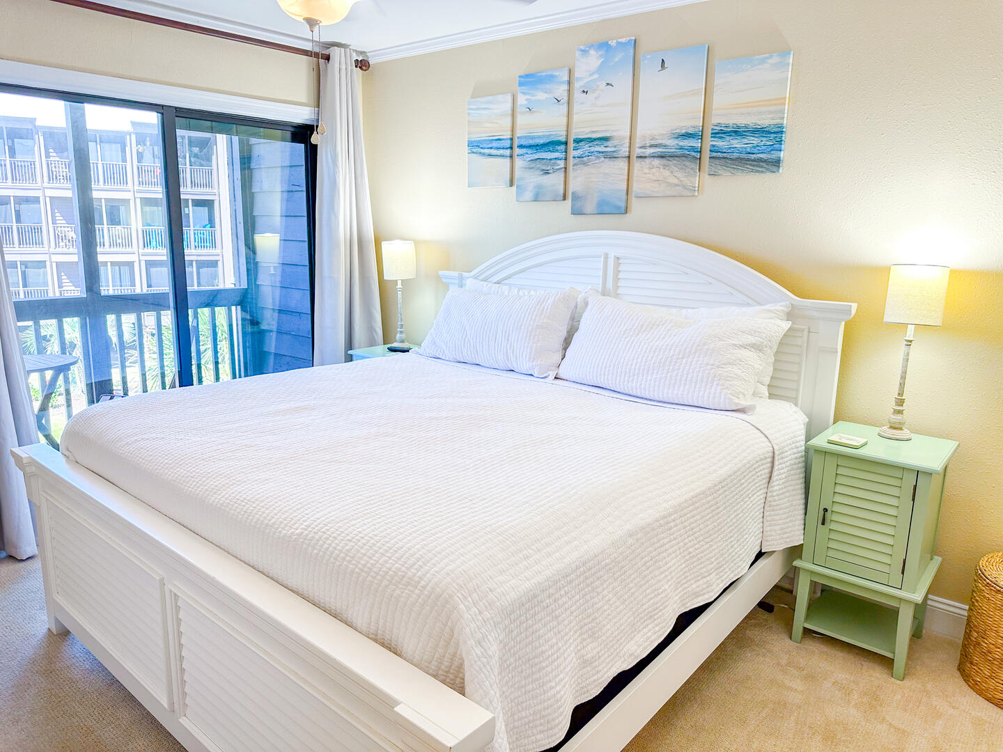 • Bedroom 1: King bed + flat-screen TV + private en-suite bath + screened-in balcony
