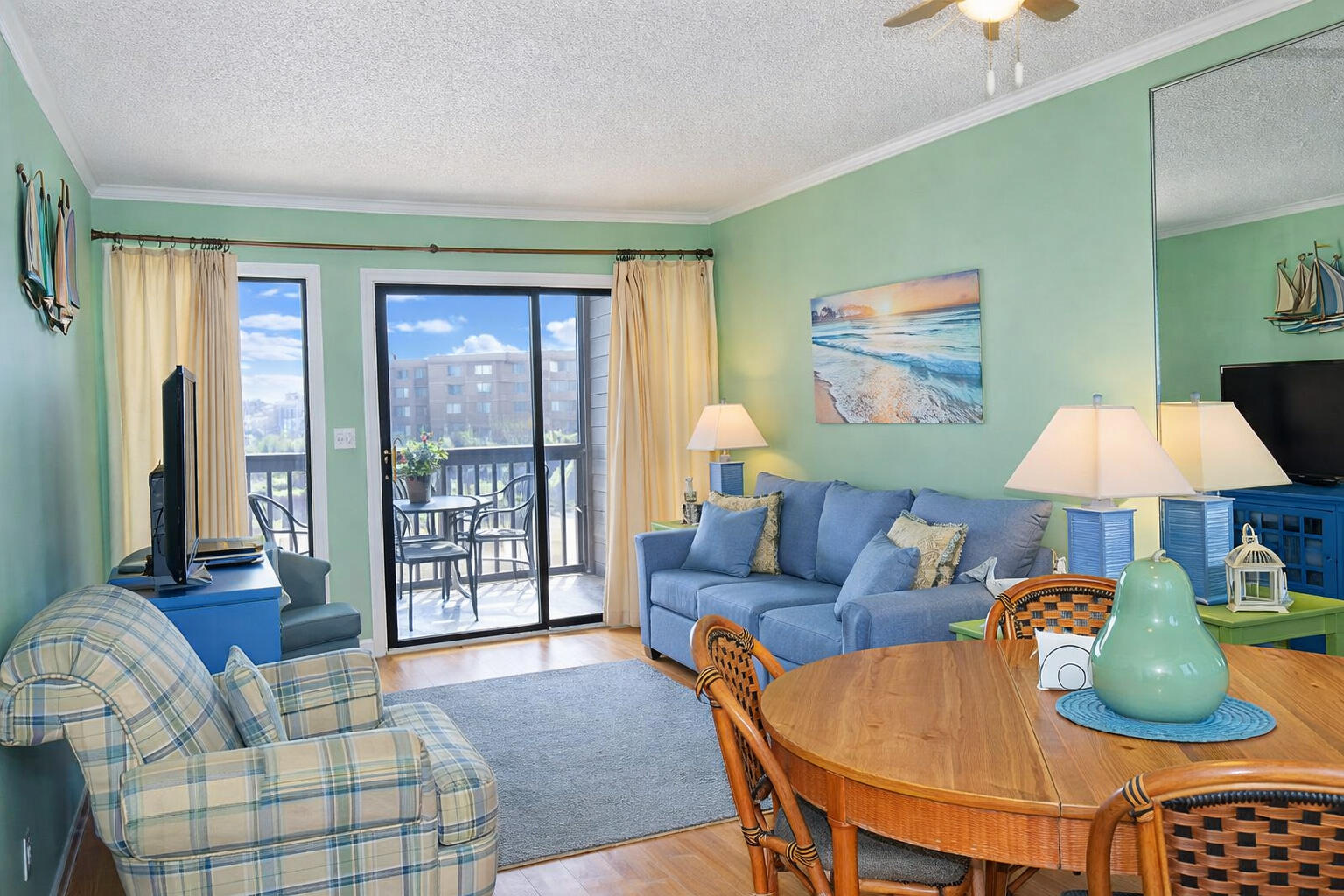 • Living Room: Queen sized sleeper sofa (linens not included) + screened-in balcony facing Ocean Blvd