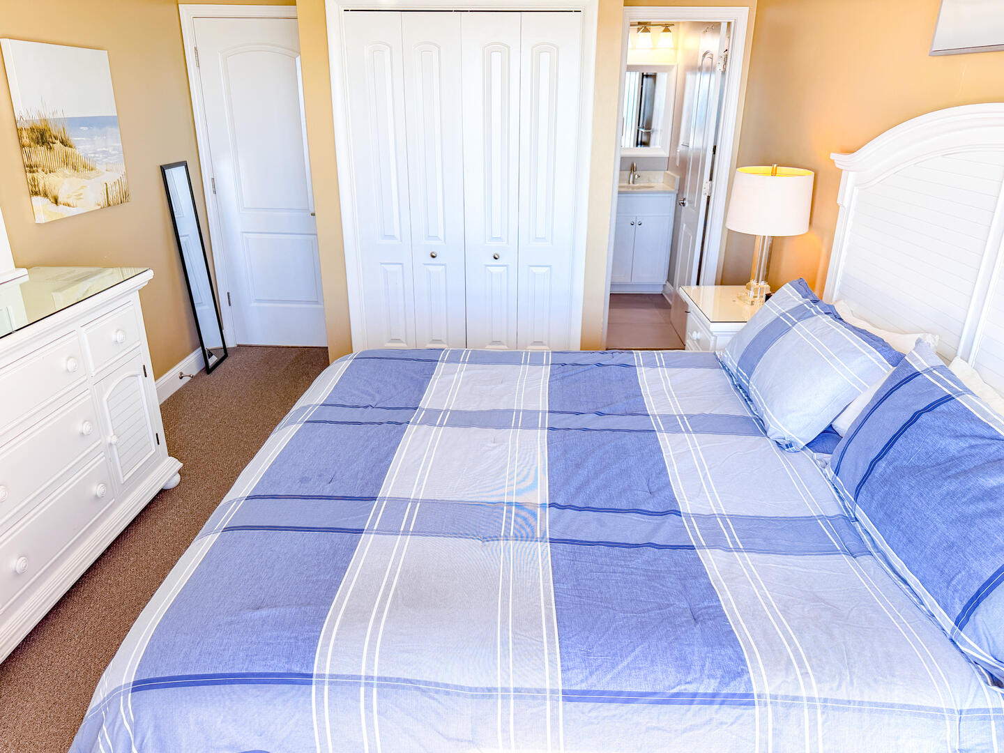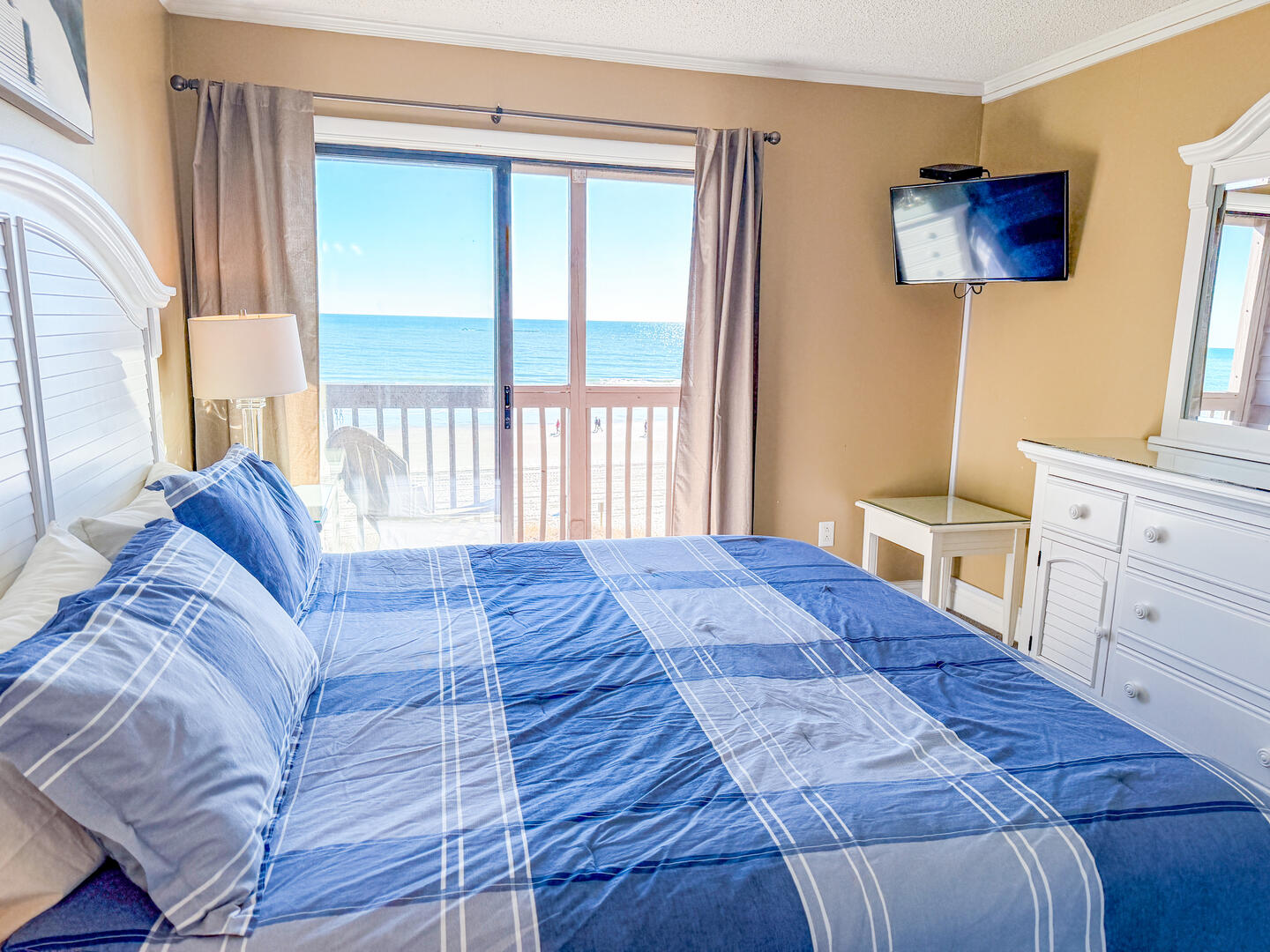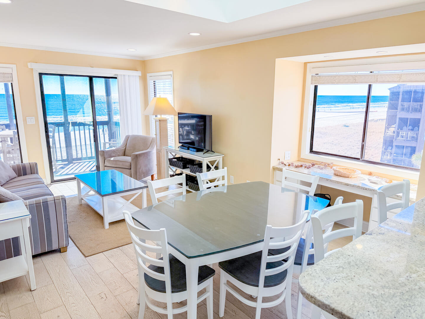 • Bedroom 1: King bed + flat-screen TV + private bath with walk-in shower + oceanfront views