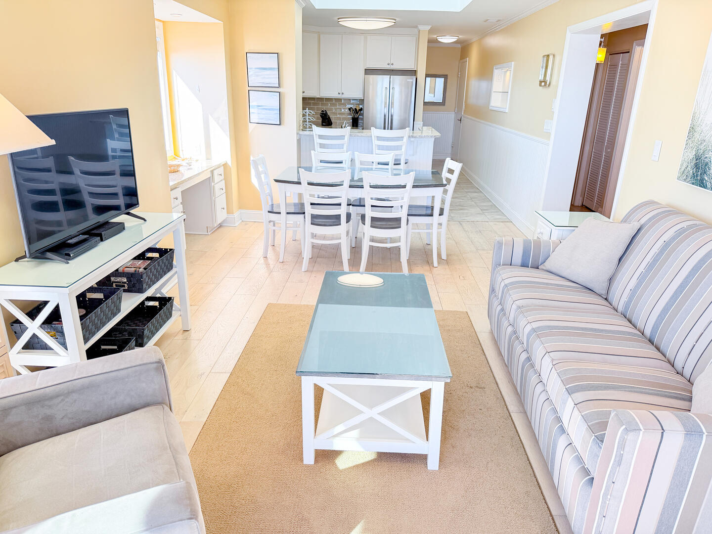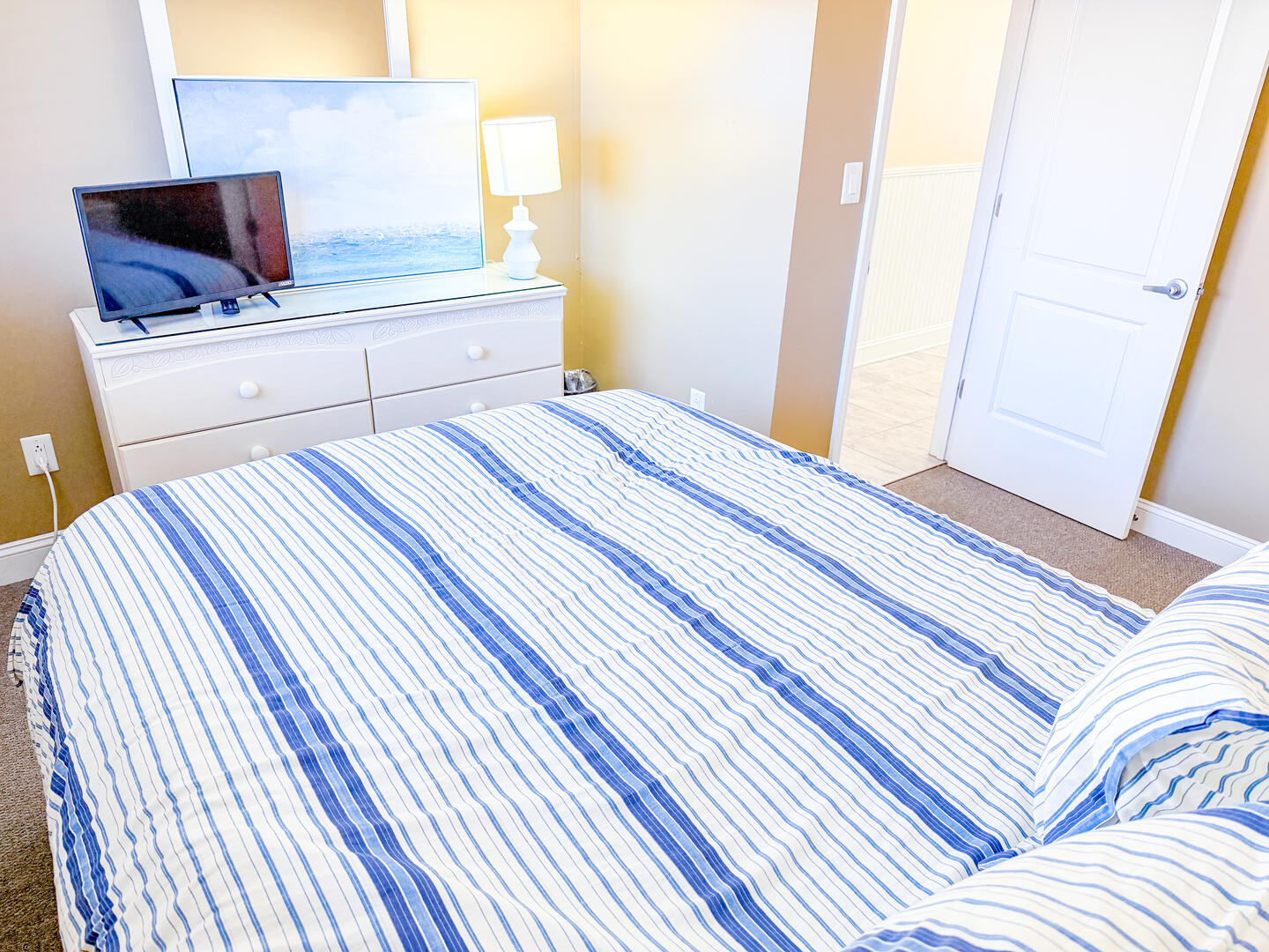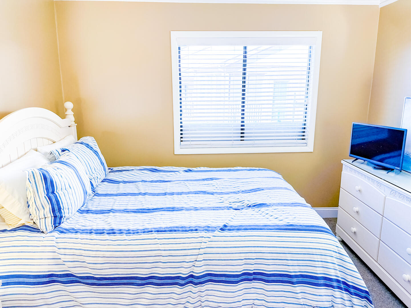 • Bedroom 2: Queen bed + flat-screen TV + ensuite half bathroom