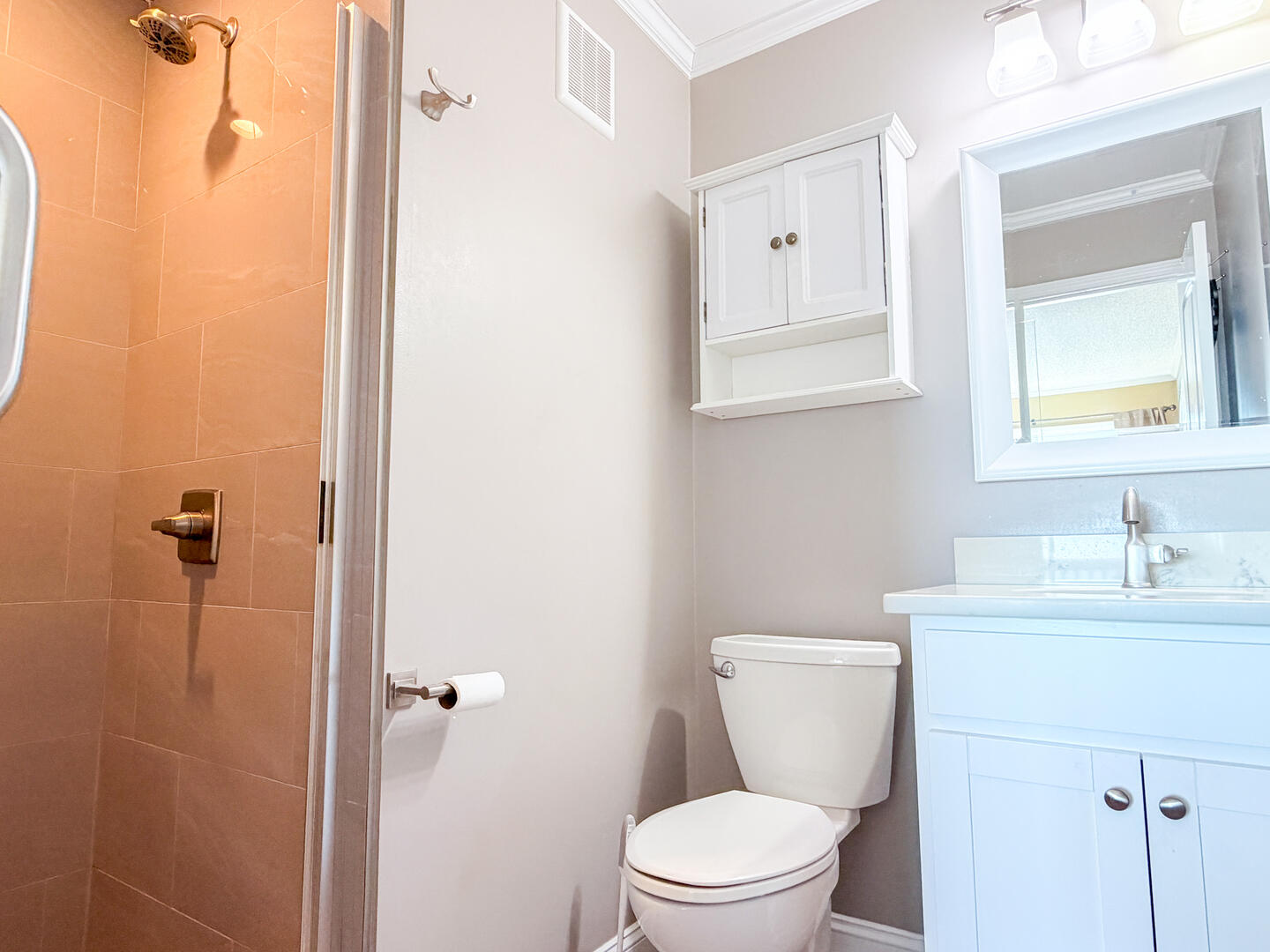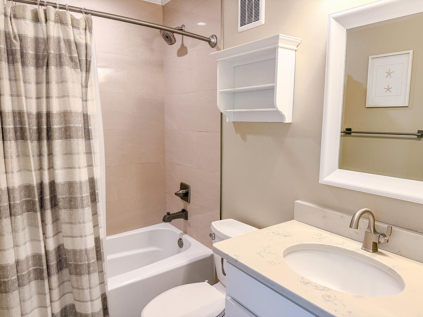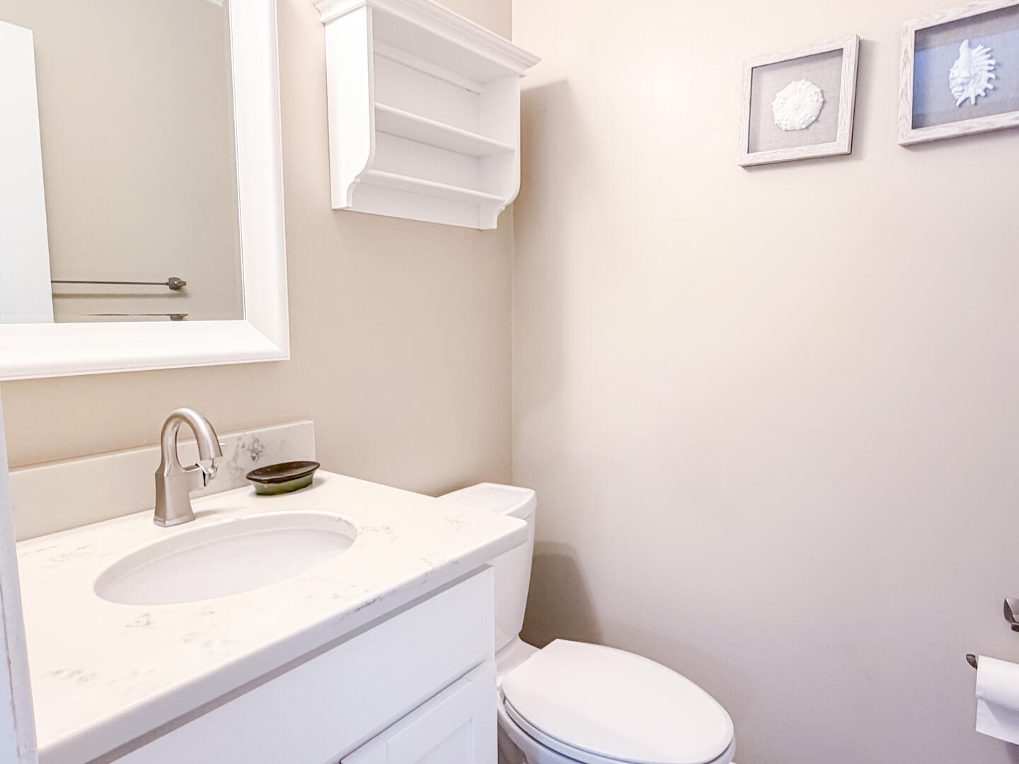 • Bedroom 2: Queen bed + flat-screen TV + ensuite half bathroom