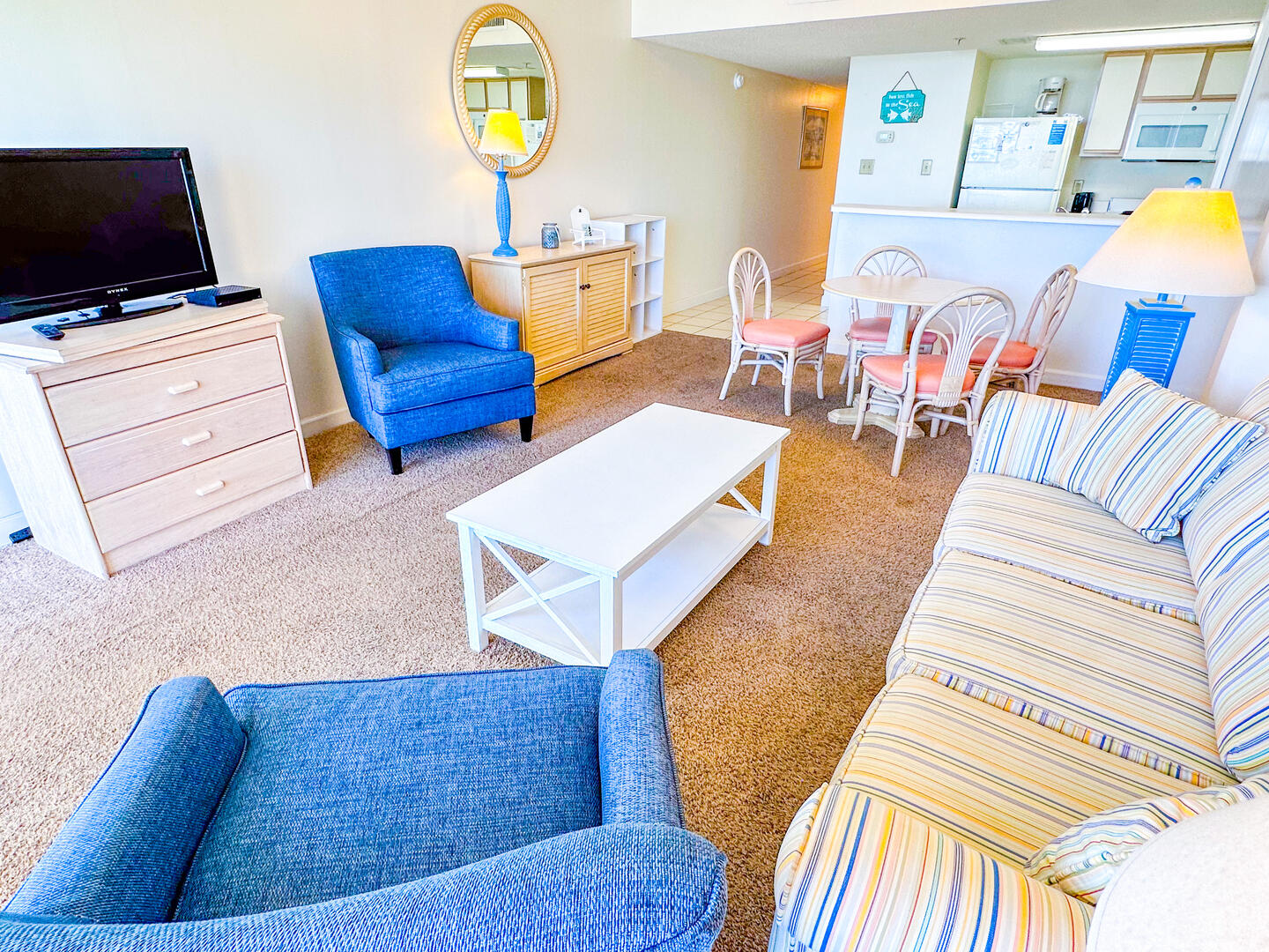Escape to Verandas 602, a charming 1-bedroom, 1.5-bath oceanfront condo on the 6th floor in North Myrtle Beach's sought-after Ocean Drive area. Enjoy breathtaking Atlantic views from your private balcony or relax in the cozy living room featuring a 32" flat-screen TV and queen-sized sleeper sofa (linens not included) for extra guests. This inviting condo offers comfort, convenience, and a perfect setting for couples or small families seeking a memorable beach getaway.The condo features a bedroom with two queen beds, flat-screen TV, and private master bathroom with garden tub and separate shower. The fully equipped kitchen includes a breakfast bar, dishwasher, microwave, and cookware for preparing meals with ease. Additional amenities include in-unit washer & dryer and free Wi-Fi, making your stay convenient and stress-free. Steps away, enjoy Main Street's dining, shopping, and entertainment options for a complete North Myrtle Beach experience.Bedrooms & Baths: