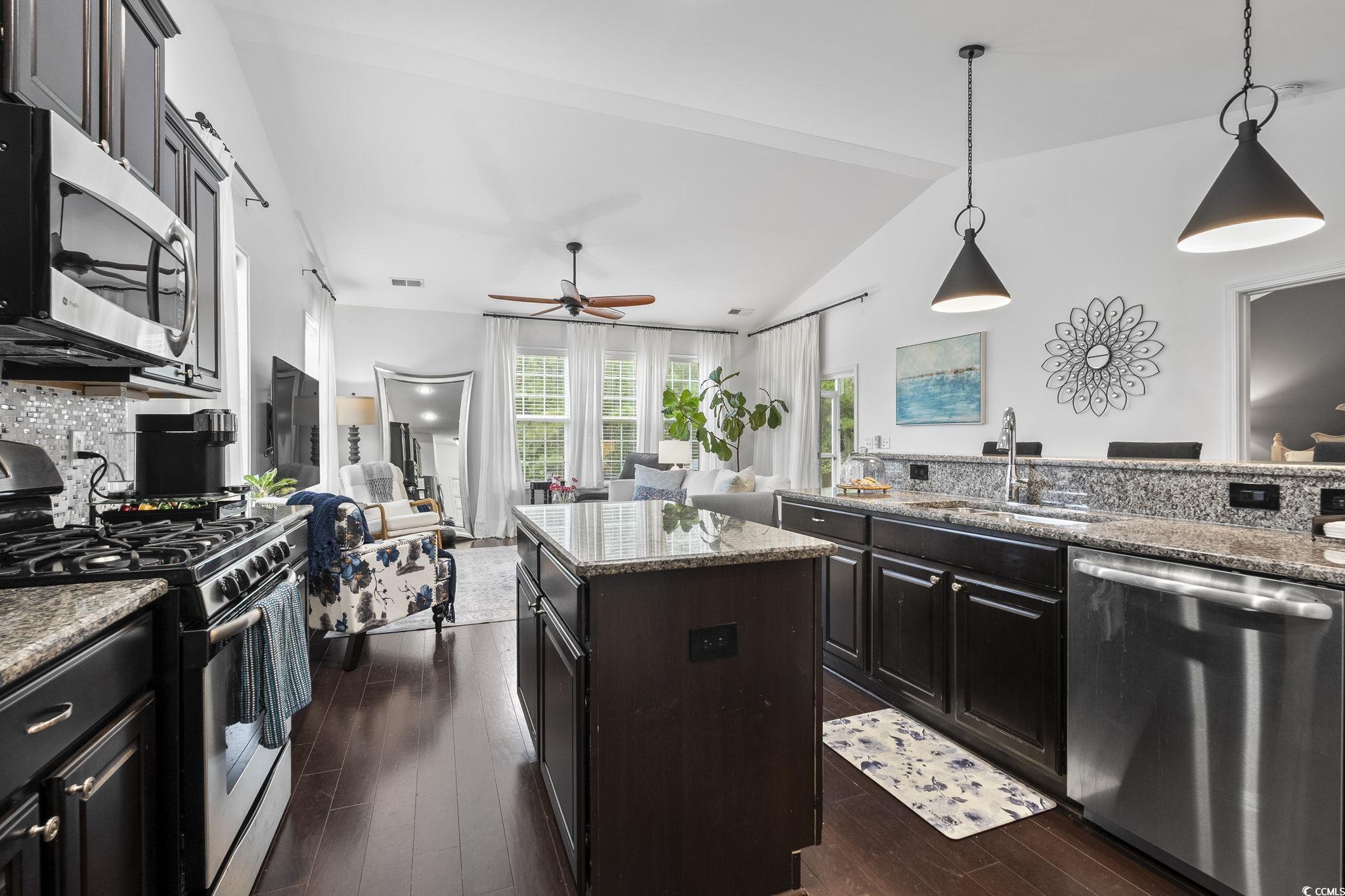 Well-maintained 3 bedroom, 3 bath end unit townhouse with a 2-car garage located in the sought-after natural gas community of Parmelee in Murrells Inlet. This one-owner home sits on a premium lot with pond views and includes a brand-new HVAC system. Interior features include hardwood floors in the main living areas, tile in baths and laundry, and carpet in bedrooms. The open floor plan offers a formal dining room with tray ceiling, a spacious living room with vaulted ceiling and abundant natural light, and a kitchen with granite countertops, center island, stainless steel appliances, espresso cabinetry, pantry, and breakfast bar. The primary suite on the first floor has a vaulted ceiling, walk-in closet with organizers, and access to the screened porch. Primary bath includes a walk-in shower, navy cabinetry, and linen closet. A second bedroom and full bath are also downstairs, while the third bedroom with full bath is upstairs and can serve as a bonus room. Additional highlights include a laundry room with garage access, custom storage, and a screened porch with pond views and gas hookup. Community amenities include pool and clubhouse with fitness equipment. Conveniently located near beaches, shopping, dining, golf, medical facilities, the Marsh Walk, Brookgreen Gardens, and Huntington Beach State Park. Some images are virtually staged.