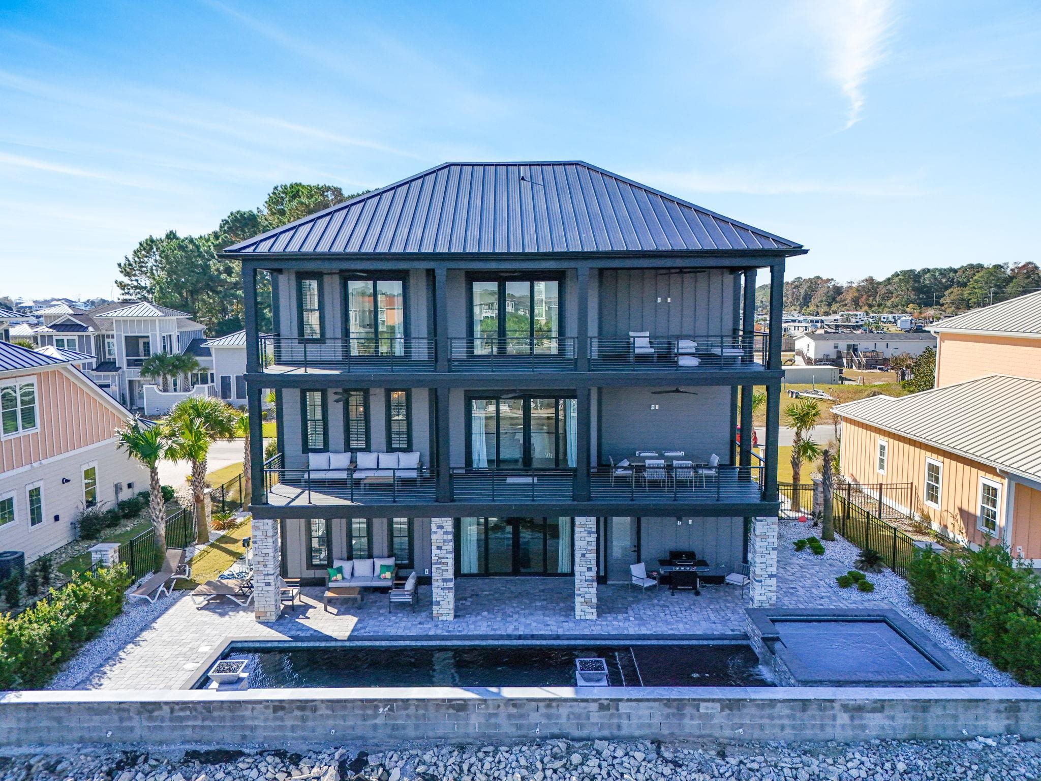 Indulge in an ultra-luxury waterfront lifestyle at this custom-built 2024 home in exclusive Serenity Point - a gated Intracoastal Waterway enclave moments from North Myrtle Beach's elite golf, dining, and marinas. This fully furnished 6-bed, 6-bath masterpiece (3,864 sq ft) delivers beautiful views, seamless open-concept flow, and designer touches. Step into coastal elegance with sun-drenched spaces bathed in natural light, designer fixtures, and high-end stainless-steel appliances. The gourmet kitchen steals the show: expansive island, gas stovetop, double ovens, and walk-in pantry - crafted for epic entertaining. Flow effortlessly to airy living/dining areas and a screened rear porch overlooking your saltwater pool, bubbling spa, and fenced oasis. A private elevator ensures effortless access across levels, perfect for multi-generational retreats or hassle-free arrivals. The top-floor primary sanctuary boasts a spa-like bath with oversized tiled shower, freestanding soaking tub, dual vanities, and bespoke walk-in closet. Guest suites, including a main-level option, offer privacy and poise. Deep-water dock access beckons boaters. Turn-key complete: all furnishings, full appliance suite (washer/dryer included), and 2-car garage. New construction luxury home with elevator- your Little River waterfront dream awaits.