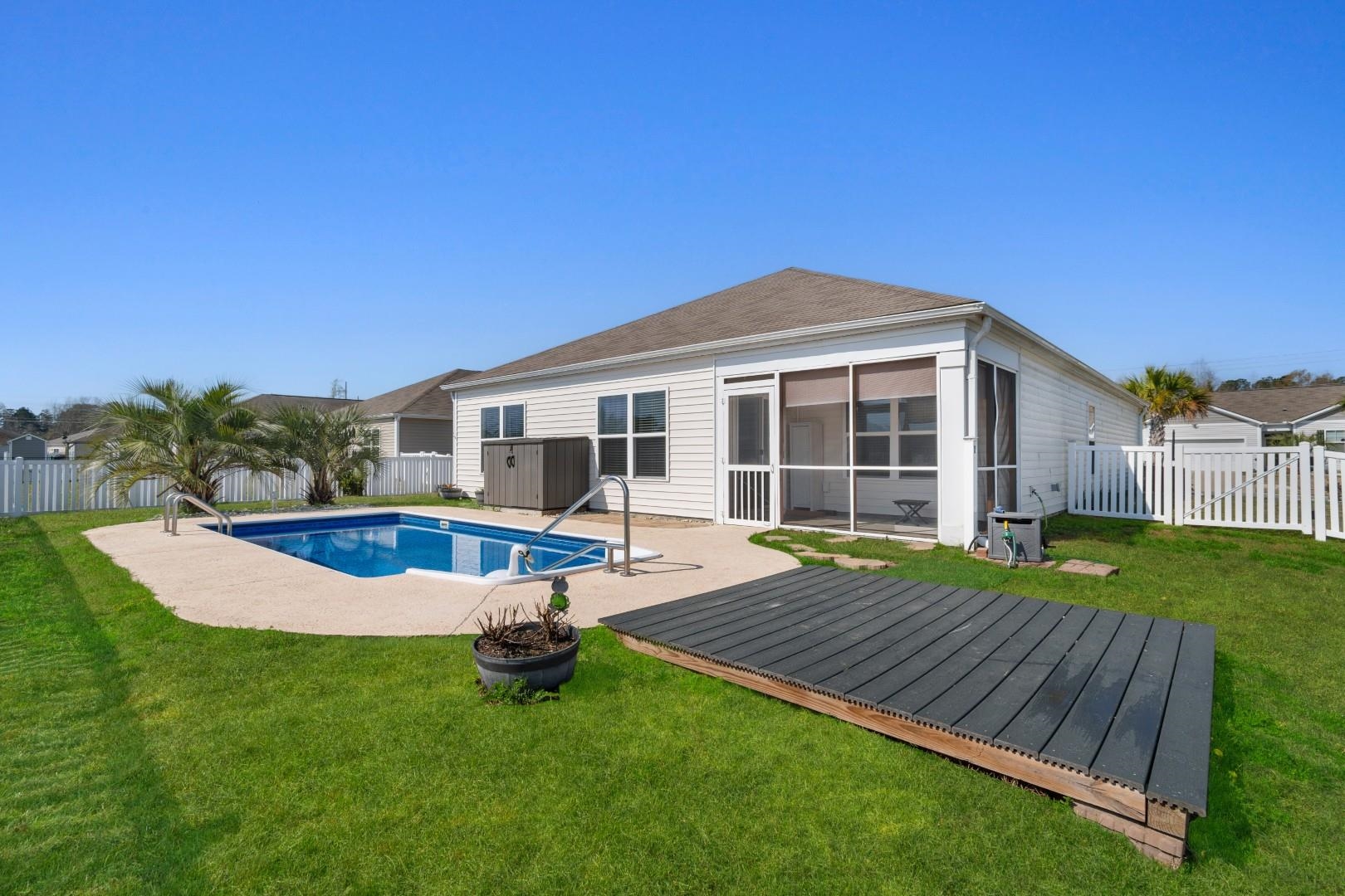 Tucked away in the desirable Oak Glenn community, this 3-bedroom, 2-bath home offers the kind of lifestyle that makes living near the coast feel effortless. From the moment you walk in, the space feels bright, open, and welcoming, with natural light pouring through the windows and beautiful wood-look LVP flooring flowing through the main living areas, complemented by cozy carpet in the bedrooms and smooth ceilings that add a clean, modern touch. The kitchen is truly the heart of the home---perfect for everyday living and entertaining. It features stainless steel appliances along with granite countertops, plenty of cabinet space with stylish molding, and a spacious island with a breakfast bar where friends and family naturally gather. The primary suite offers a peaceful place to unwind, complete with a ceiling fan, walk-in closet, and a private bath featuring dual sinks, a step-in shower, linen closet, and a separate water closet. Two additional bedrooms provide plenty of flexibility for guests, family, or a home office, and share a full guest bath. Step outside and you'll discover what truly sets this home apart. The backyard feels like your own private retreat, with a sparkling in-ground pool, a relaxing pool deck, and tranquil lake views that create the perfect backdrop for quiet mornings, weekend barbecues, or evening swims under the Carolina sky. The fenced yard adds both privacy and space for pets, play, or outdoor entertaining. Located just a short drive from the beaches of Myrtle Beach, you'll enjoy easy access to golf courses, local restaurants, shopping along the Grand Strand, fishing piers, entertainment, and award-winning shows---while still coming home to a peaceful neighborhood setting. Grocery stores, medical centers, banks, and other daily conveniences are all close by, making this home as practical as it is inviting. If you've been dreaming of a home that combines comfort, coastal convenience, and a backyard made for relaxing, this one is definitely worth seeing!