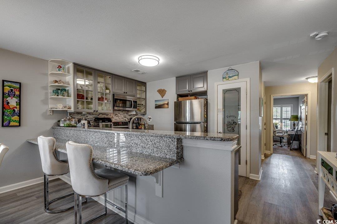 This stunning furnished condo in The Fairways at River Oaks is sure to impress! With modern updates throughout, this 3BD/2BA condo offers over 1300 sq. ft. of heated living space, ready for you to move in. The low-maintenance LVP flooring flows seamlessly through the main living areas and bathrooms. You'll love the open layout that connects the kitchen to the spacious great room. The kitchen features granite countertops, tile backsplash, stainless steel appliances, gray cabinets, a frosted-glass pantry door, breakfast bar, and glass-front upper cabinets. The large living area, combined with the dining room, provides the perfect space for entertaining or relaxing. Sliding doors lead out to a screened porch with a sunshade, ideal for enjoying the outdoors. The generous primary bedroom, measuring 15’x11’, comfortably fits a king-sized bed. The ensuite bath has been updated with a modern vanity, solid surface countertops, and newly installed garden tub/shower combo. The walk-in closet offers ample storage, and there’s a slider leading to the screened porch that floods the room with natural light. On the opposite end of the condo are two guest bedrooms and a guest bath, featuring a custom tile walk-in shower and solid surface countertop. The laundry closet includes a full-size washer and dryer, and there’s additional outdoor storage for your beach gear. Conveniently located just a short walk from the community pool and picnic area, this home is a must-see! The HOA includes property insurance, internet, common area maintenance, and trash removal. Be sure to schedule a showing today!