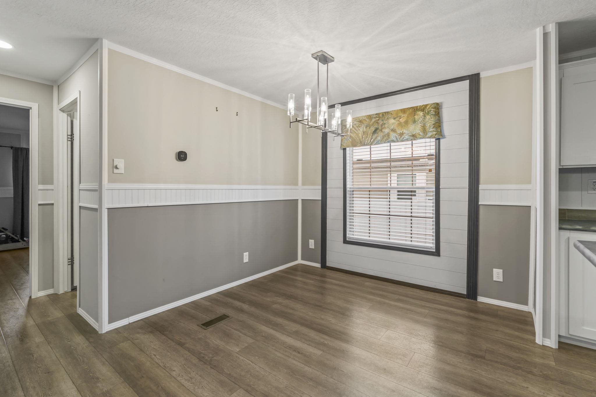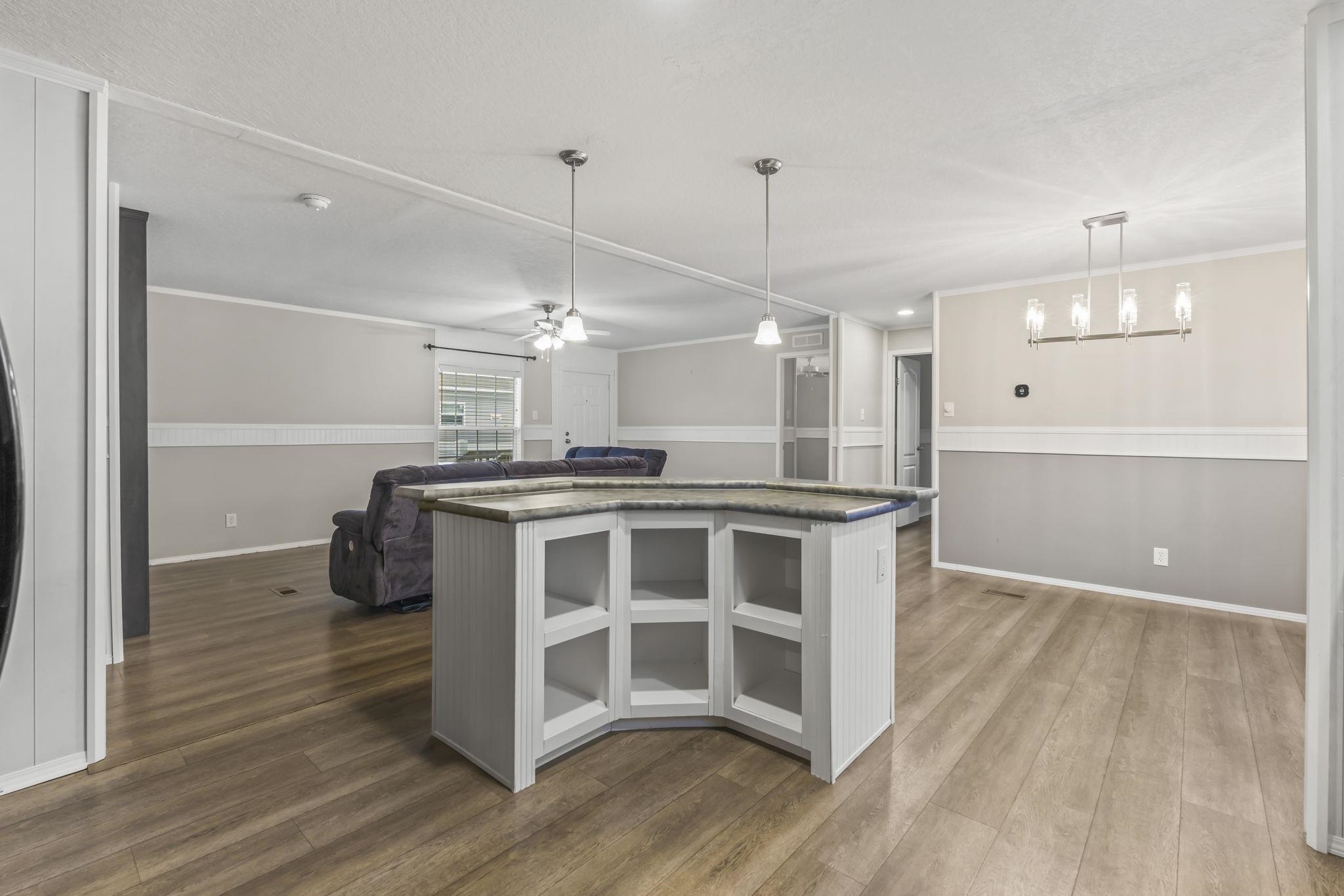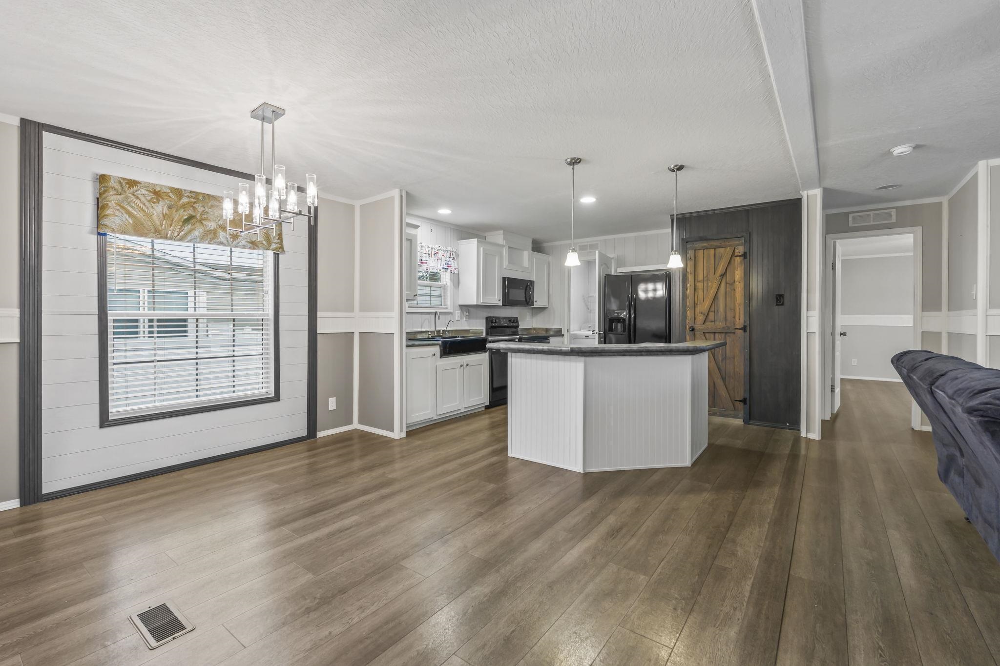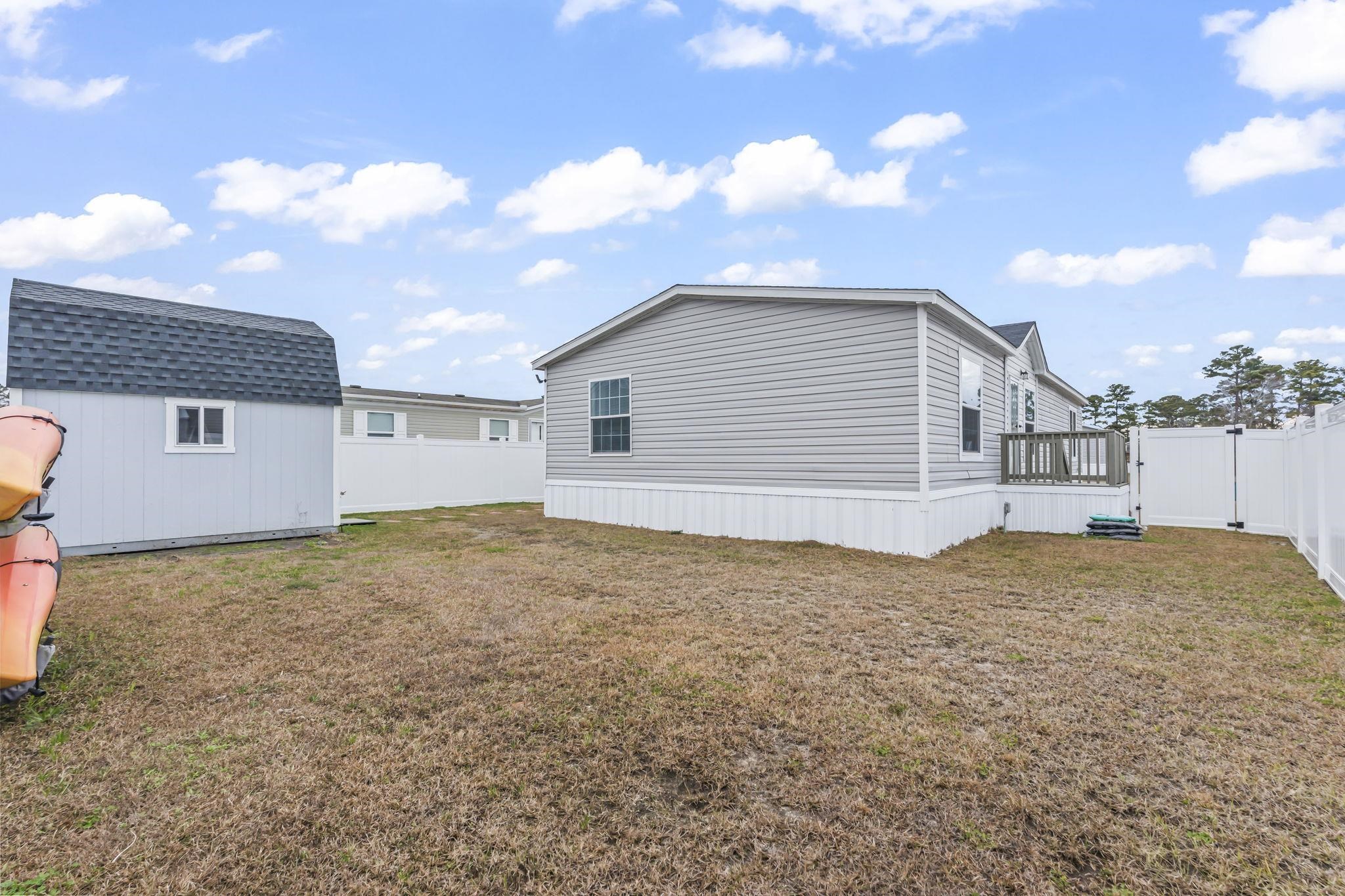 Market Village Community- Beautiful Farmhouse-inspired 3-bedroom, 2-bath manufactured home located in the desirable Market Village community. This 2022 model offers an open-concept layout with a split-bedroom floor plan. Durable vinyl flooring and 5" base molding run throughout the home, and the living room features a built-in entertainment center. The bright, open kitchen boasts a center island with breakfast bar seating, pendant lighting, a spacious walk-in pantry, and abundant cabinet space. Just off the kitchen is the dining area, highlighted by a large picture window and stylish shiplap accent wall. All matching black kitchen appliances including the apron style kitchen sink. The private primary suite is generously sized and includes a walk-in closet and an en-suite bath with a double vanity, soaking tub, and an oversized walk-in shower. Two additional bedrooms are well proportioned and can comfortably accommodate queen- or king-size beds. Outdoor living includes a welcoming front deck, a back deck with a safety gate—with an 6-foot privacy fence that fully encloses the backyard. The property includes a detached 10 x 12 barn/loft-style structure providing additional storage, along with sidewalks leading to both the front and back decks and a three-car concrete parking pad. Weekly trash pickup, security street lighting, community mailboxes, and basic seasonal lawn maintenance included in lot lease. Market Village is centrally located just off Highway 17 Bypass and offers convenient access to shopping, dining, entertainment, and the beach. This home is a must-see—schedule your showing today!