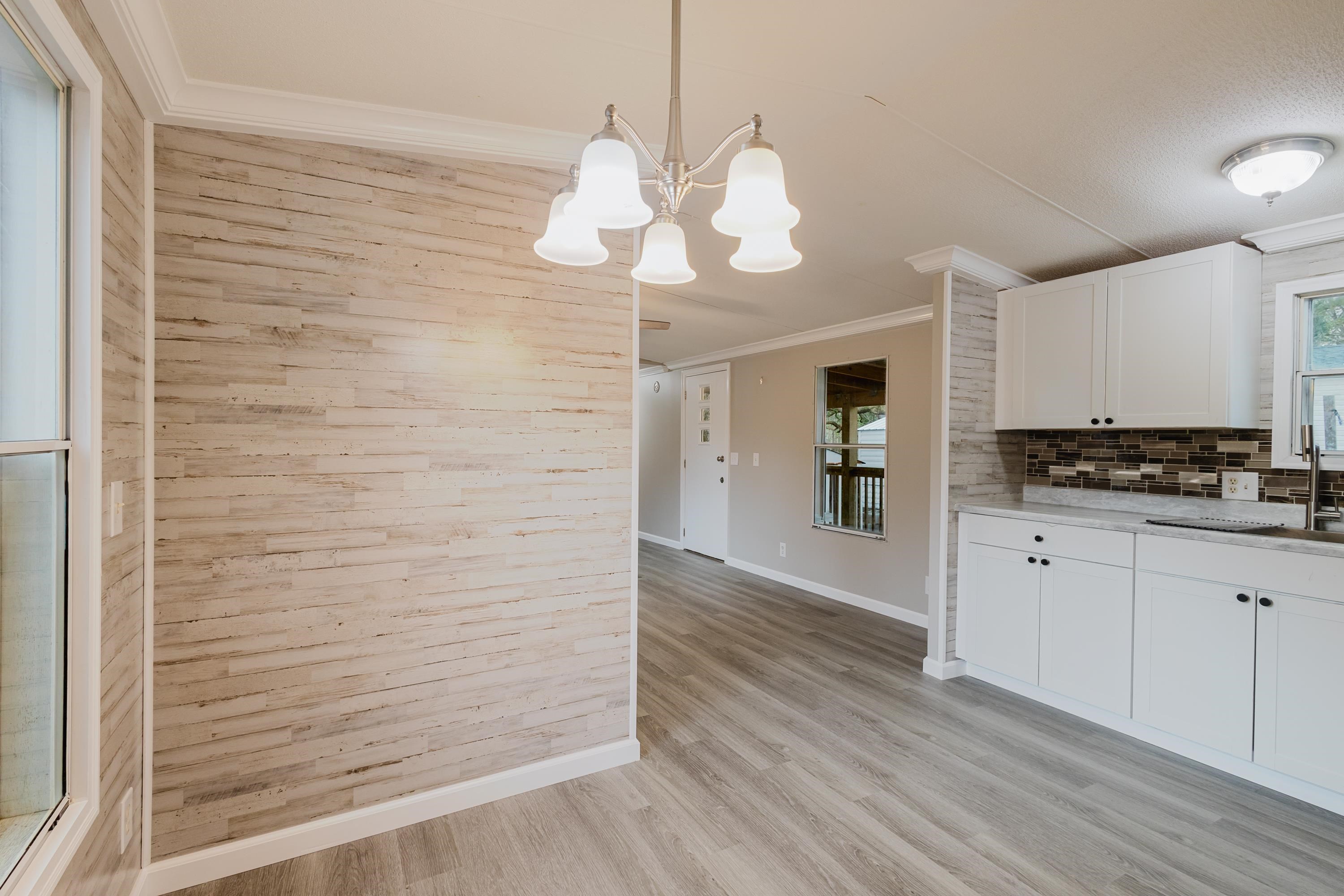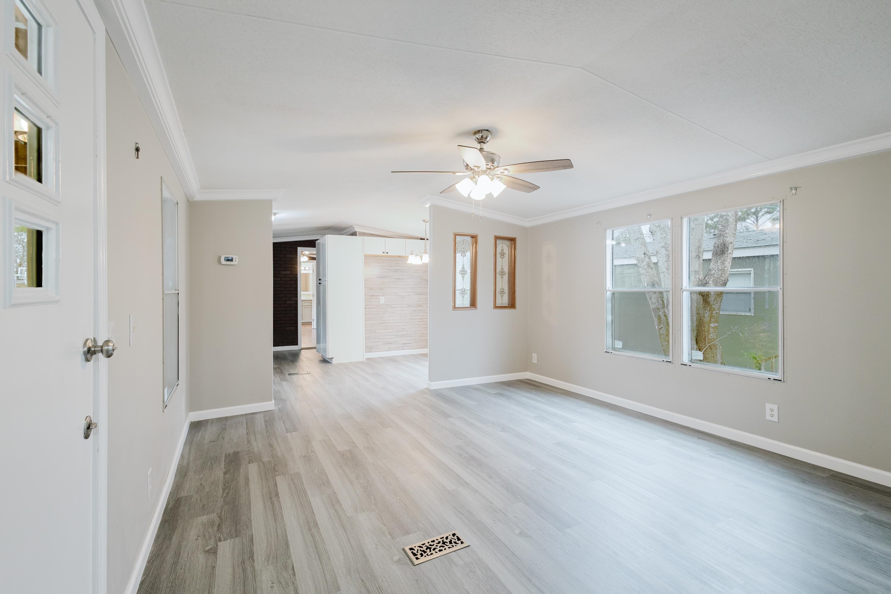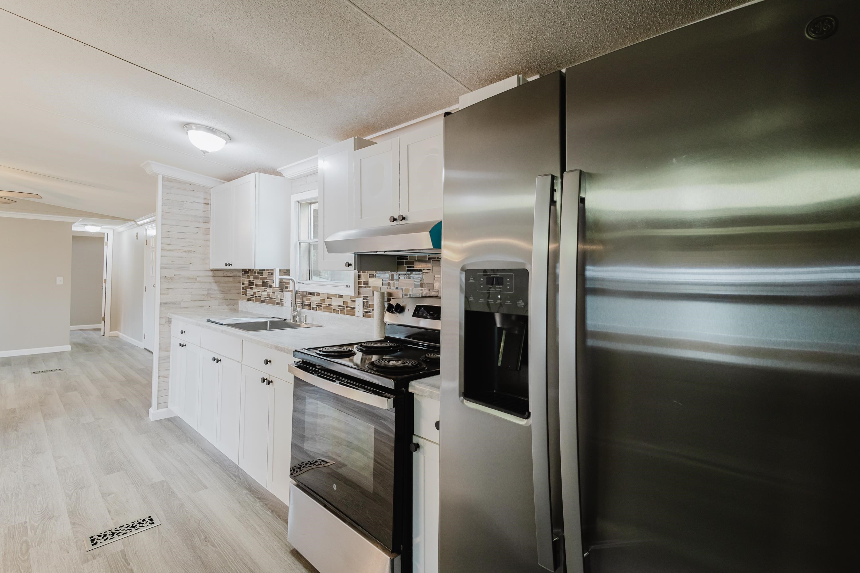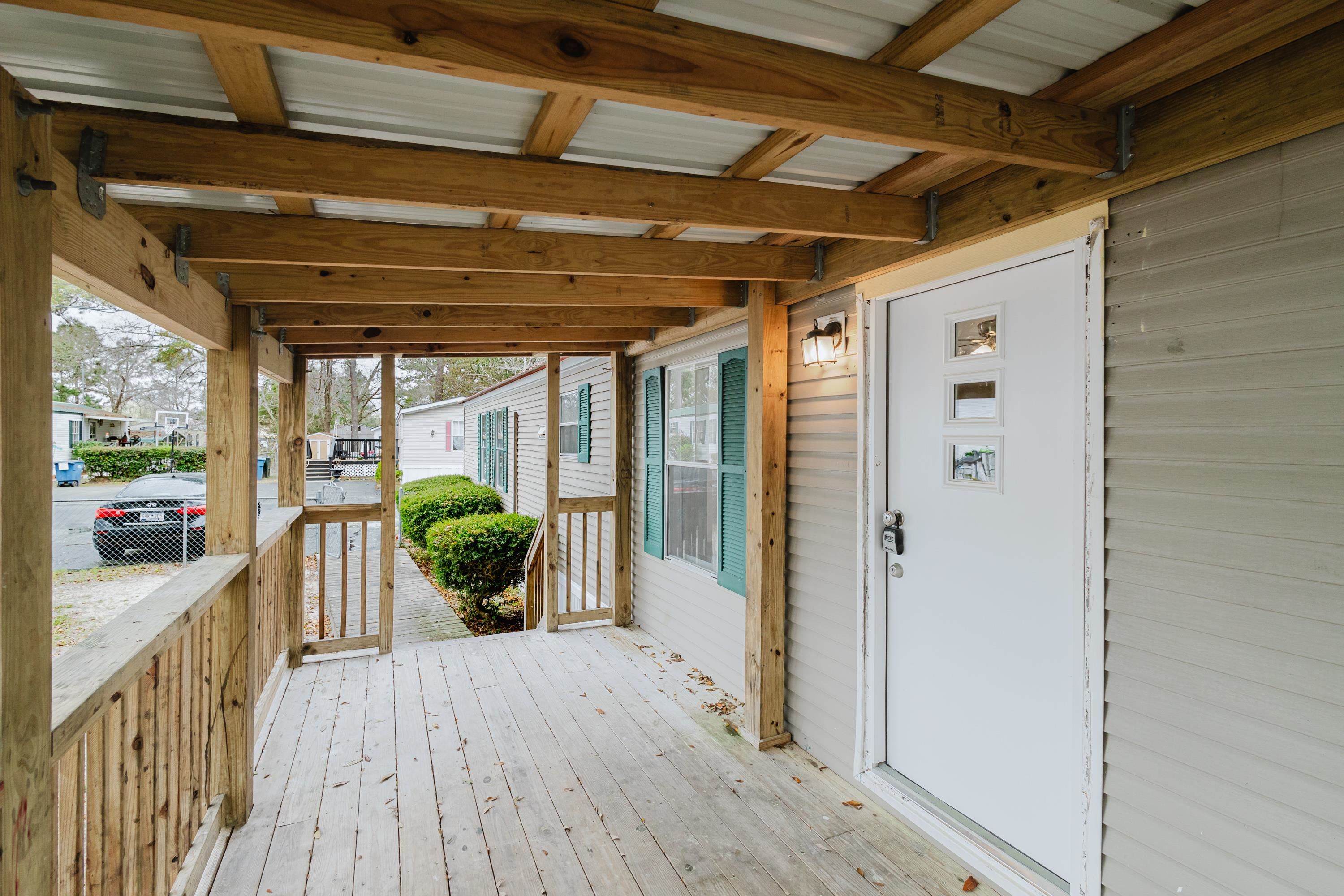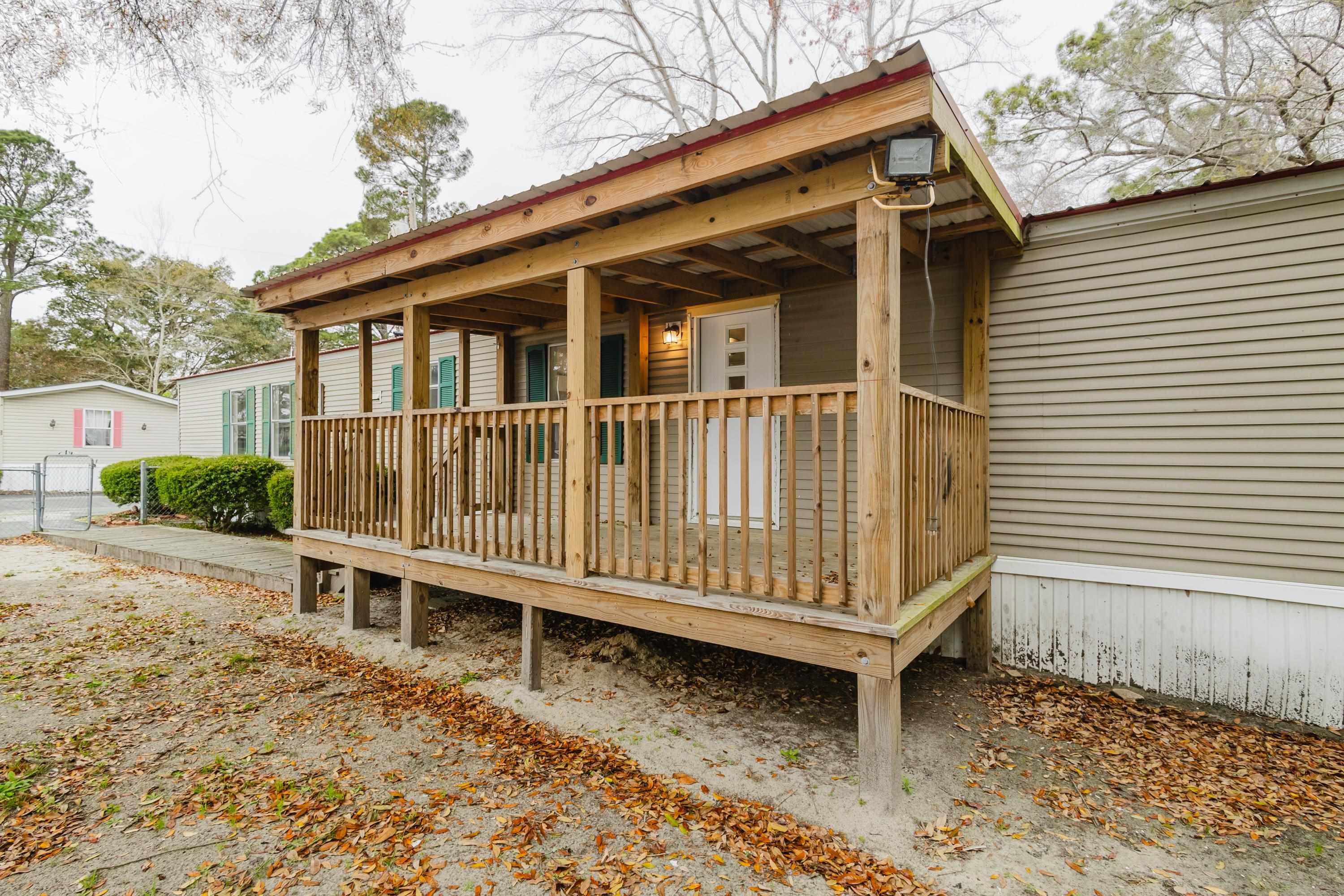 This beautifully renovated 2 bedrooms and 2 bathrooms mobile home is located just 5 minutes from the beach, making it perfect for coastal living or a vacation retreat. The home features a bright and spacious layout with brand-new laminated flooring throughout, crown molding, and updated lighting that gives the entire space a modern, fresh feel. The kitchen has been fully updated with stainless steel appliances, a stylish backsplash, and new cabinetry (with protective film still in place), giving the next owner a like-new experience. Enjoy relaxing outdoors on the large covered front porch or the covered back porch, perfect for entertaining or unwinding after a day at the beach. The property also includes a wired fence along the front side and a durable metal roof for added security and convenience. Additional features include ceiling fans in the living room and bedrooms, a double-sink vanity in the master bathroom, and plenty of natural light that makes the home feel open, airy, and welcoming. A great opportunity to own a move-in-ready home close to the coast!