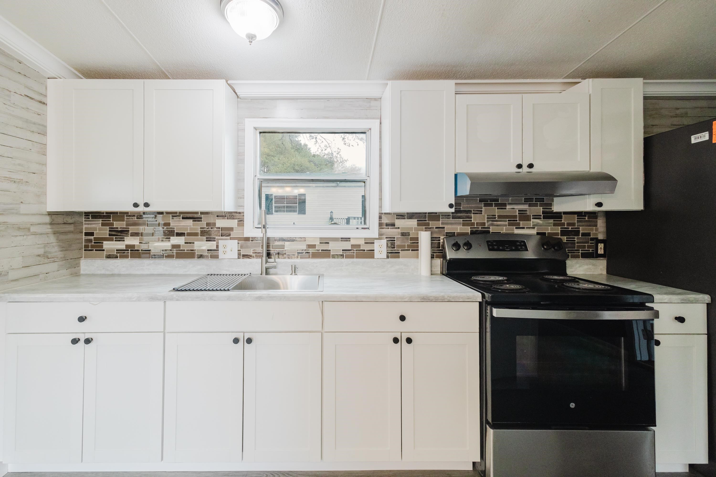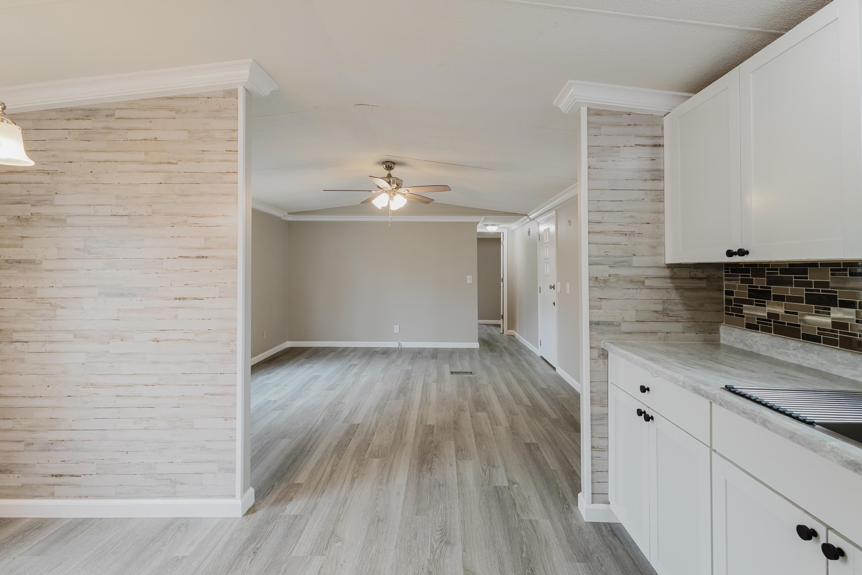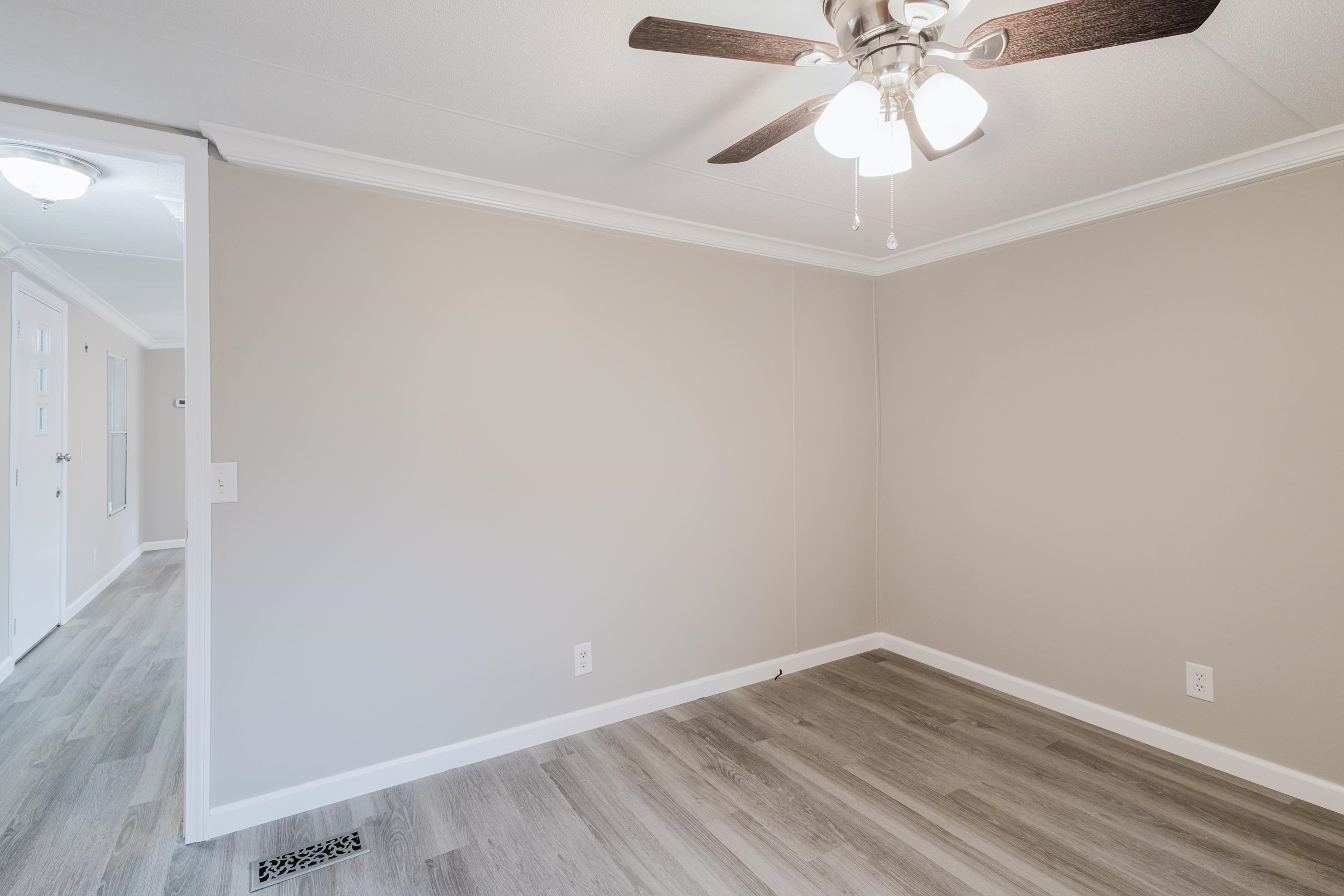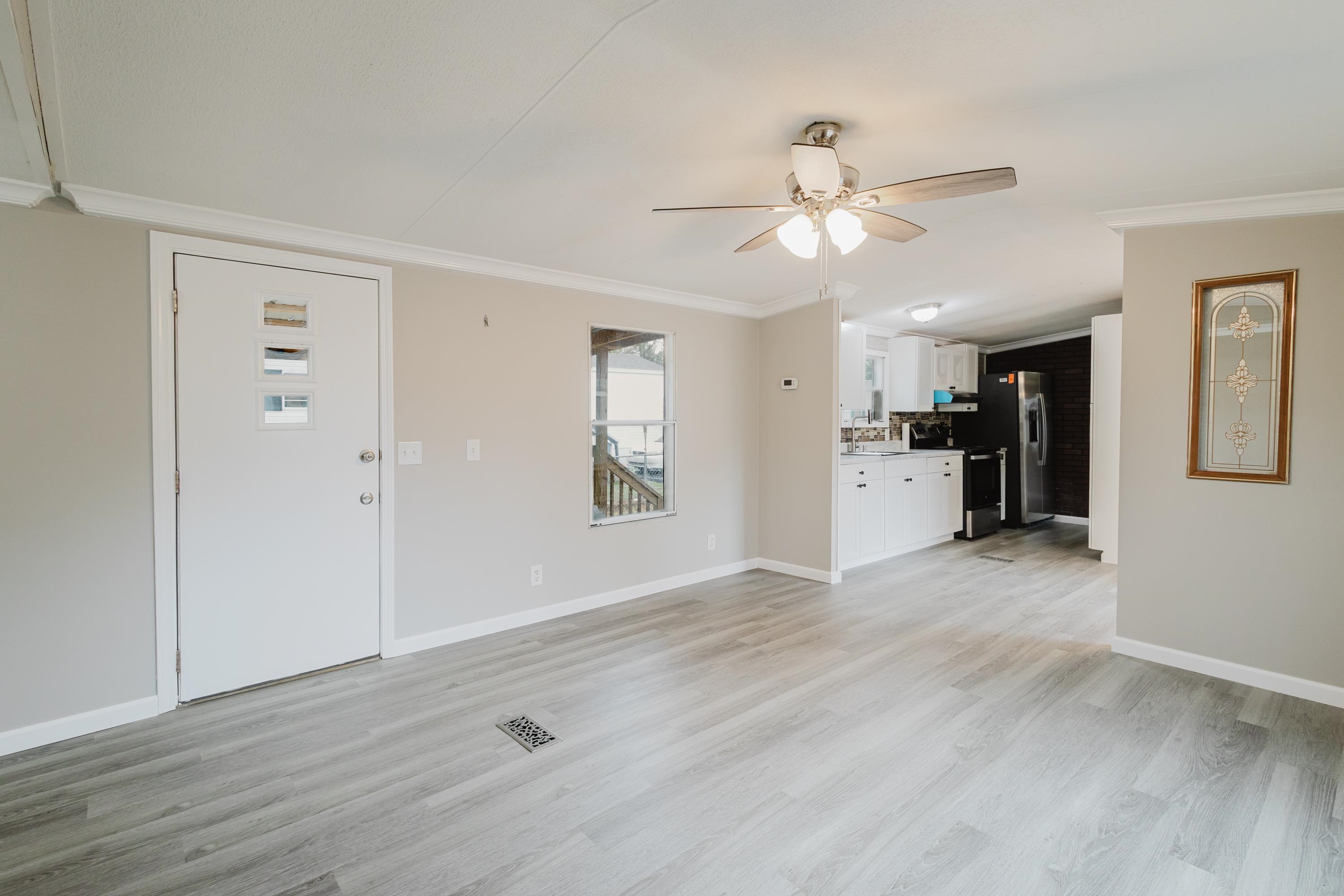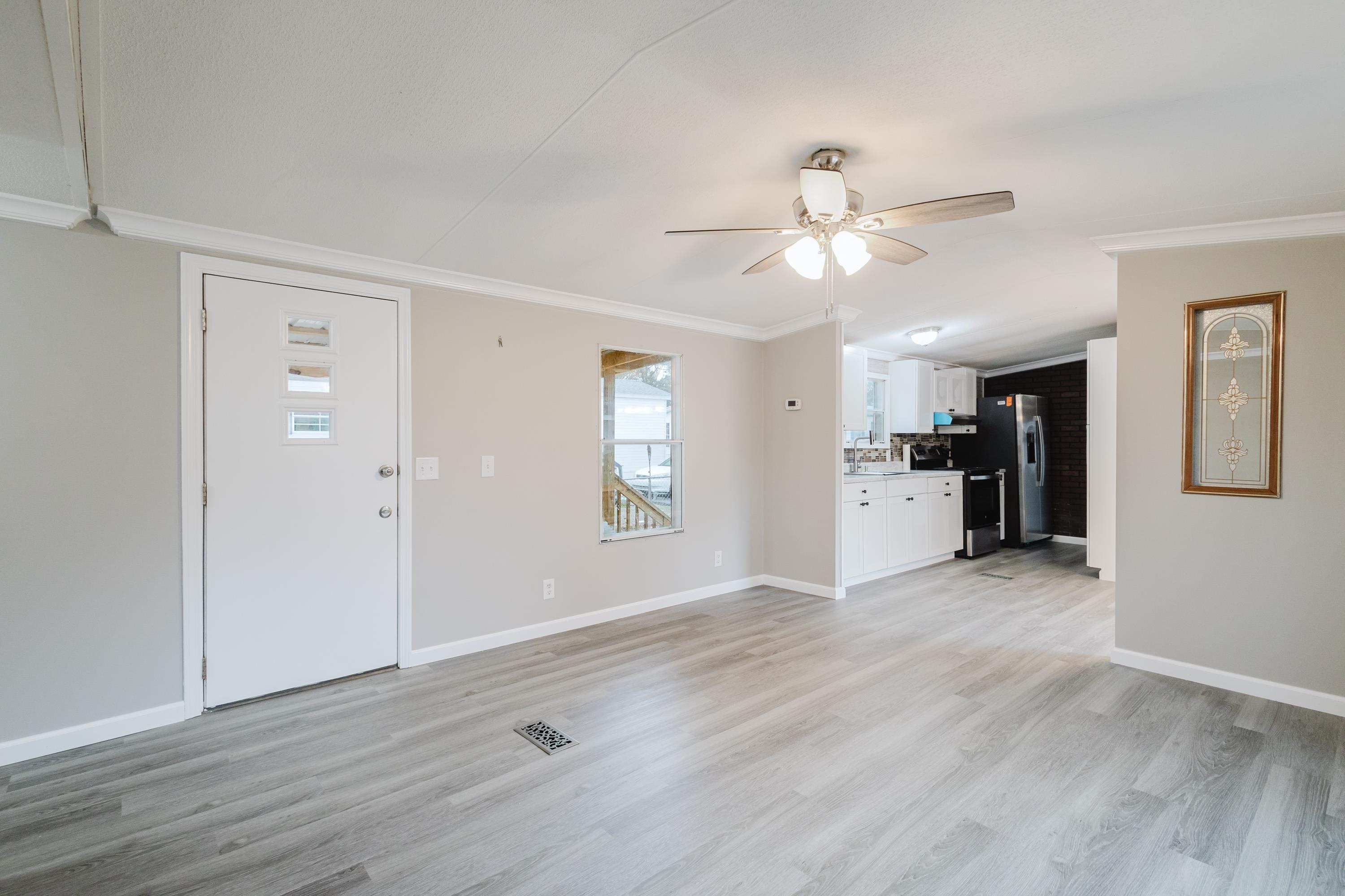 This beautifully renovated 2 bedrooms and 2 bathrooms mobile home is located just 5 minutes from the beach, making it perfect for coastal living or a vacation retreat. The home features a bright and spacious layout with brand-new laminated flooring throughout, crown molding, and updated lighting that gives the entire space a modern, fresh feel. The kitchen has been fully updated with stainless steel appliances, a stylish backsplash, and new cabinetry (with protective film still in place), giving the next owner a like-new experience. Enjoy relaxing outdoors on the large covered front porch or the covered back porch, perfect for entertaining or unwinding after a day at the beach. The property also includes a wired fence along the front side and a durable metal roof for added security and convenience. Additional features include ceiling fans in the living room and bedrooms, a double-sink vanity in the master bathroom, and plenty of natural light that makes the home feel open, airy, and welcoming. A great opportunity to own a move-in-ready home close to the coast!