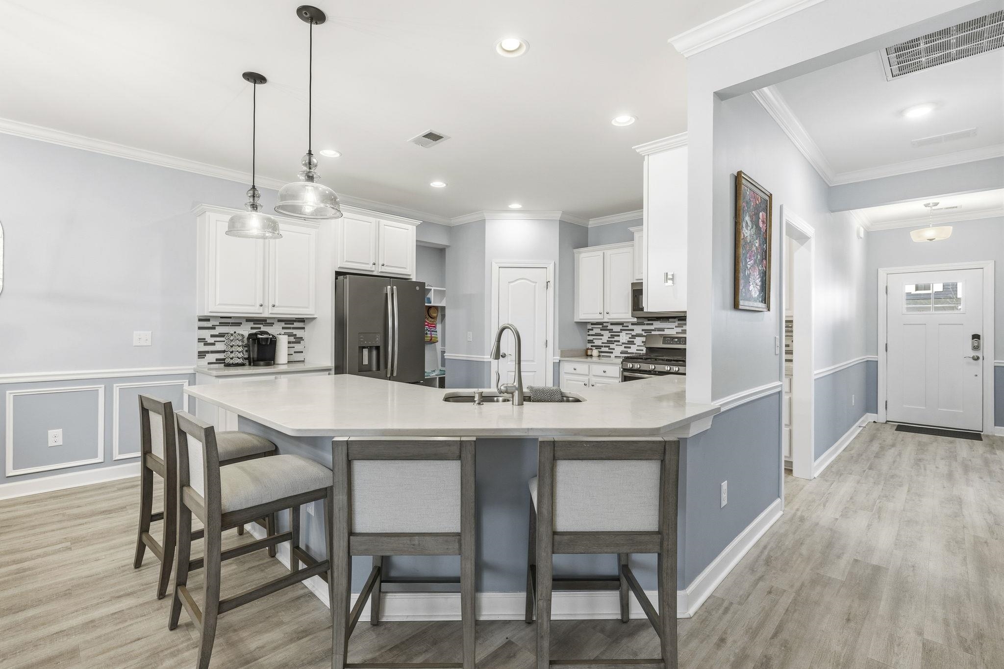 Beautifully upgraded 3-bedroom, 2-bath end-unit villa in the desirable natural gas community of Bridgewater Villas. Enter through a bright foyer featuring elegant chair rail molding that sets the tone for this thoughtfully designed home. The vaulted living room flows seamlessly from the foyer, creating a spacious, light-filled area perfect for entertaining or relaxing. This open kitchen is a chef’s dream, featuring quartz countertops, a roomy island that doubles as a breakfast bar, plenty of cabinets and a pantry, a custom backsplash, and sleek black and slate stainless-steel appliances with a gas range. Adjacent, the dining room showcases chair rail molding and a striking wheel chandelier, providing a sophisticated space for gatherings. The separate laundry room includes a table and cupboards, adding convenience and functionality. The home also offers a two-car garage, a tankless hot water heater, and a powerful 22kW Generac whole-home generator for peace of mind year-round. The primary suite is a serene retreat featuring a tray ceiling, and the ensuite boasts a double sink, custom tile shower with glass doors, and thoughtful finishes throughout. Step outside to a relaxing rear screened porch, ideal for morning coffee or unwinding in the evening, which leads to an outdoor patio perfect for entertaining. Beyond the home, the lifestyle at Bridgewater Villas truly shines. Imagine morning walks along scenic trails, afternoons at the resort-style pool relaxing under shaded cabanas, and evenings grilling with neighbors in the outdoor kitchen while the kids play nearby. Stay active in the state-of-the-art fitness center, enjoy friendly matches on the tennis and pickleball courts, or spend weekends at the dog parks and community garden. With a full-time activity director planning social events and gatherings throughout the year, it’s easy to meet friends and feel connected. This is more than a neighborhood, it’s a community designed for making memories, staying active, and enjoying everyday life to the fullest.