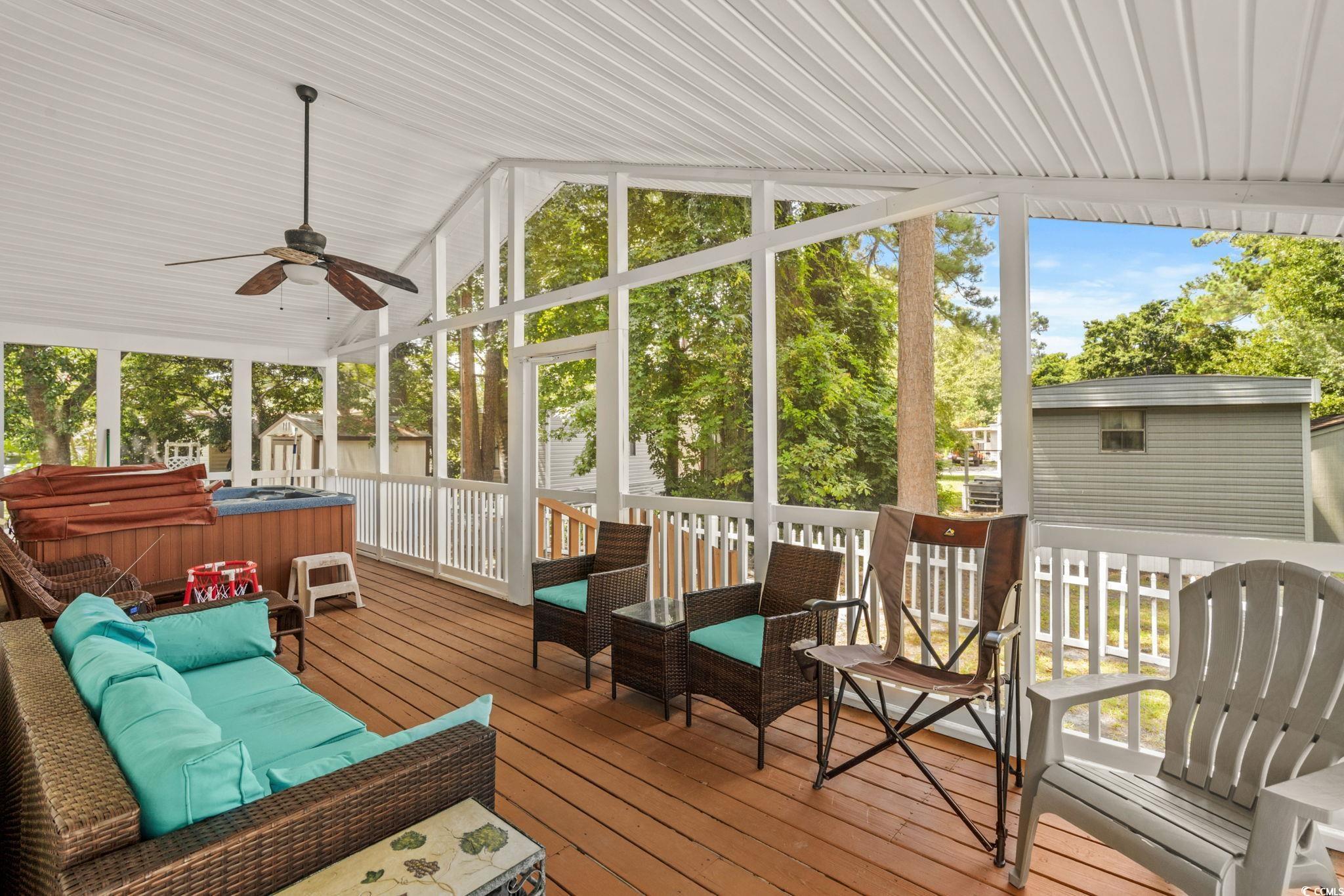 Come view this stunning move in ready 3/2 home located just blocks from the beach. This home has been meticulously cared for, the roof and HVAC replaced in 2023, dishwasher & hot water replaced 2025. Beautiful and bright split floorplan, wood burning fireplace, laundry room, 13x33 screened porch that provides plenty of privacy for relaxing in the hot tub, 8x10 storage building, fenced back yard, plenty of parking and the golf cart is included. Minutes to Garden City Beach & Pier, Murrells Inlet Marsh Walk, restaurant row, groceries, shopping, pharmacies, golf, endless entertainment and more. Windjammer Village is a beautiful coastal community that offers a clubhouse, pool and great management. Golf carts and pets are welcome. Perfect place for a beach home or primary. All measurements are not guaranteed and must be verified by the buyer.