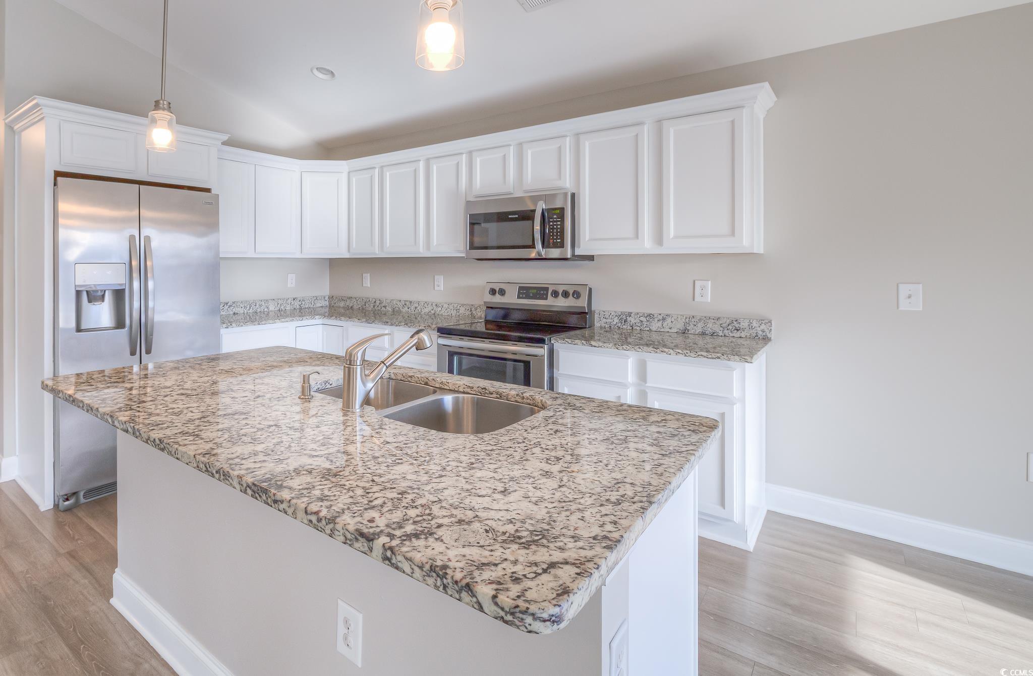 Discover a coastal lifestyle that feels like a vacation every day in this beautifully designed home located in the coveted Kayak Kove community. Set beside a pristine 28-acre lake, the property offers an inviting backdrop for quiet mornings on the water, and relaxing evenings. As you enter, the first level provides two comfortable bedrooms, a full bath, and a convenient laundry area - an ideal setup for guests, family, or flexible living arrangements. The main floor opens into a bright and airy living and dining space where natural light pours in, creating a welcoming atmosphere for everyday living or entertaining. The kitchen is thoughtfully appointed with granite countertops, stainless steel appliances, a center island, and plenty of workspace for those who enjoy cooking or gathering with friends. Step just beyond the living area to a private balcony that frames peaceful lake views—perfect for coffee at sunrise or unwinding as the day winds down. The primary suite serves as a personal retreat, offering generous closet space and a comfortable bath designed for relaxation and practicality. A two-car garage, ample storage options, and golf cart access add to the convenience and ease of living in this exceptional neighborhood. Only a short 2.5-mile ride to the beach, this home places you near everything that defines Murrells Inlet living—from the famed MarshWalk and award-winning golf courses to boutique shopping and some of the area’s best dining. If you’ve been searching for the perfect blend of comfort, location, and lifestyle, this property delivers it all. Schedule your private tour today and experience Kayak Kove at its finest.