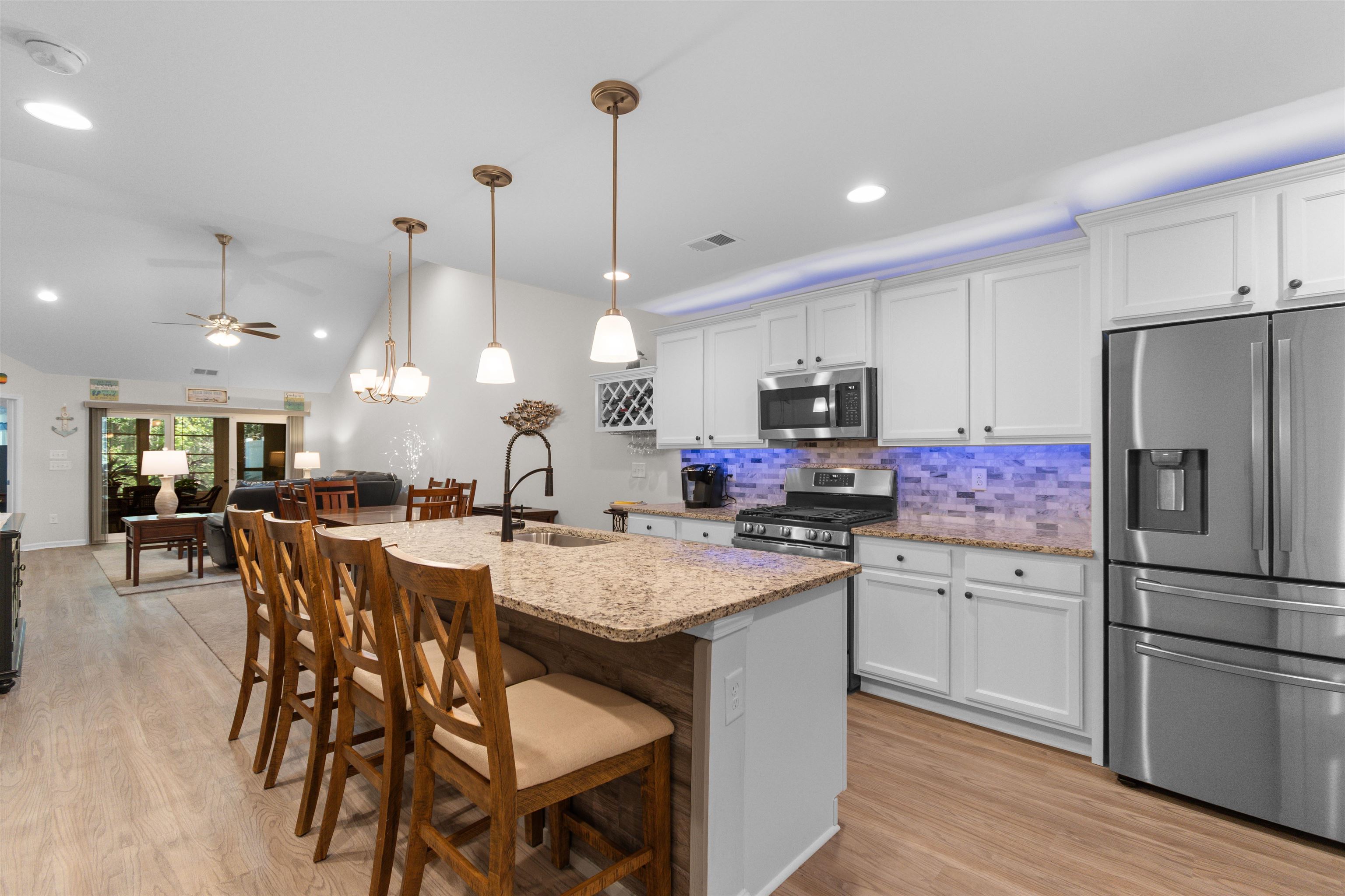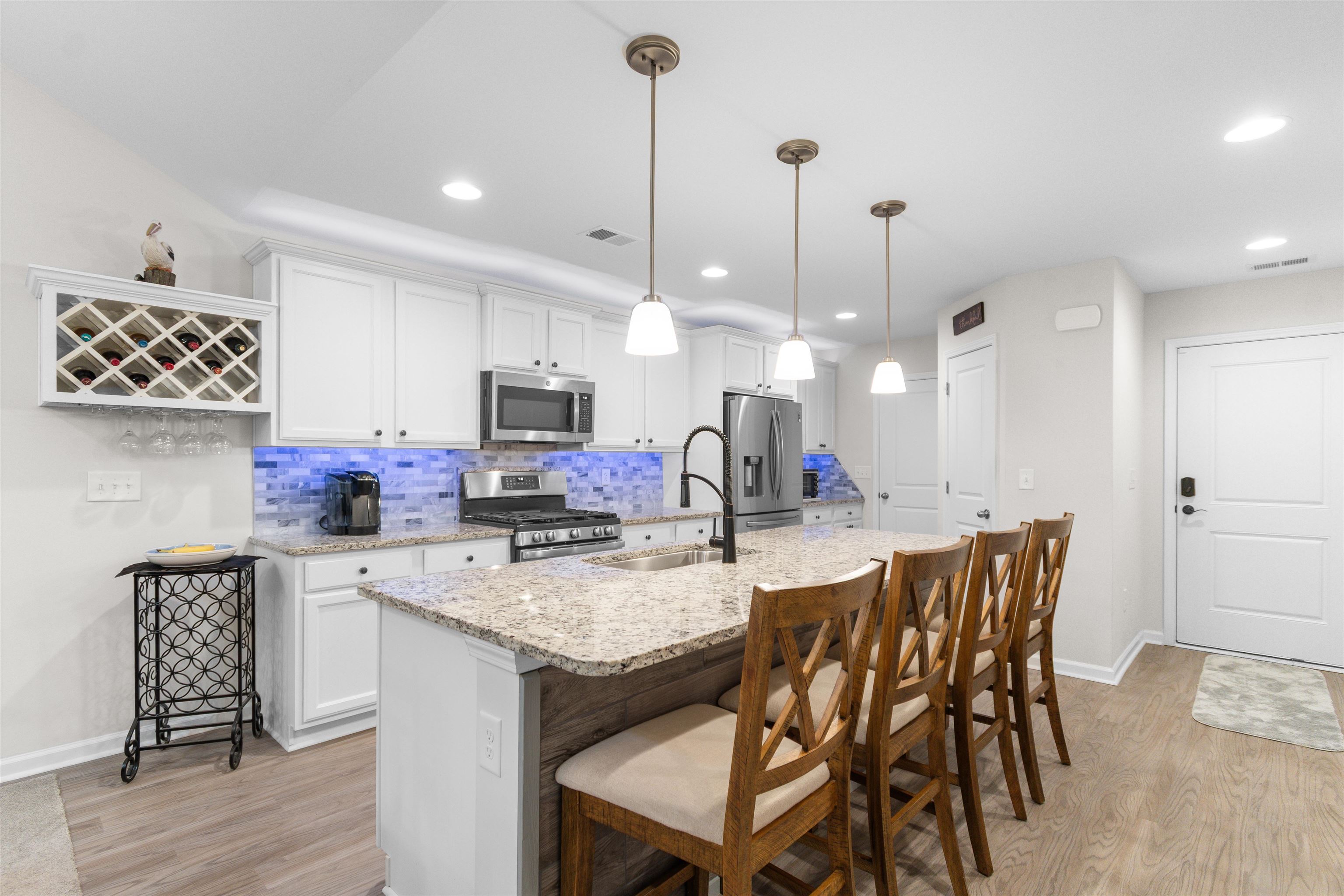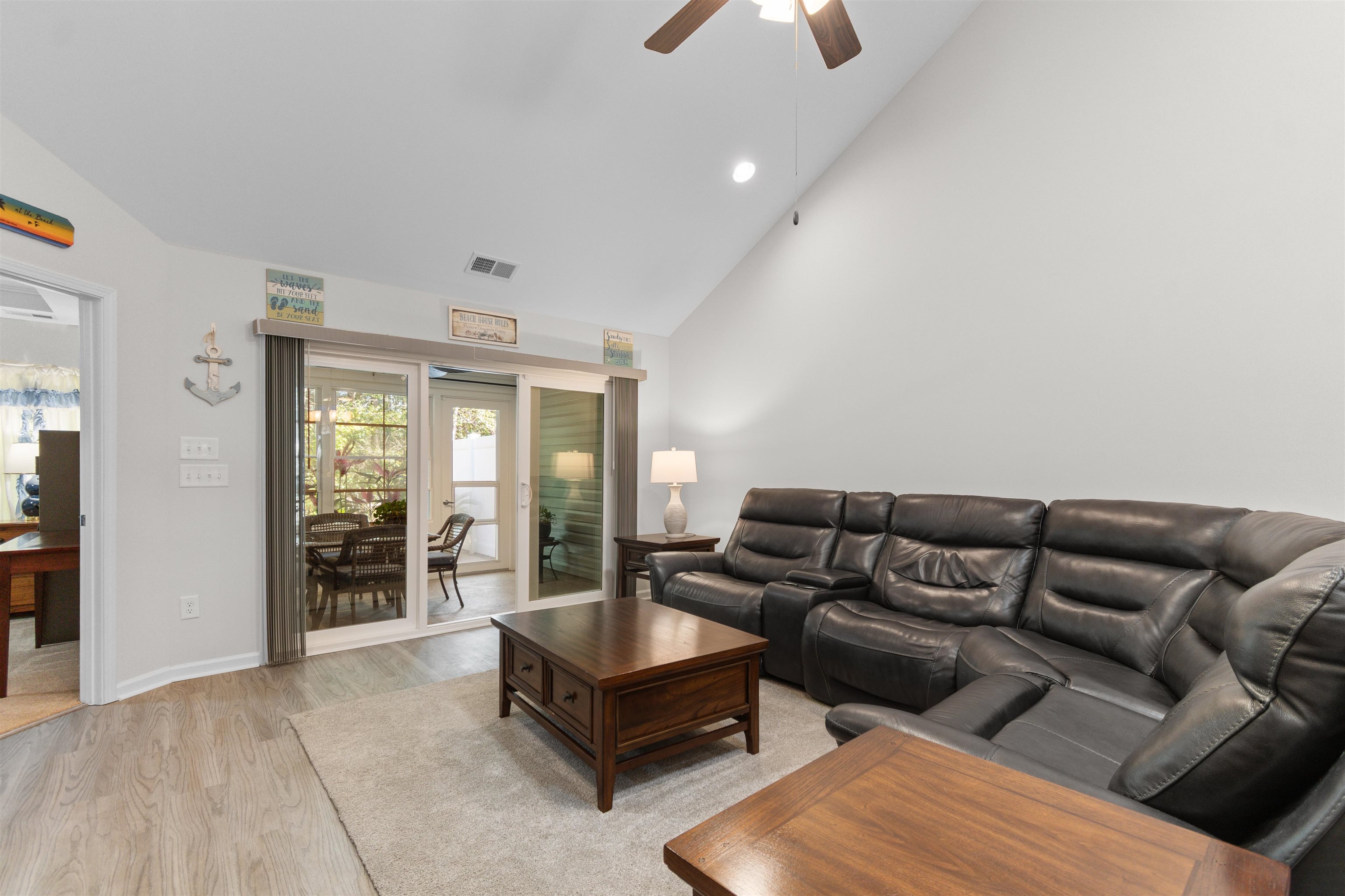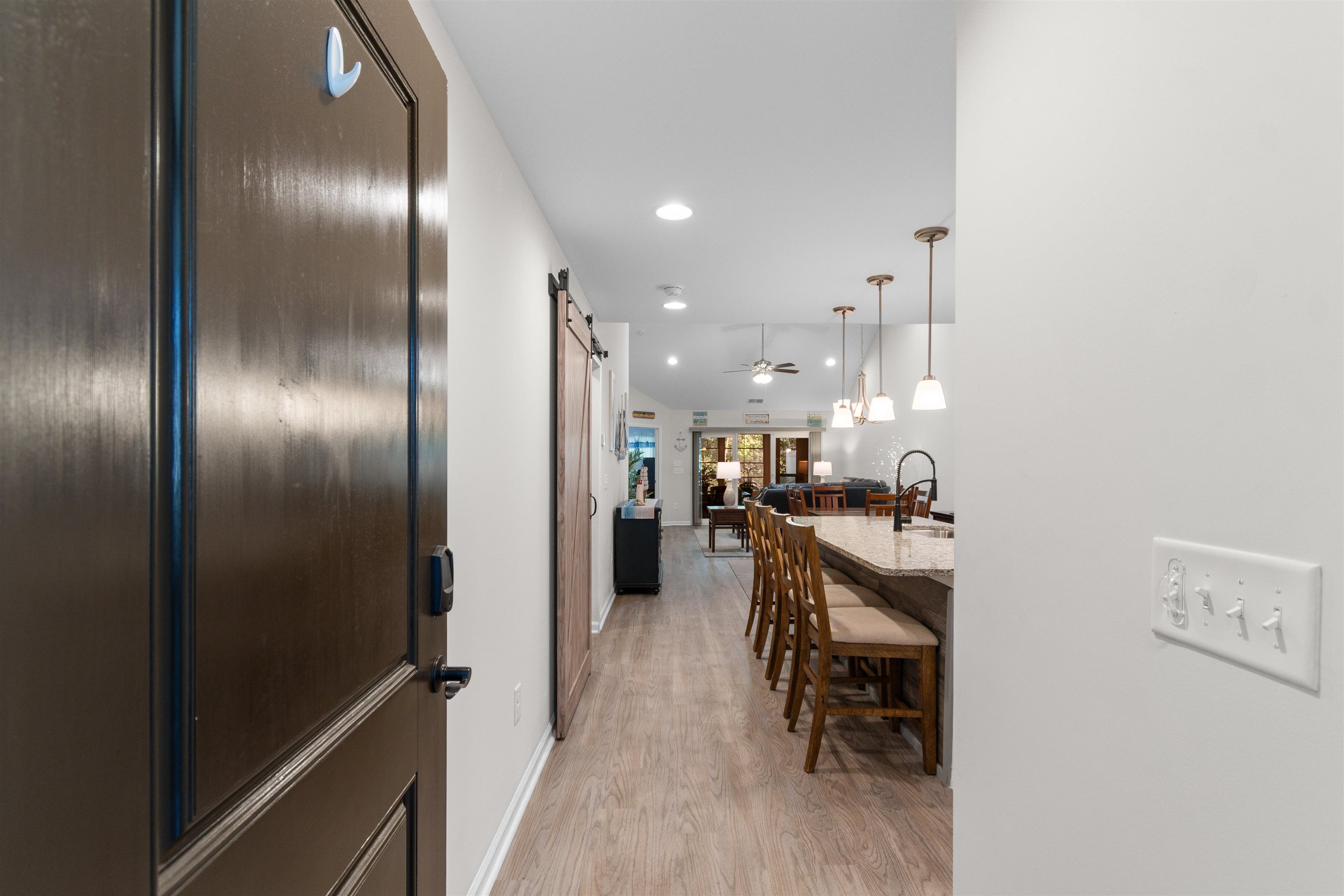 This beautifully maintained 3-bedroom, 2-bath ranch style end-unit townhome in Palm Lakes Garden Homes feels much larger than its square footage suggests! The open floor plan features vaulted ceilings,a suntube, ceiling fans, luxury vinyl plank flooring, and brand-new carpet throughout. The kitchen is designed for both style and function with granite countertops, stainless steel appliances, a gas range, new pendant lighting, a sink in the oversized island, island stools, a pantry, and a built-in wine shelf. Just off the attached 2-car garage, the mud room includes the washer and dryer for added convenience. A charming barn door separates the guest bedrooms and second bath from the main living area, offering extra privacy. The spacious primary suite features a tray ceiling, decorative accent wall, and large picture window. The primary bath includes your closet, dual sinks, a linen closet and a large walk-in shower with etched glass doors. The home includes an enclosed Carolina Room and also a concrete patio out back. Being an end unit, you can enjoy the larger side yard! Residents enjoy access to the community pool and play area shared with Palm Lakes. Conveniently located just off Mt. Zion Road between Highways 57 and 90, this home is only minutes from North Myrtle Beach dining, shopping, entertainment, and the beach ''